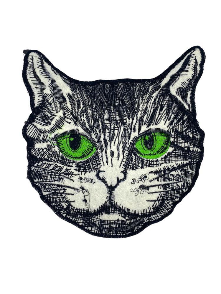 Embroidered Patch Featuring a Black-and-White Tabby Cat with Striking Green Eyes