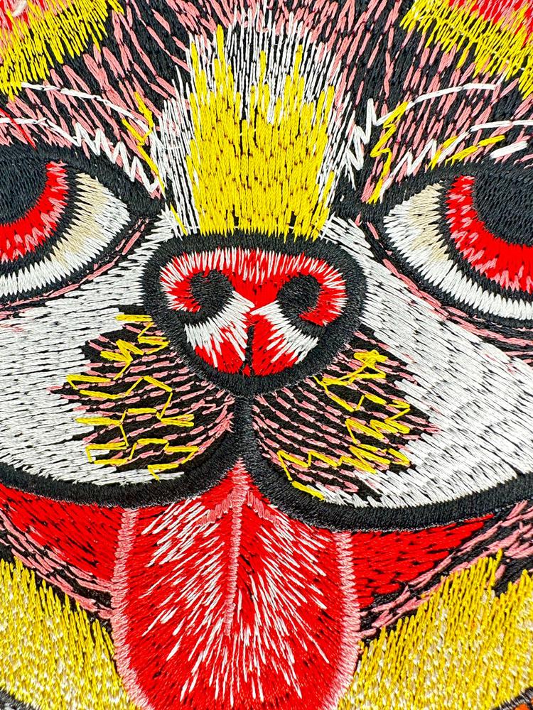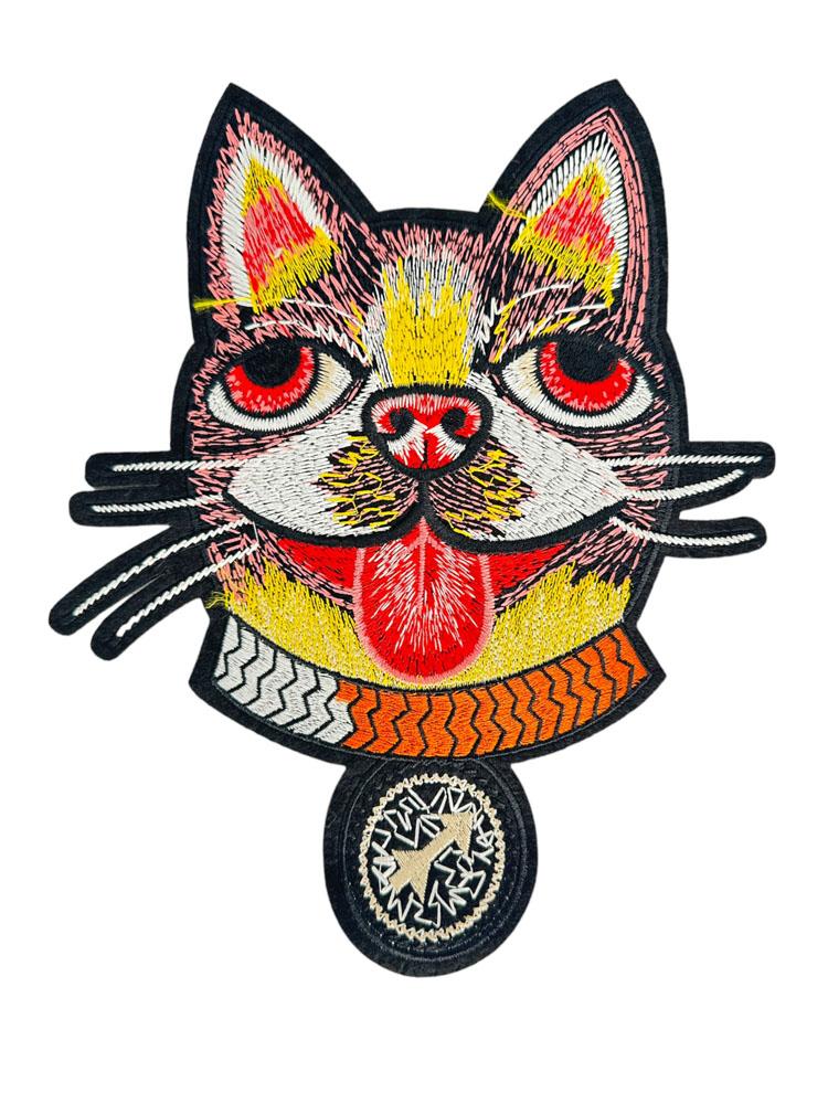 Embroidered Patch Featuring a Stylized Cat Face with Tongue Out and Bold Pendant