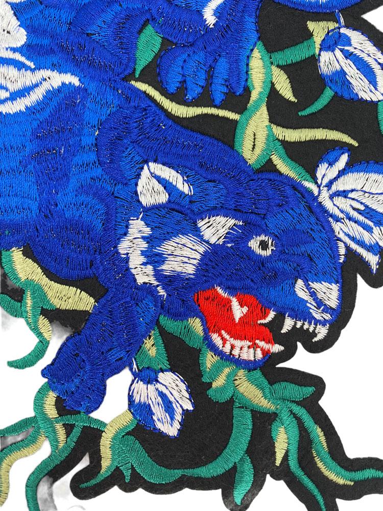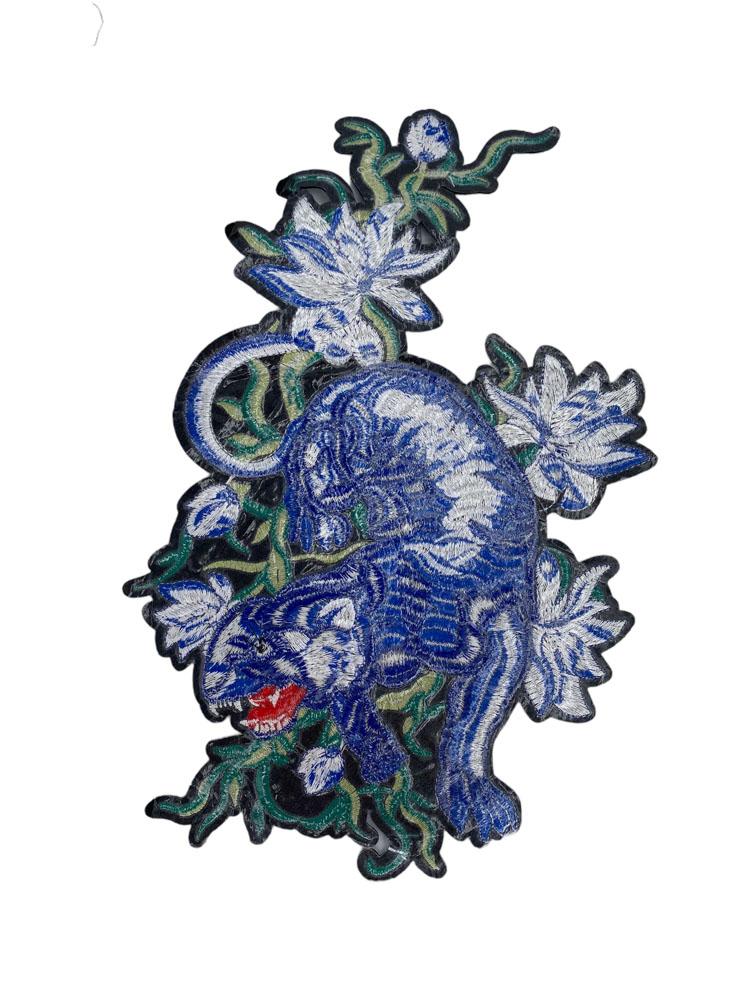 Embroidered Patch Featuring a Striking Blue Panther with Blooming Flowers