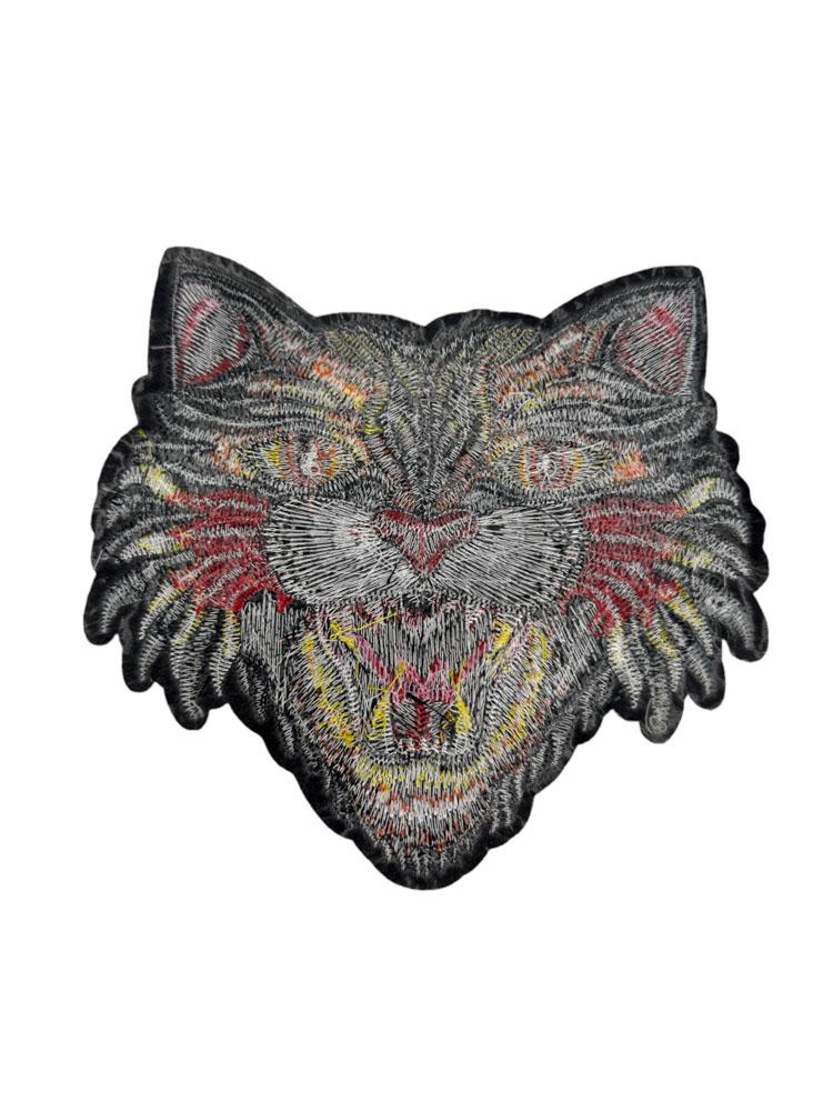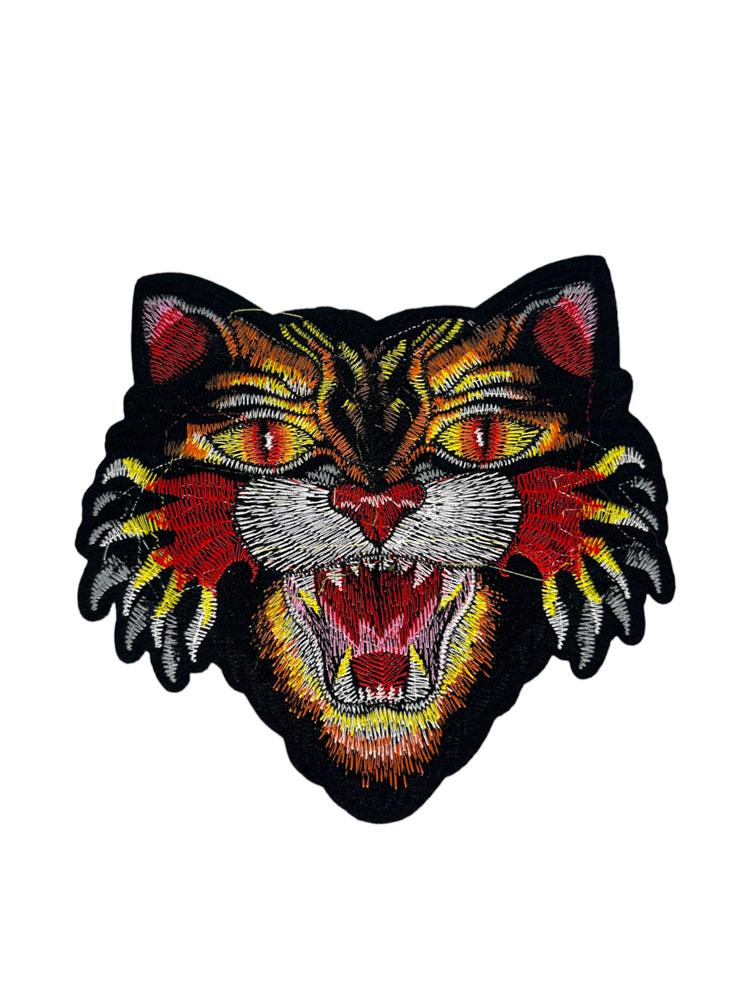 Embroidered Patch Featuring a Roaring Wildcat Face in Fiery Tones