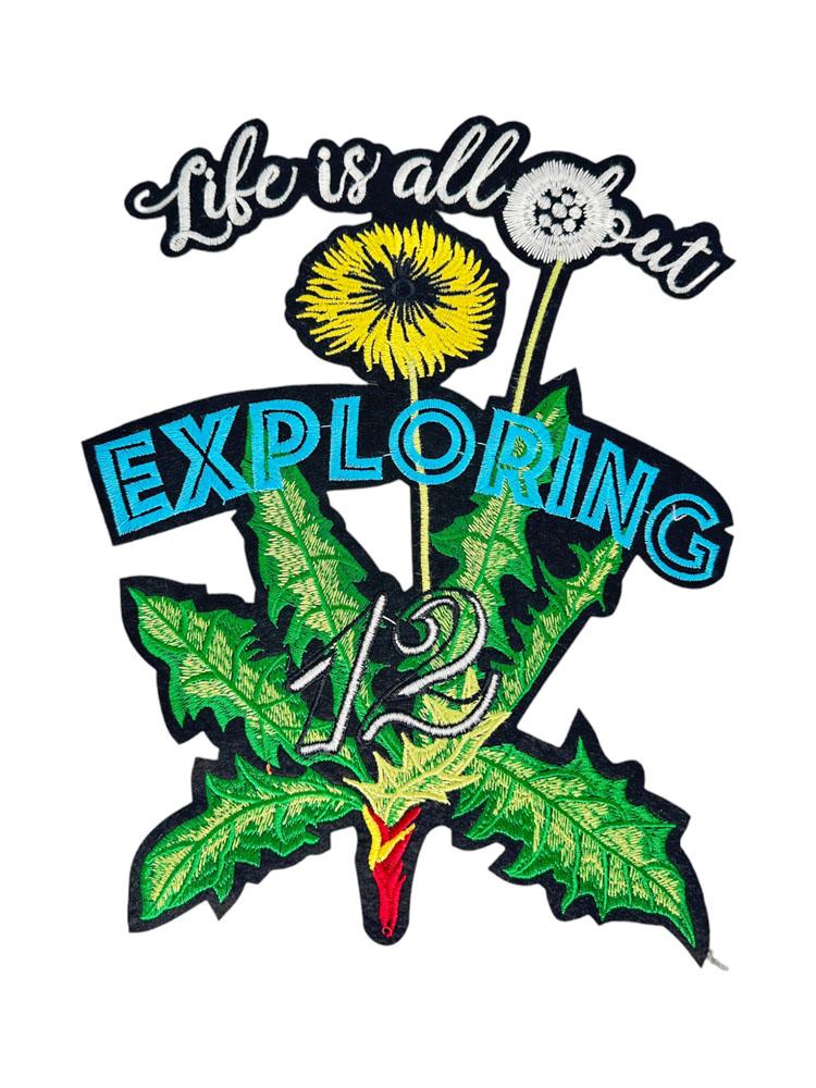 Embroidered Patch Featuring Dandelions, Leaves, and the Quote “Life is All About Exploring”