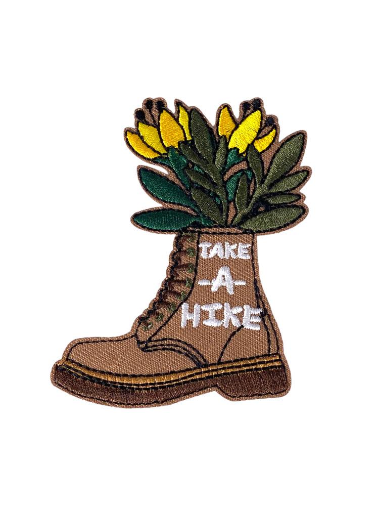 Step out in floral flair with the Take a Hike Patch, a playful and nature-loving embroidered design featuring a sturdy brown hiking boot bursting with bright yellow tulips and greenery. The words “TAKE A HIKE” are stitched boldly across the side, delivering a perfect mix of encouragement and cheeky attitude.