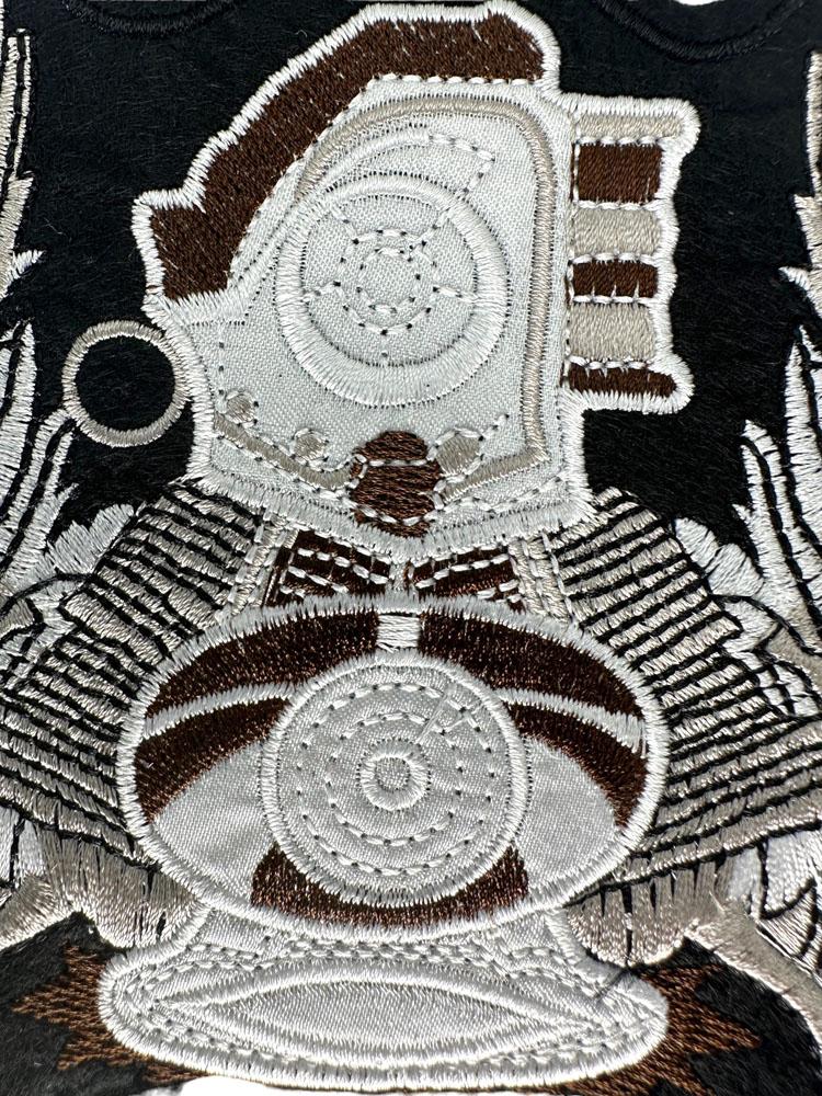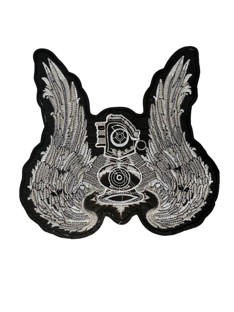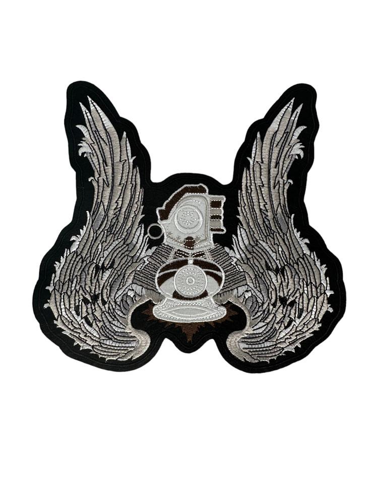 Embroidered Patch Featuring Industrial Piston and Gear with Silver Angel Wings
