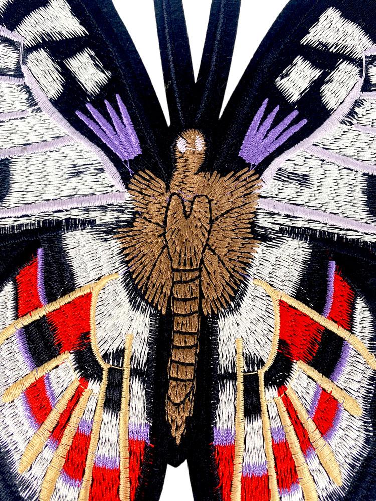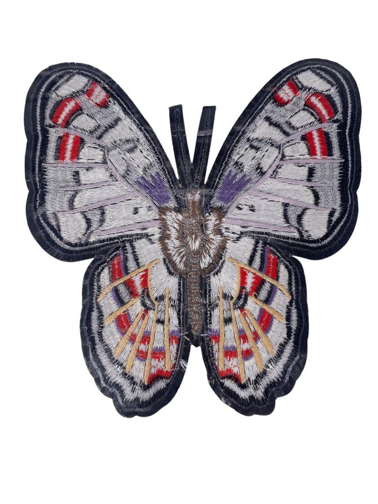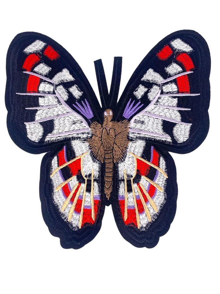 Embroidered Patch Featuring a Stylized Butterfly in Navy, Red, White, and Lavender