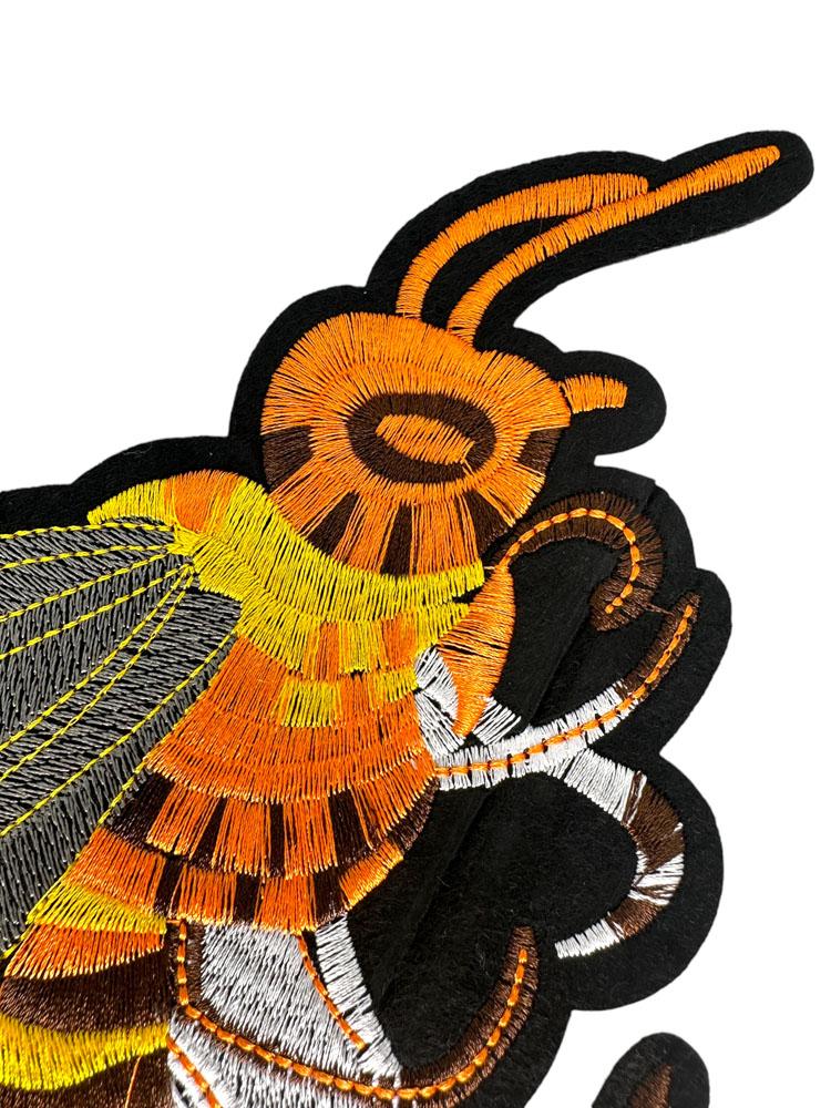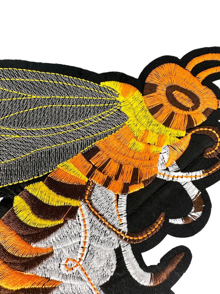 Highly detailed wasp body with layered black, yellow, and orange stitching