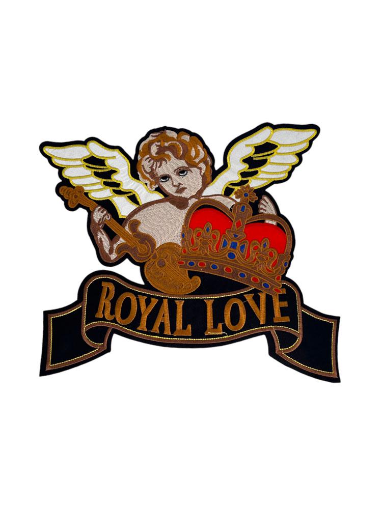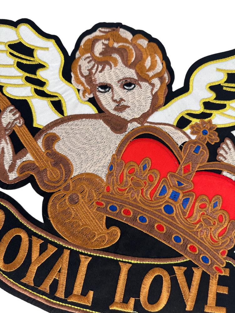 Embroidered Patch Featuring a Winged Cherub Holding a Heart with “Royal Love” Banner