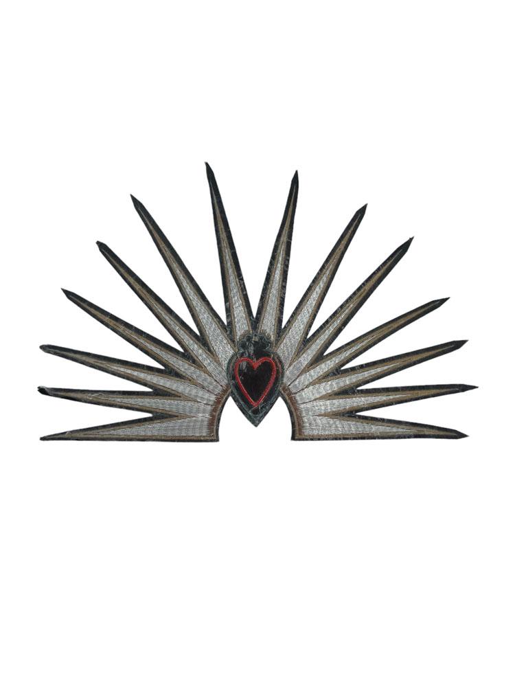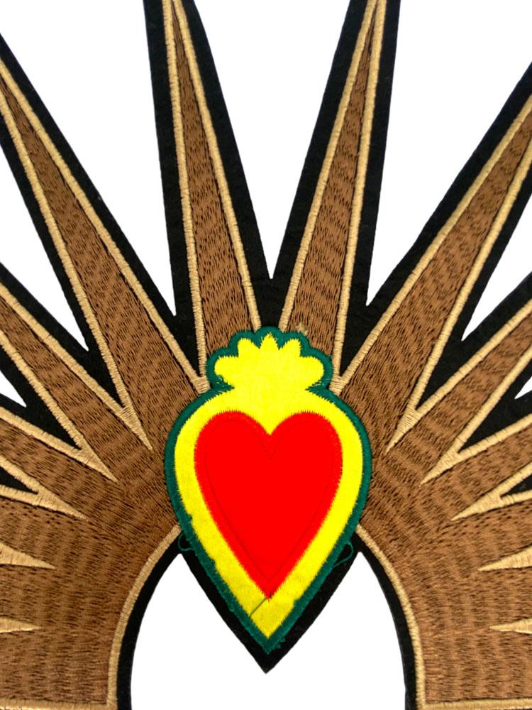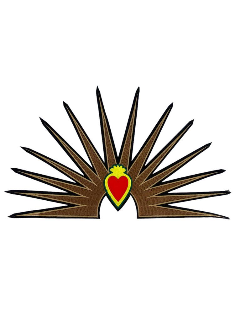 Embroidered Patch Featuring a Fiery Red Sacred Heart with Radiating Black and Brown Spikes