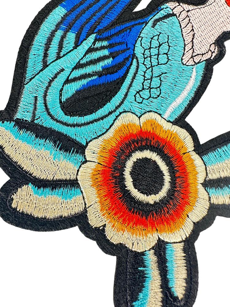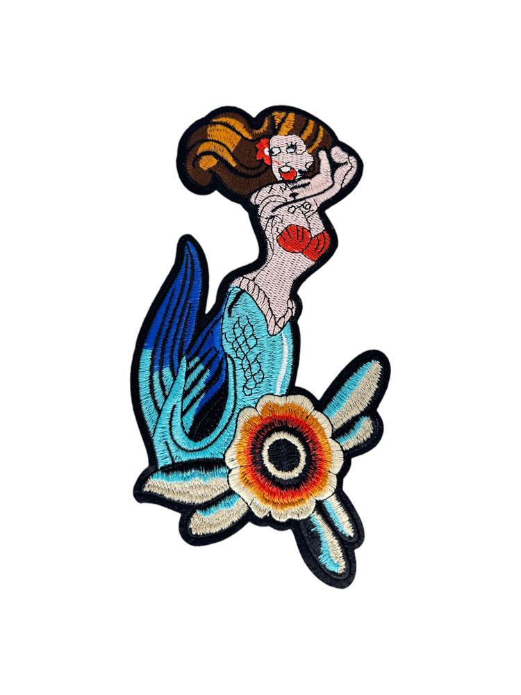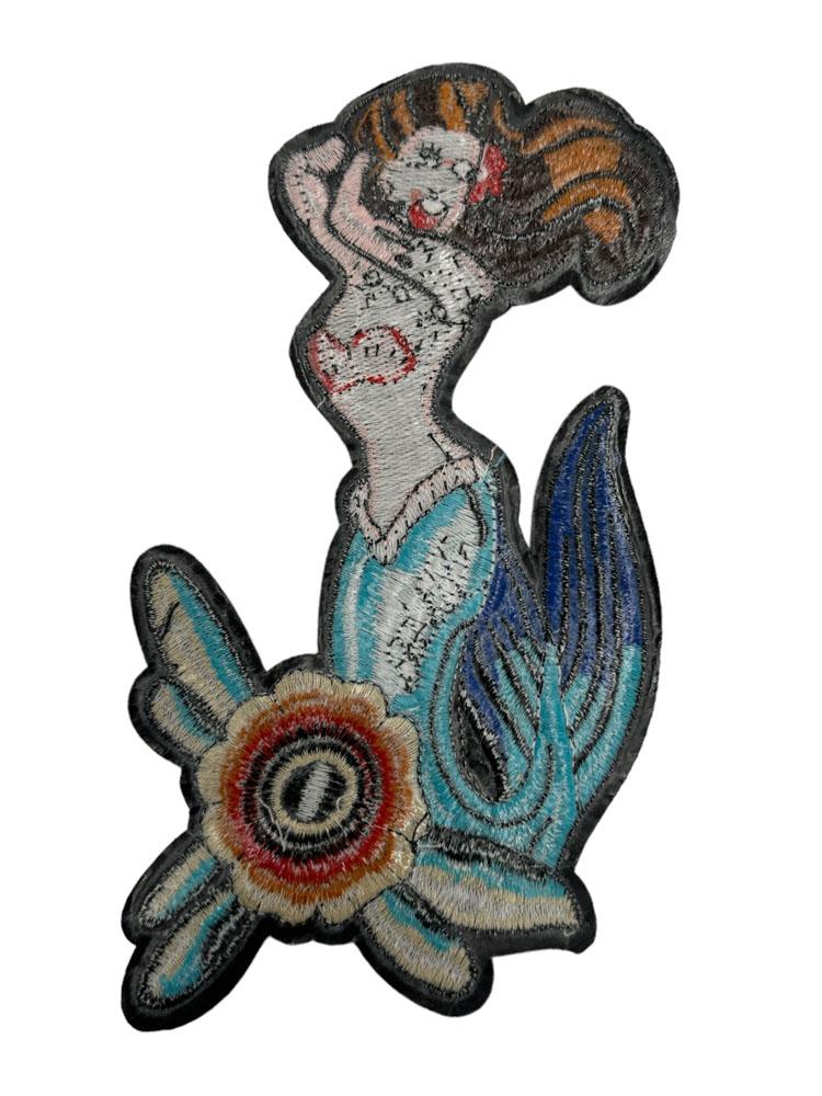 Embroidered Patch Featuring a Retro-Style Mermaid with Blue Tail and Flower Accent