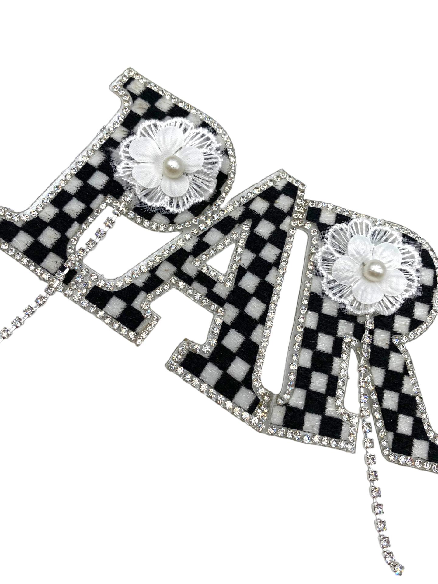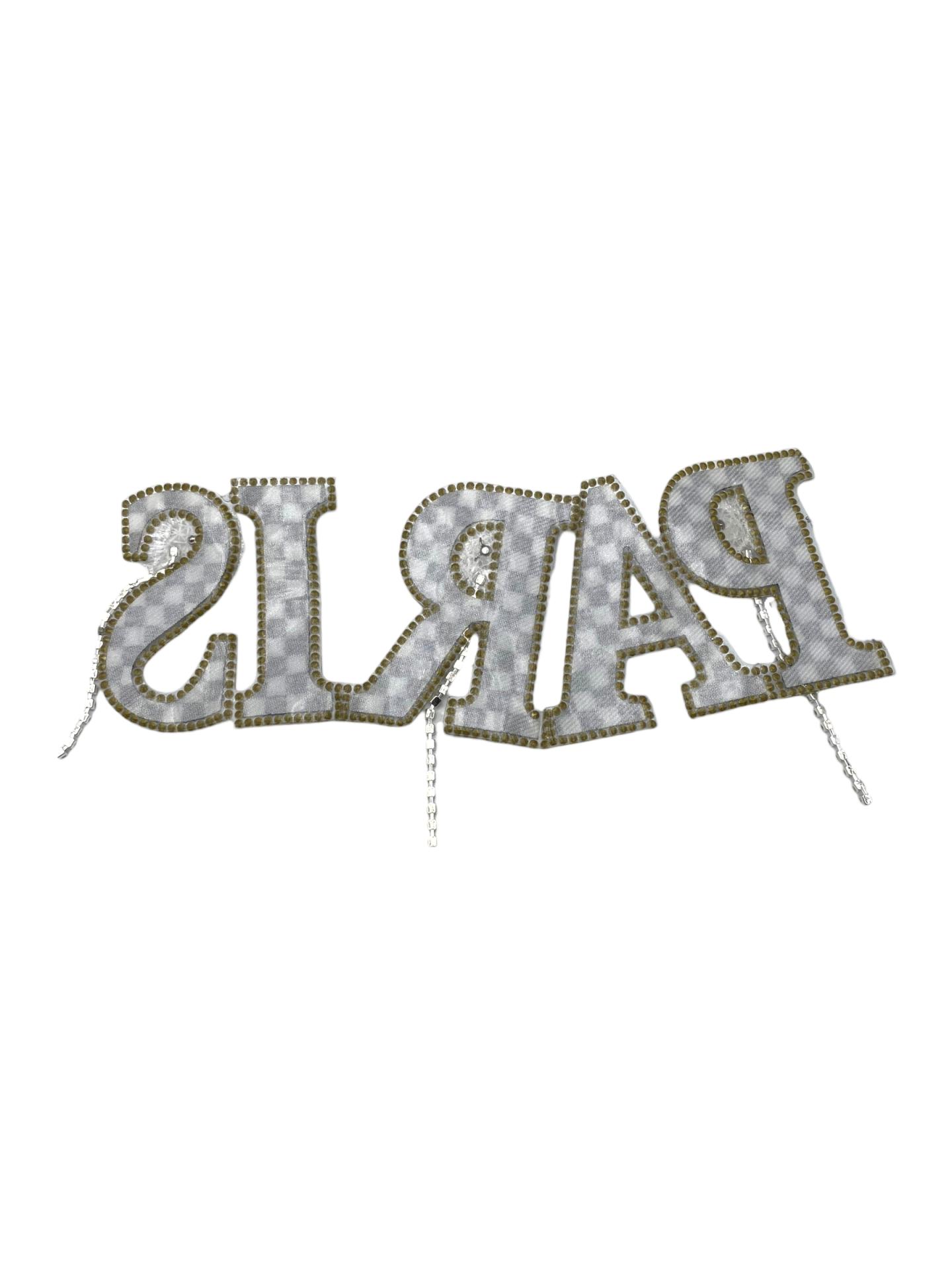Embroidered Patch Featuring “PARIS” in Black & White Polka Dots with Oversized Crystal Accents