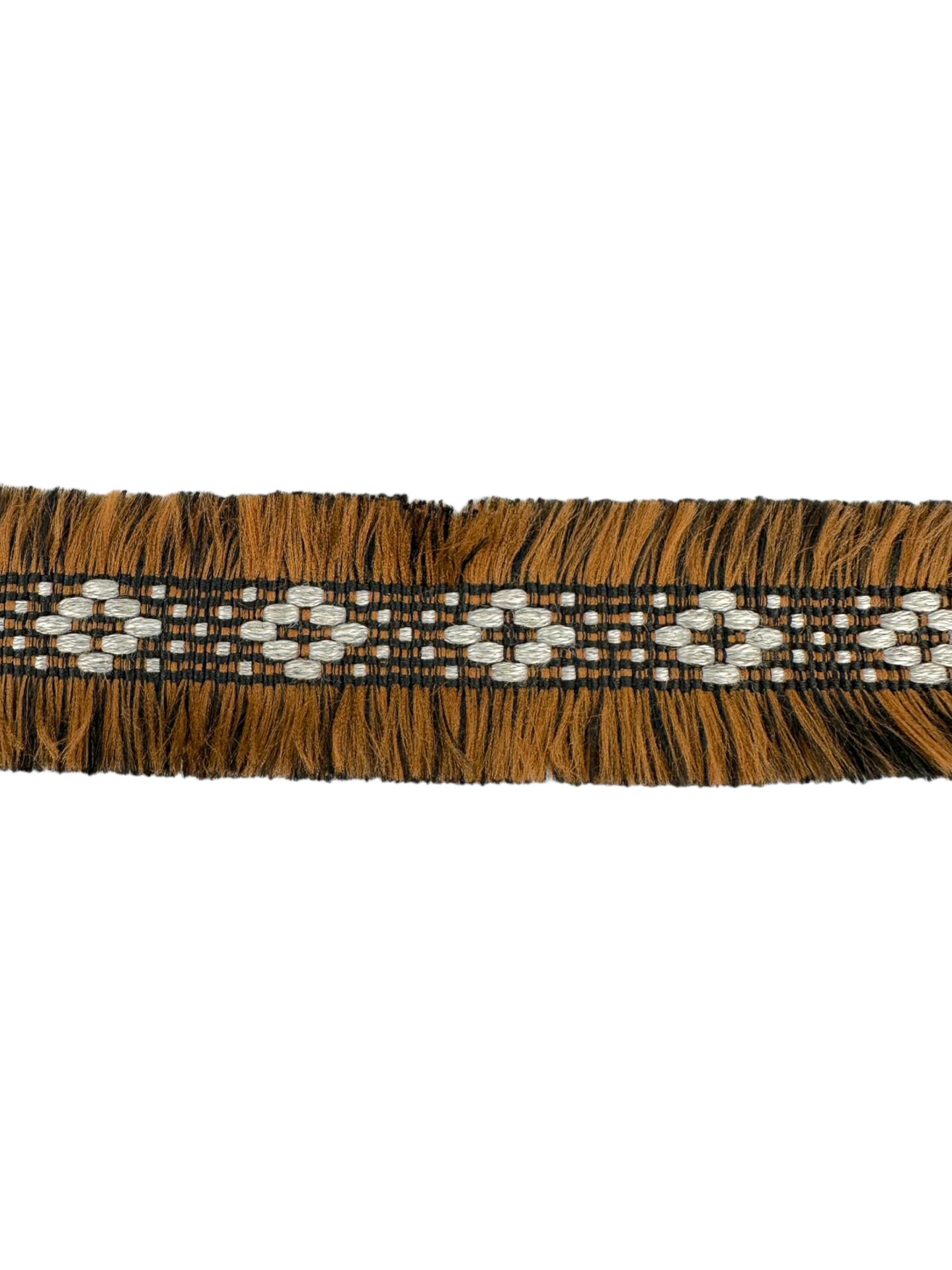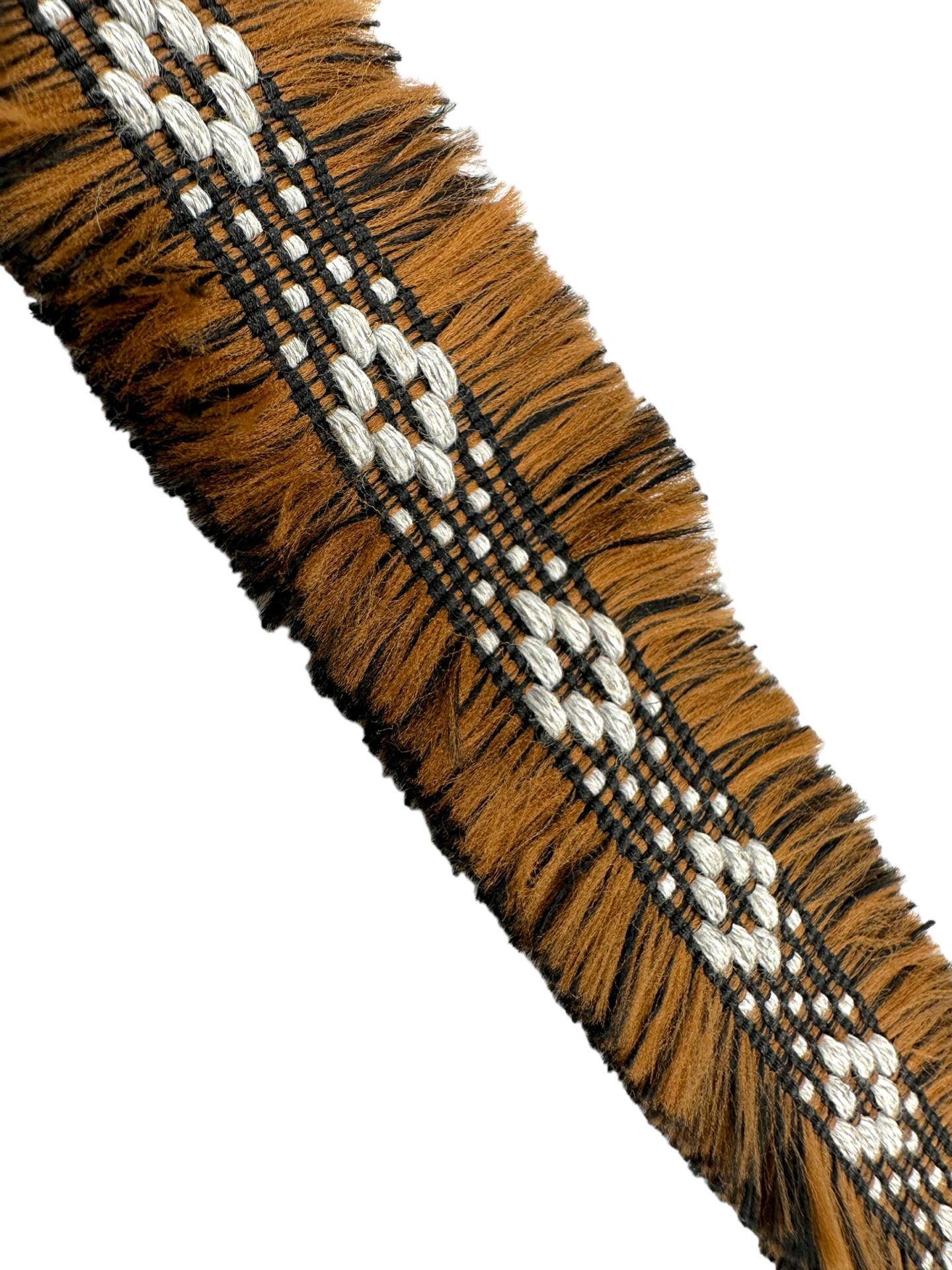 Bring a touch of artisanal flair to your creations with the Arabesque Fringe Braid, a richly textured trim inspired by tribal patternwork and earthy palettes. A woven geometric band in cream and cocoa tones runs through the center, framed by a shaggy brown fringe that evokes hand-crafted heritage and boho energy.