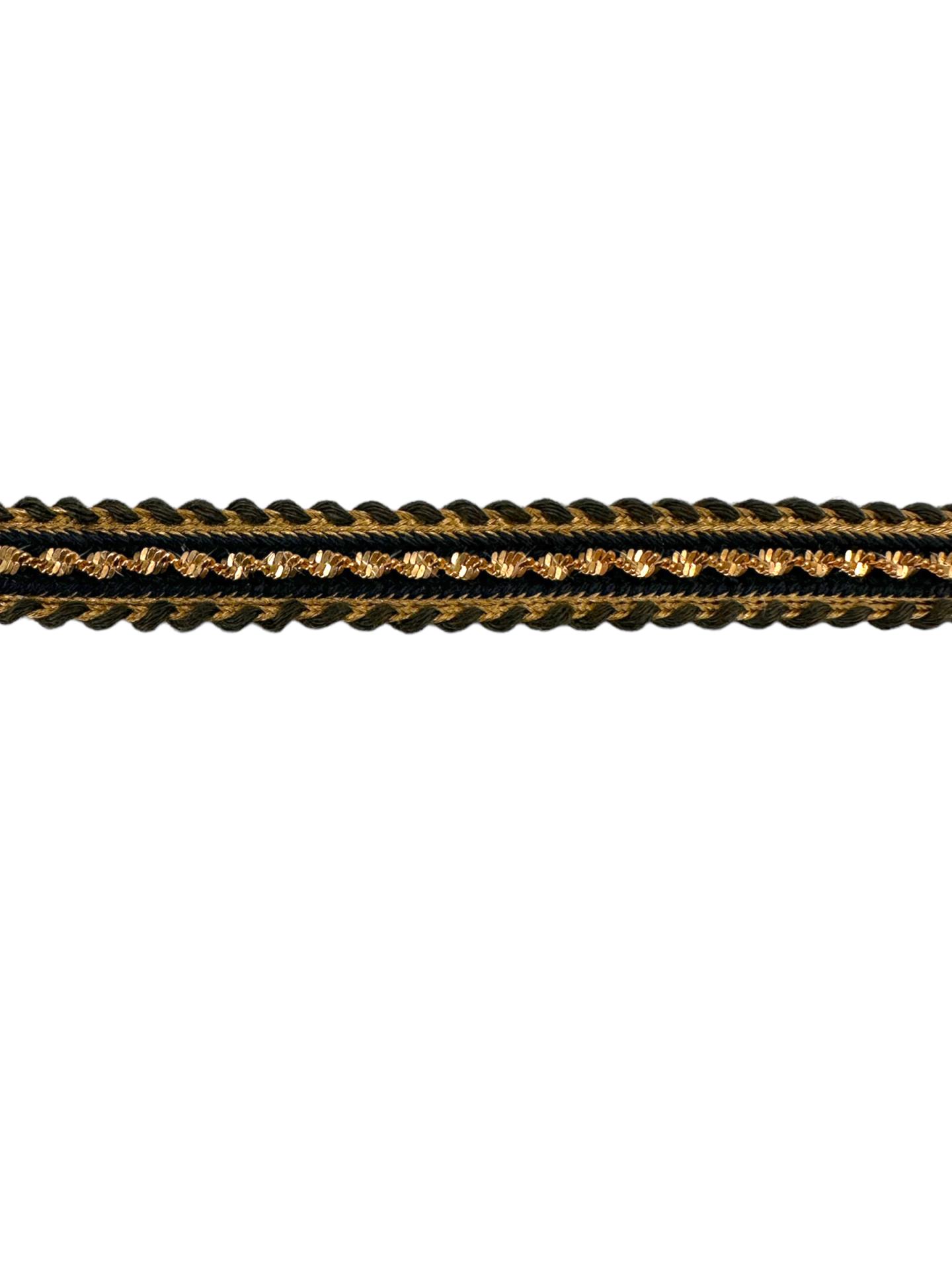 Add structure and sophistication to any project with the Gilded Twist Braid, a tightly coiled trim that brings classic refinement with a dramatic edge. This corded braid features alternating black and gold twisted strands, creating a high-contrast, dimensional look that feels both regal and tailored.