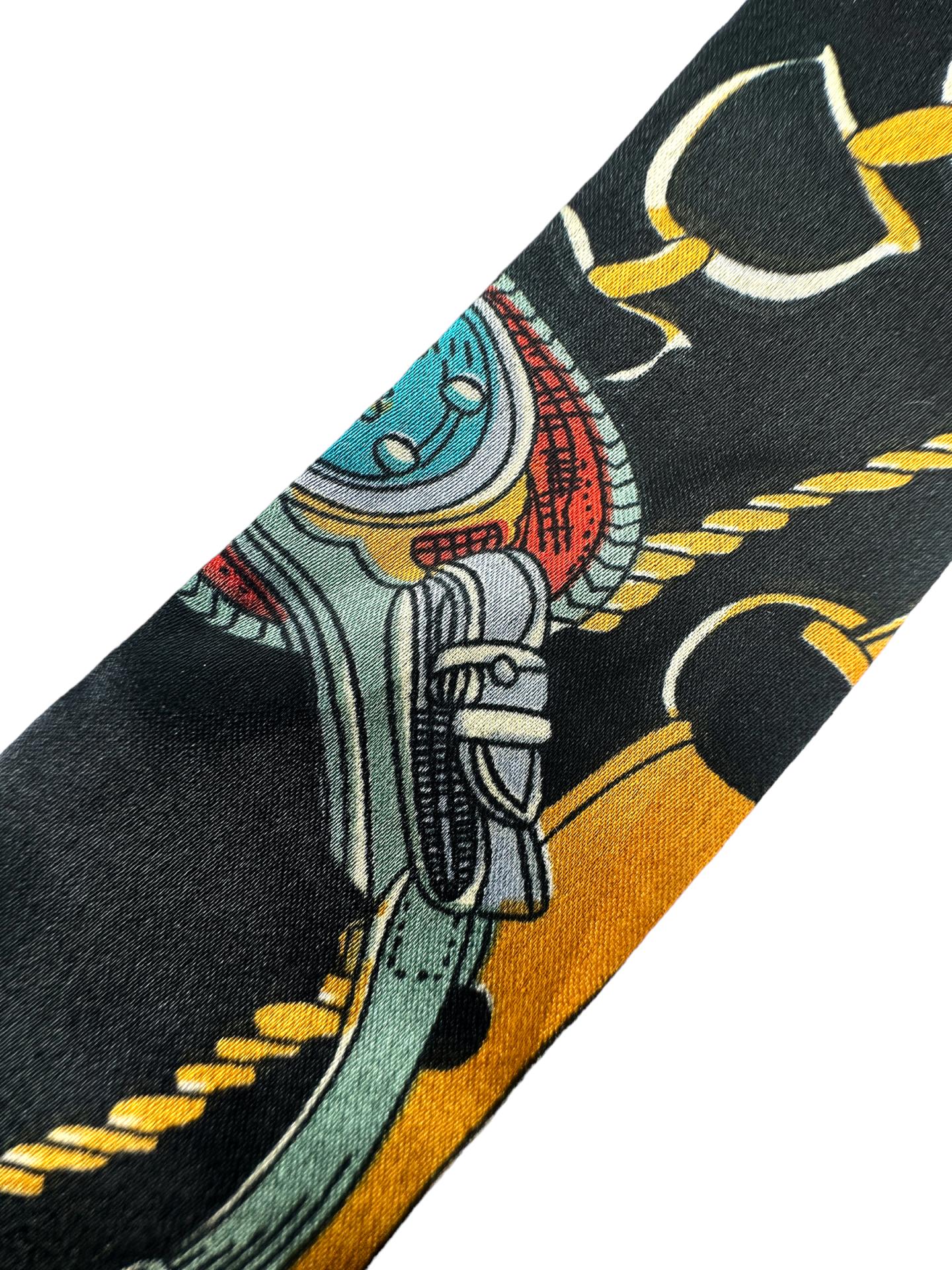 Elevate your look with a touch of nocturnal elegance in the Ink Scarf, a dramatic twilly that pairs inky black depth with vibrant, hand-drawn motifs. Inspired by classic equestrian chains and calligraphic flourishes, the design features rich golds, teals, and rust tones dancing across the dark satin canvas—like sketches illuminated by candlelight.
