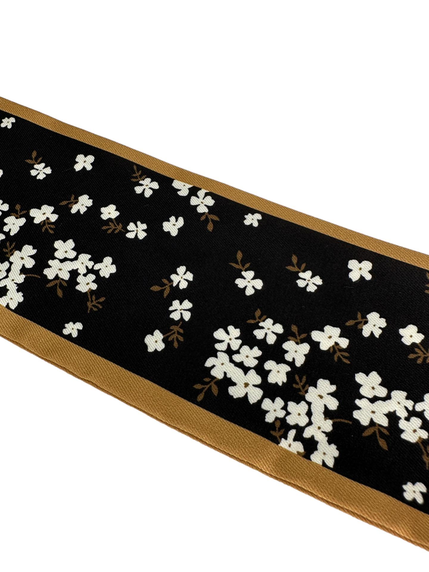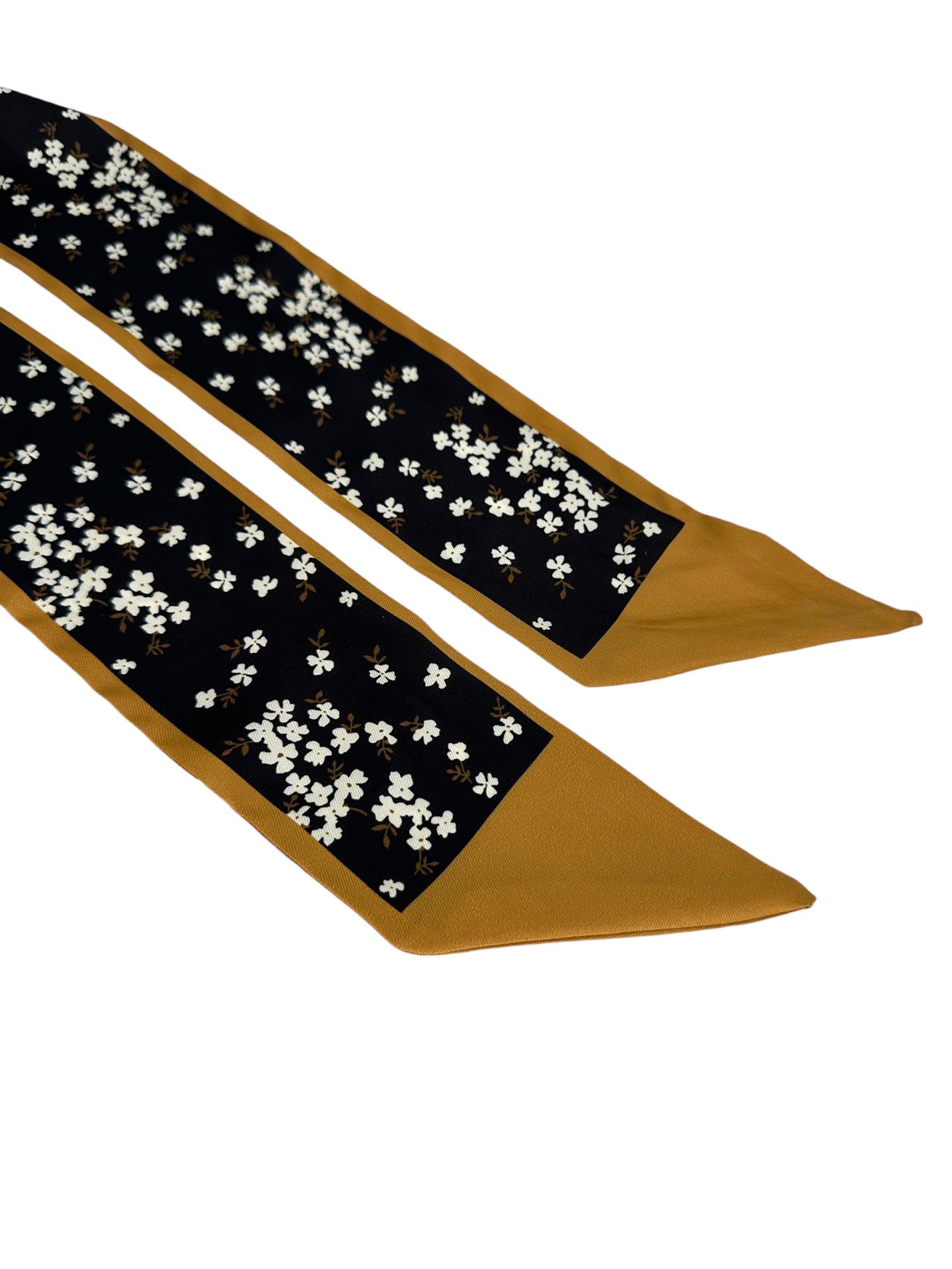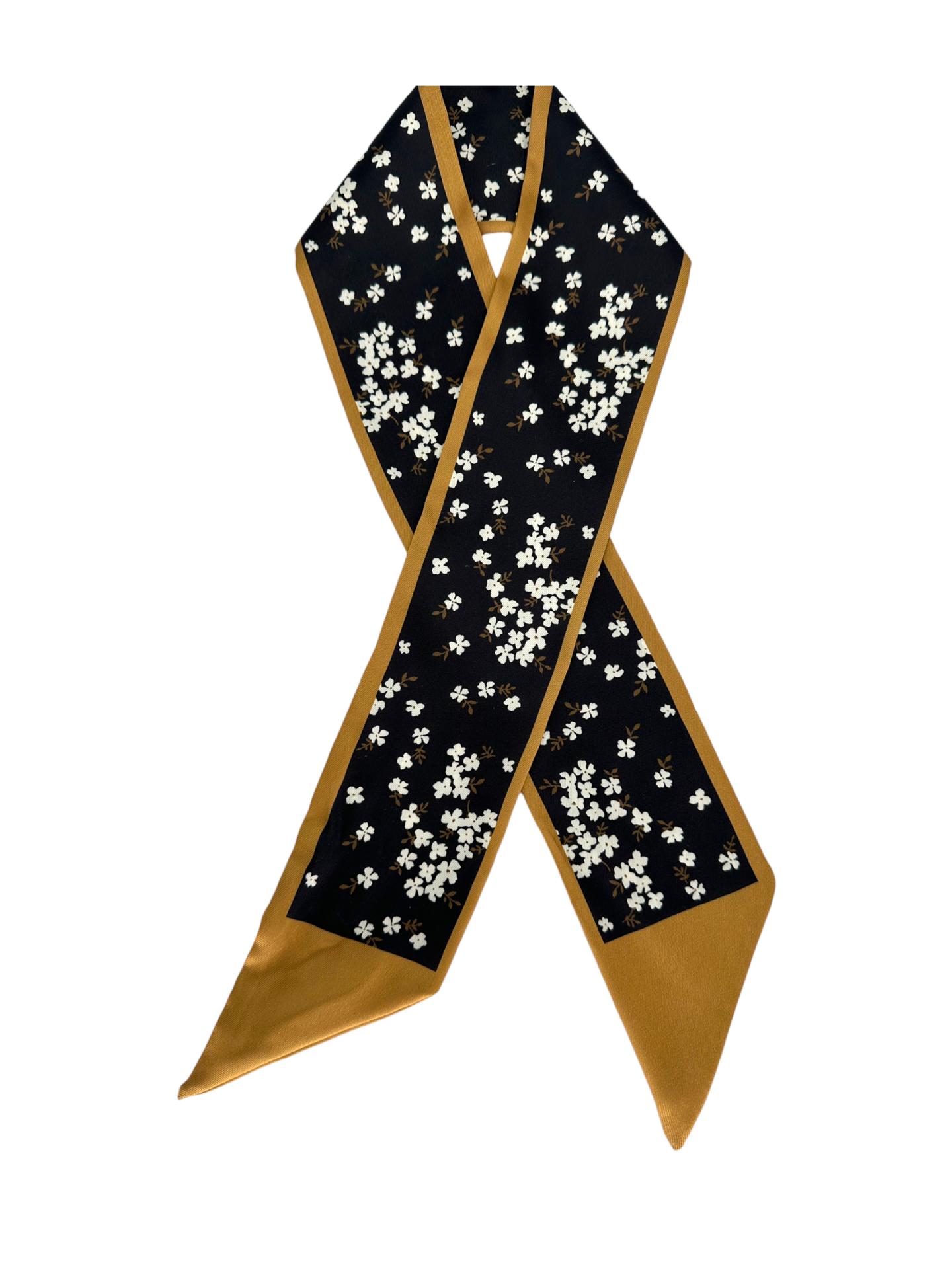 Step into the season of renewal with the Spring Scarf, a delicate twilly adorned in a flurry of tiny white blossoms that feel as though they’re drifting on a midnight breeze. Set against a deep black backdrop and framed by a rich golden mustard border, this piece captures the poetic charm of springtime in bloom—elegant, uplifting, and endlessly wearable.