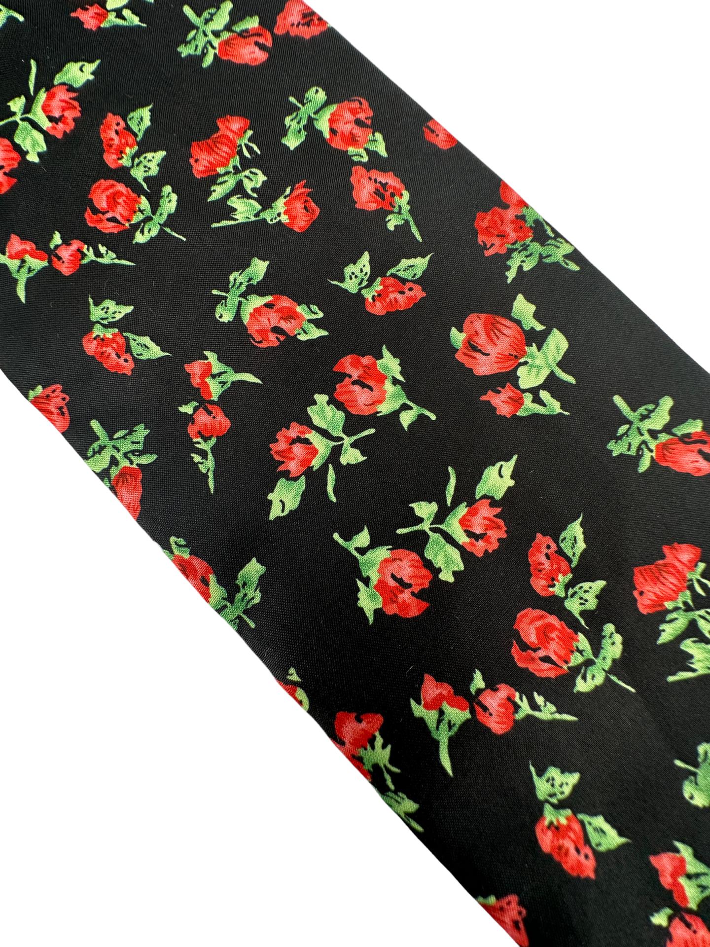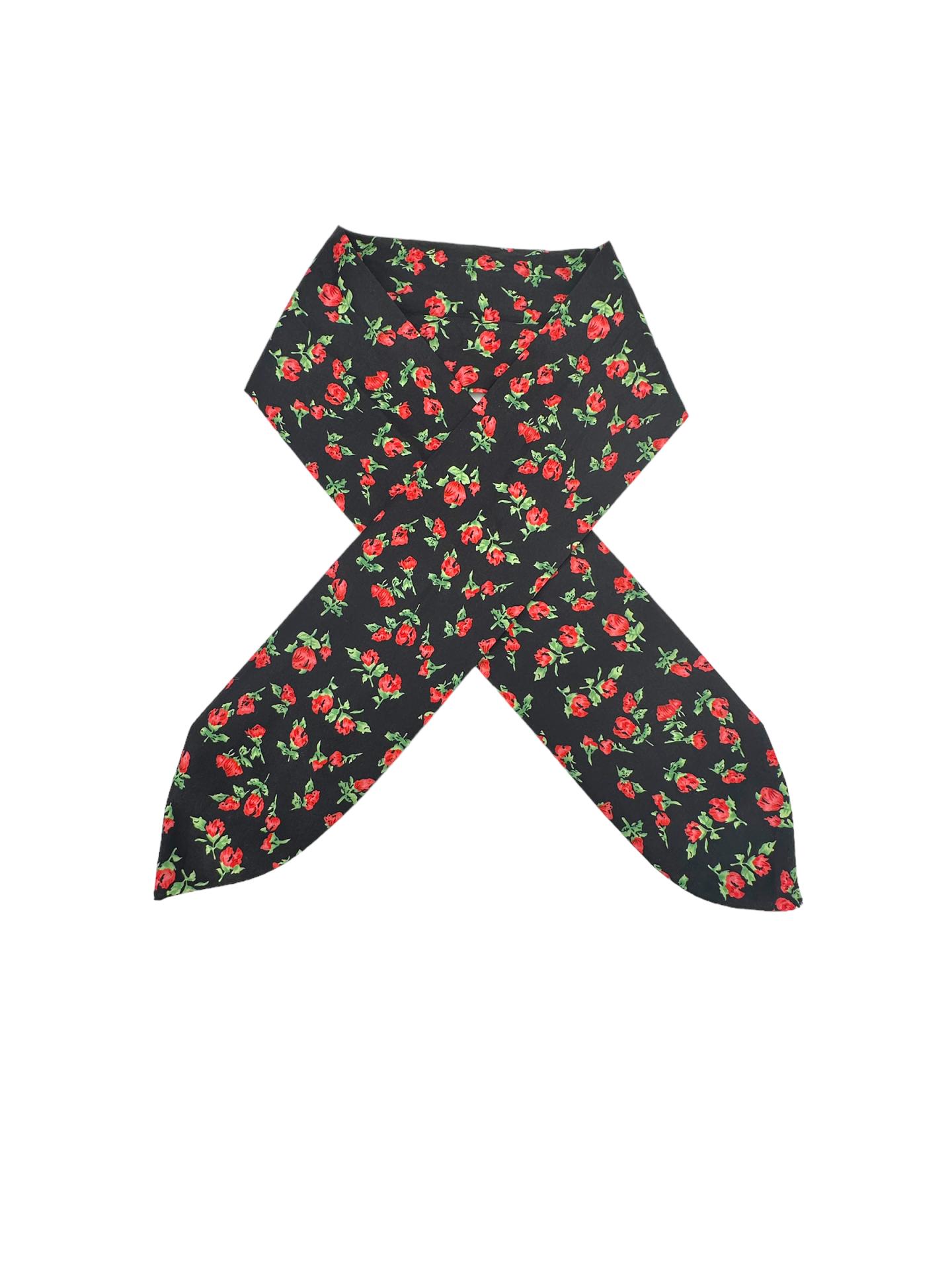 Soft, feminine, and endlessly charming, the Rose Scarf captures the classic beauty of red roses in full bloom. Set against a deep black background, the delicate floral pattern pops with vivid reds and gentle greens, creating a timeless romantic aesthetic. With its slim twilly shape and graceful drape, this scarf adds a poetic finish to any outfit.