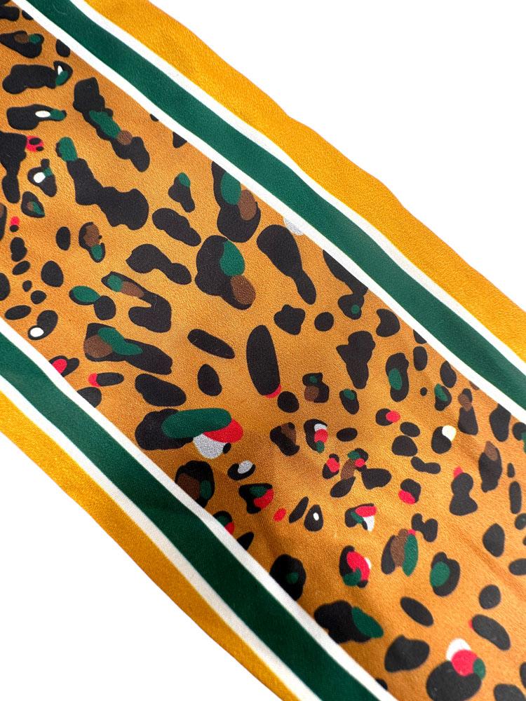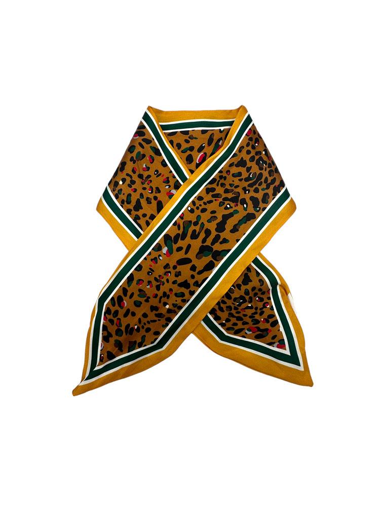 Strike with style in the Panther Scarf, a vibrant accessory that channels untamed elegance and bold confidence. Featuring a rich, golden leopard print framed by a mustard yellow border with green and white stripe accents, this twilly-style scarf is the ultimate blend of classic animal print and modern flair.