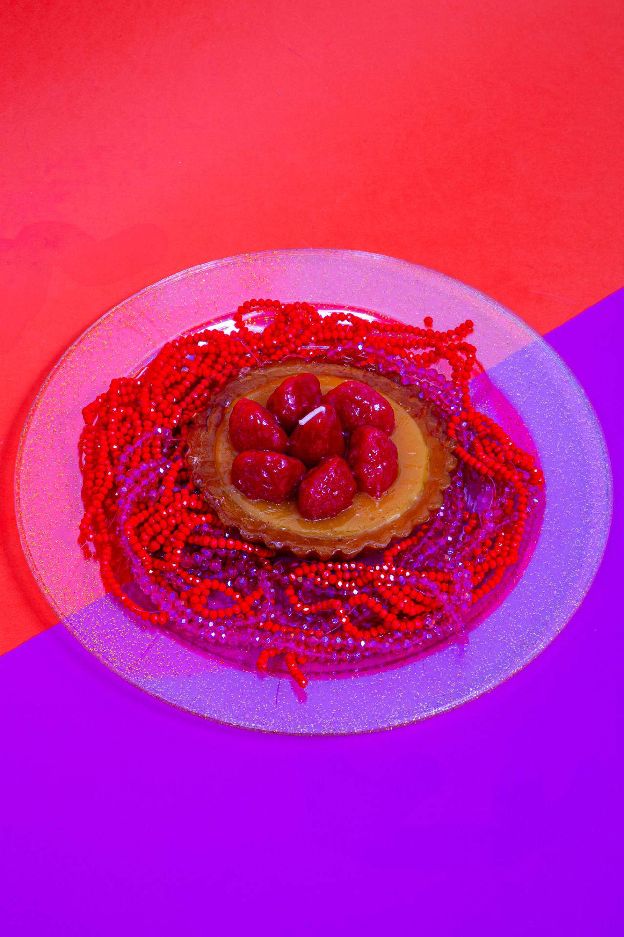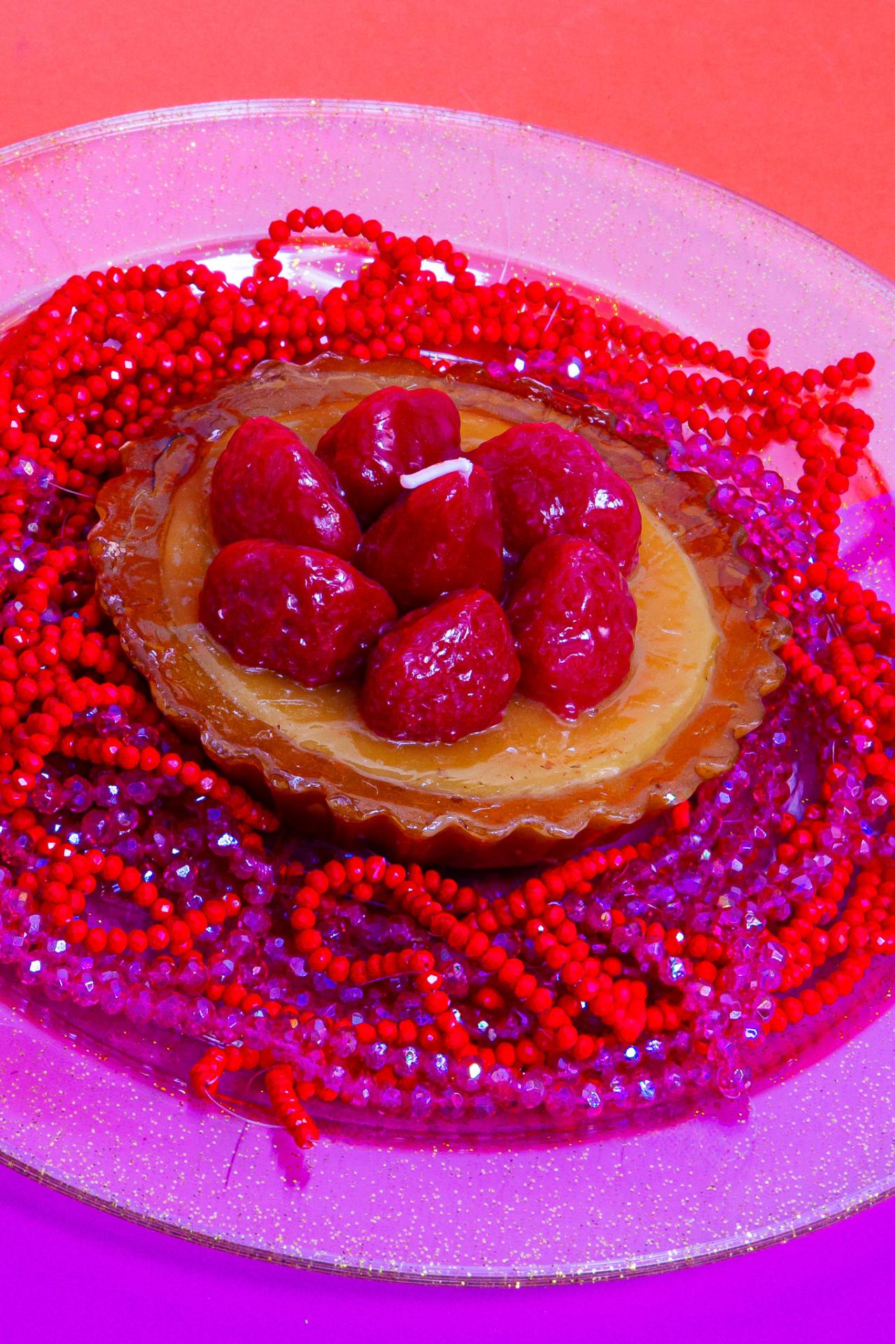 A realistic strawberry tart candle topped with glossy berries and a golden crust, sweet, decorative, and irresistible.