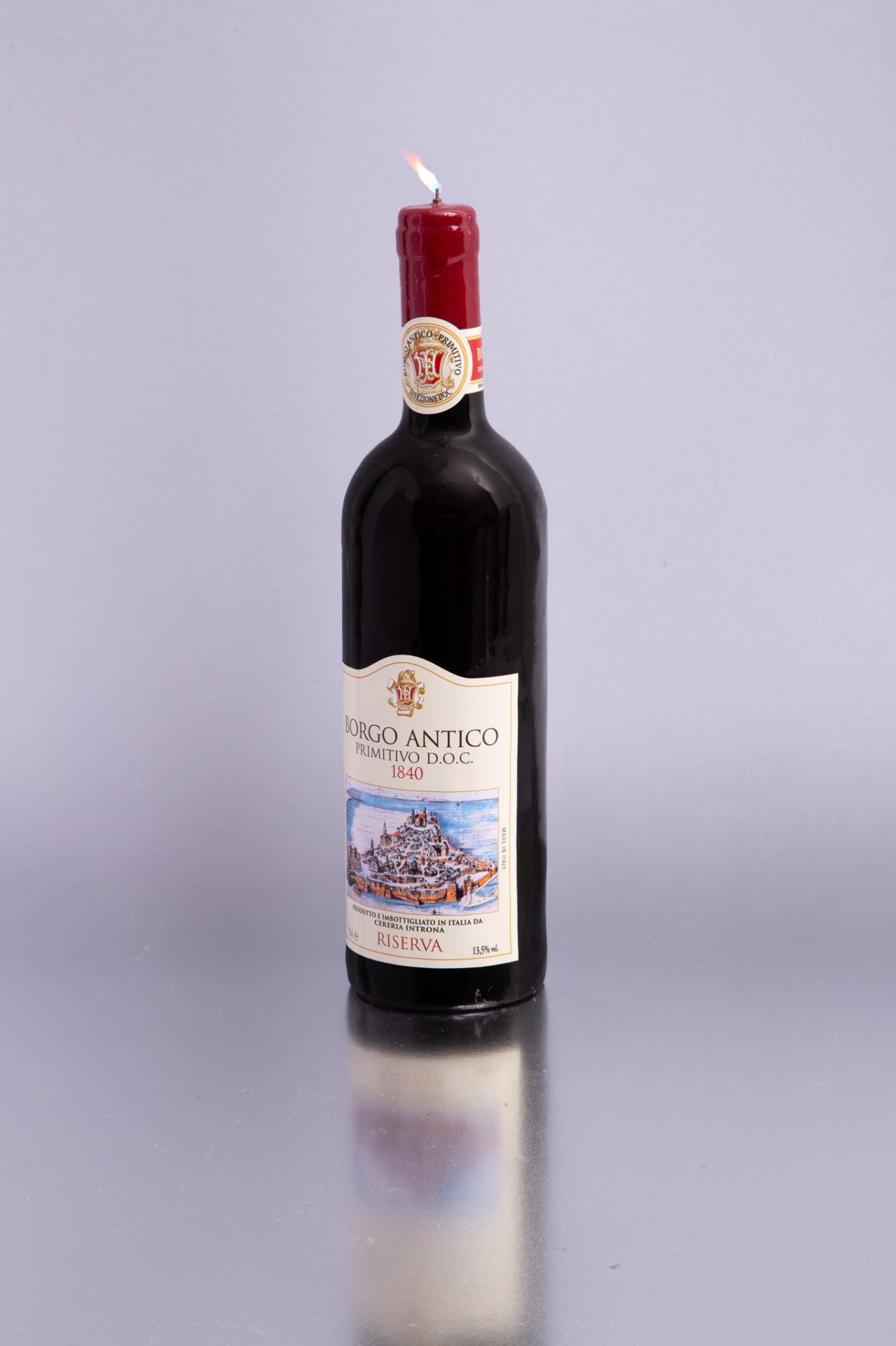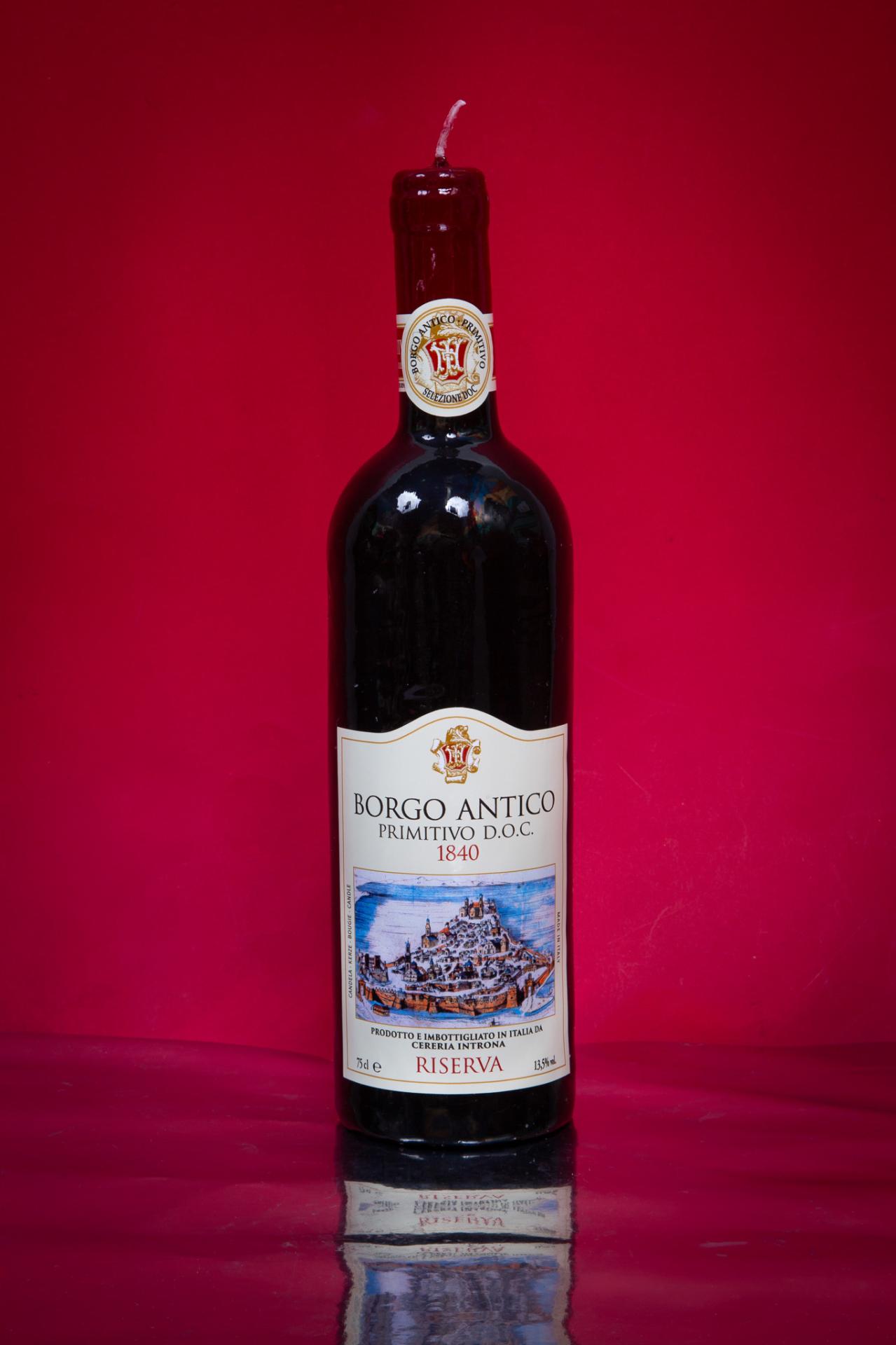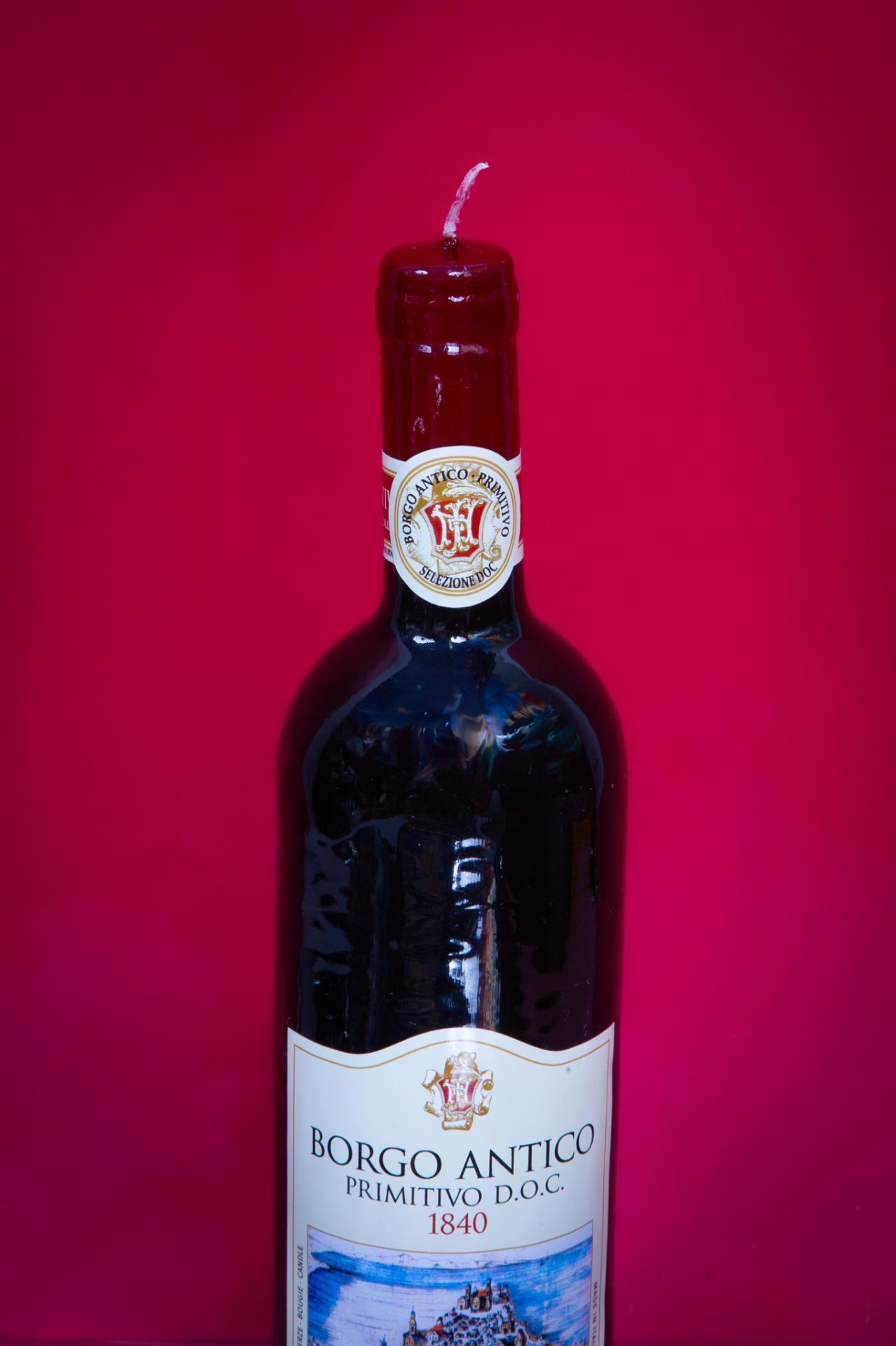 A hyper-realistic wine bottle candle designed to look like a fine Italian red, perfect as a quirky décor piece or a unique gift.