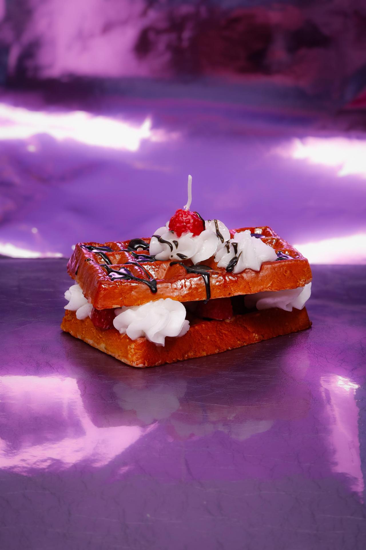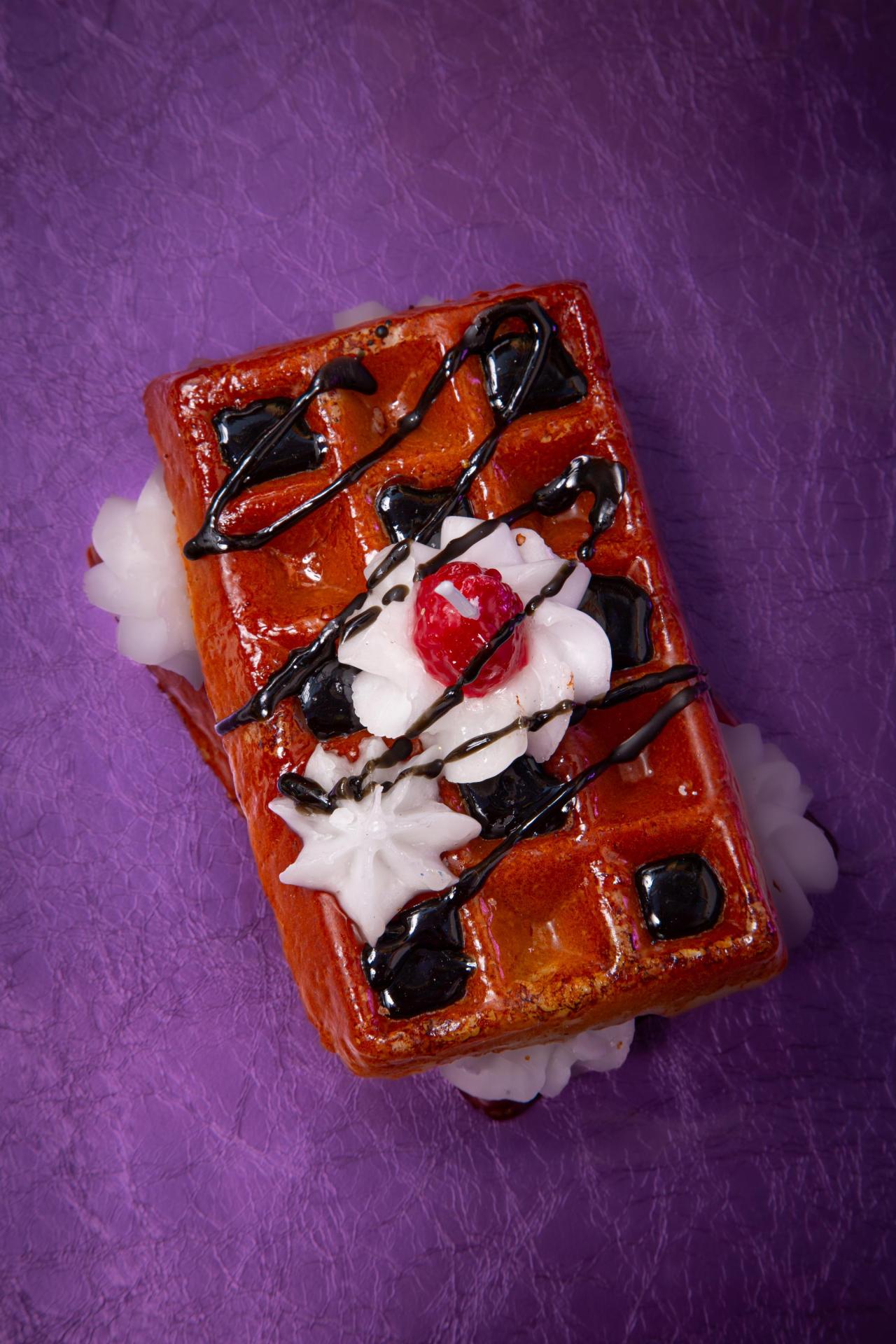 A deliciously realistic waffle-shaped candle topped with whipped cream, chocolate drizzle, and a cherry, perfect for sweetening any space.