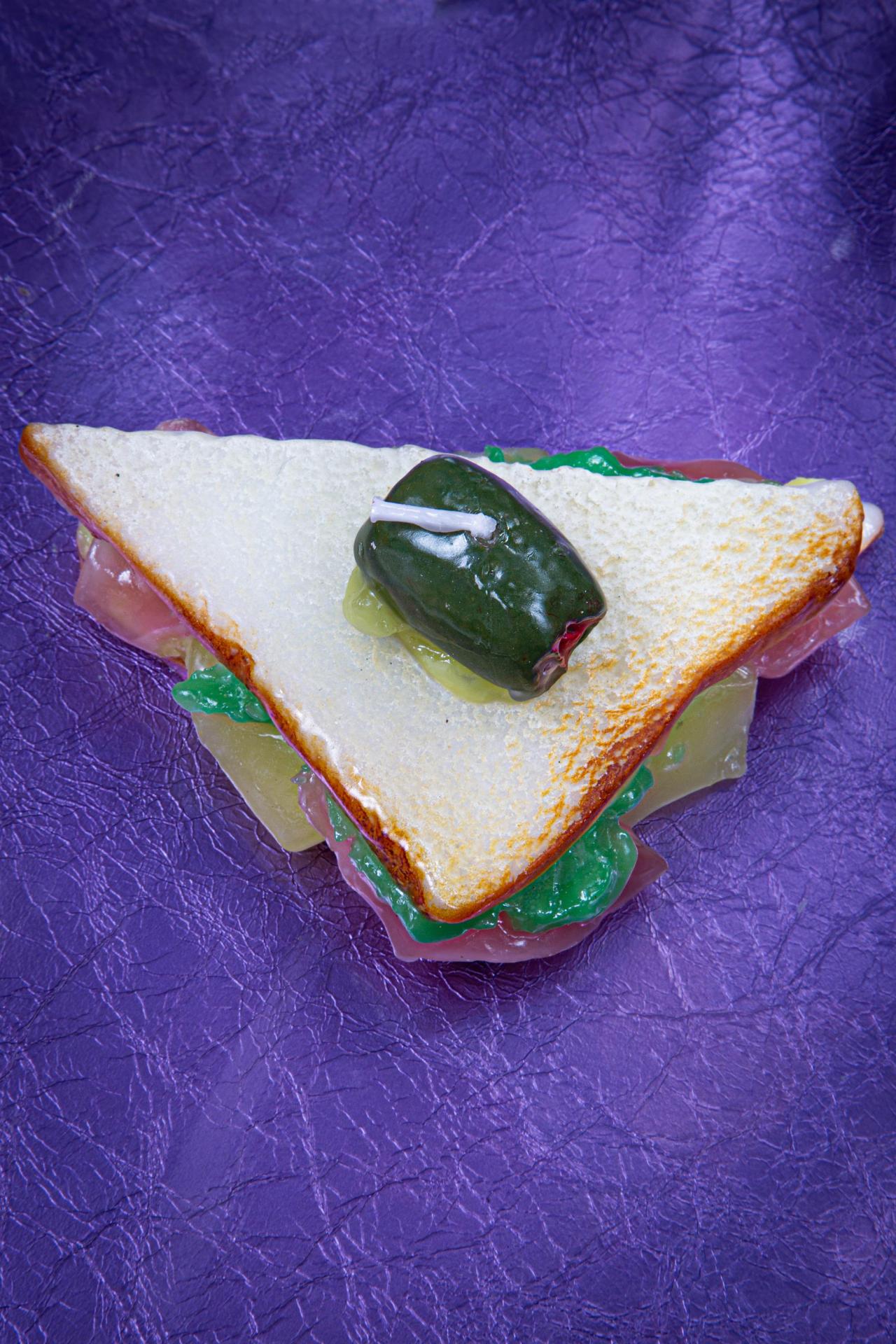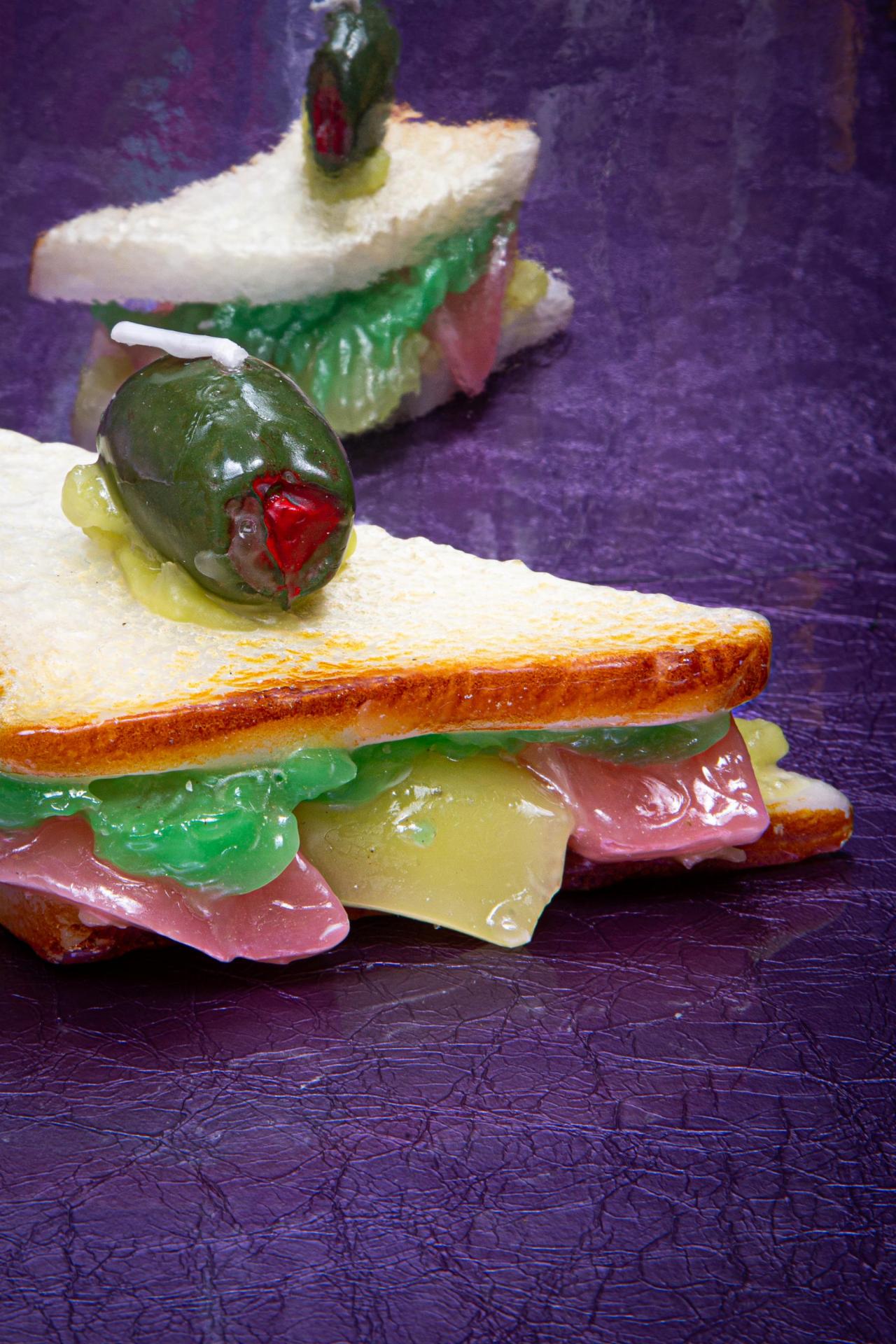 A quirky candle shaped like a classic sandwich slice, complete with faux bread, lettuce, cheese, and a glossy pickle on top.