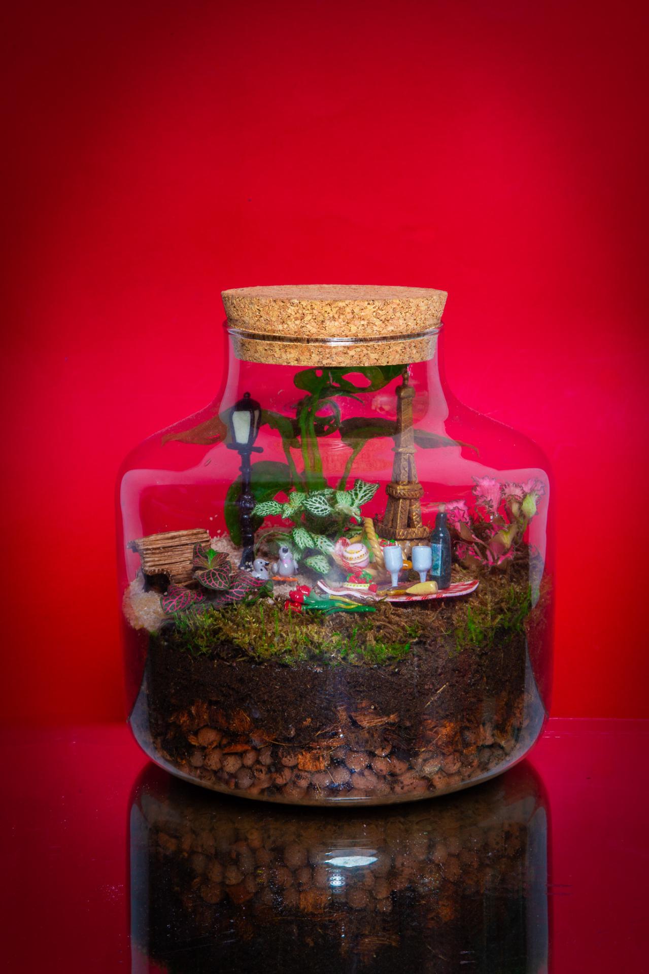 A romantic Parisian terrarium featuring a tiny picnic scene, lush greenery, and iconic miniature details like the Eiffel Tower.