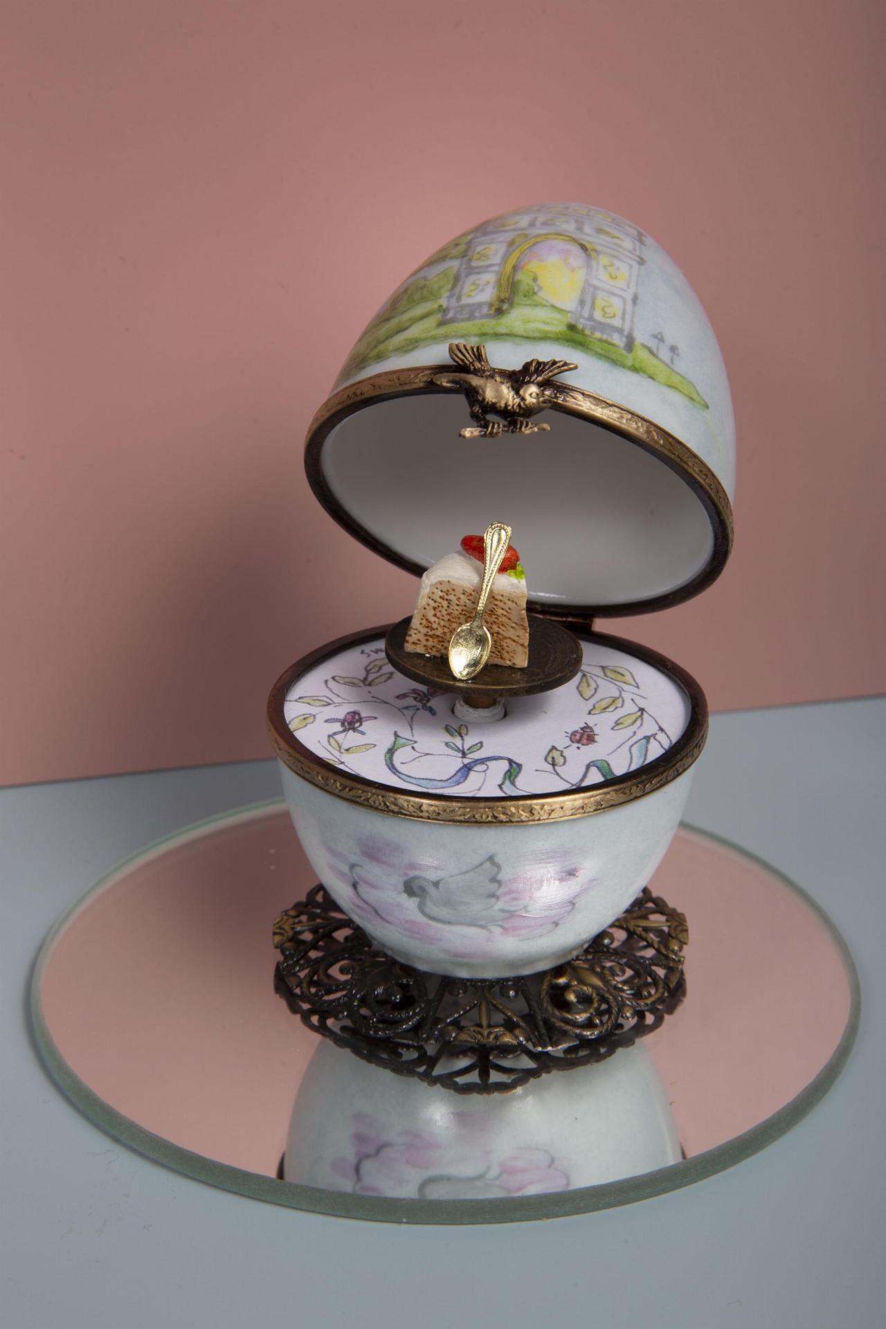 A luxurious hinged trinket box revealing a miniature dessert and golden spoon, beautifully decorated with hand-painted Parisian details.