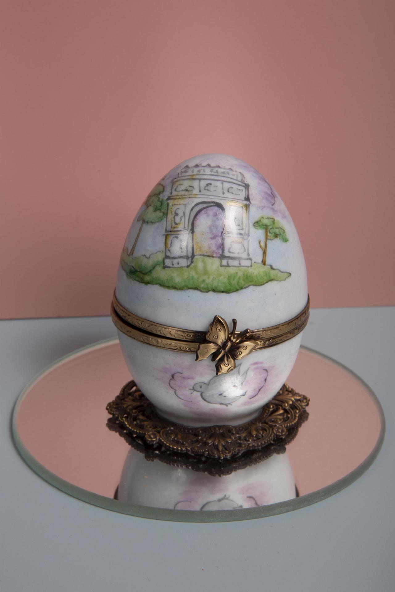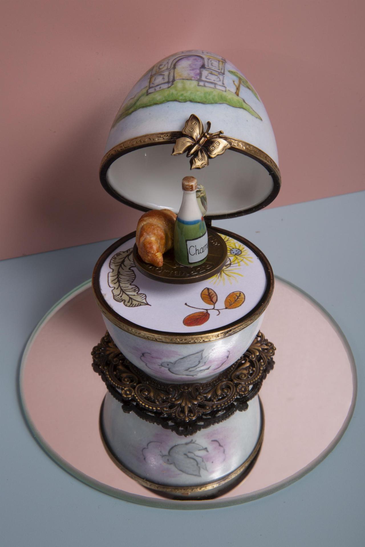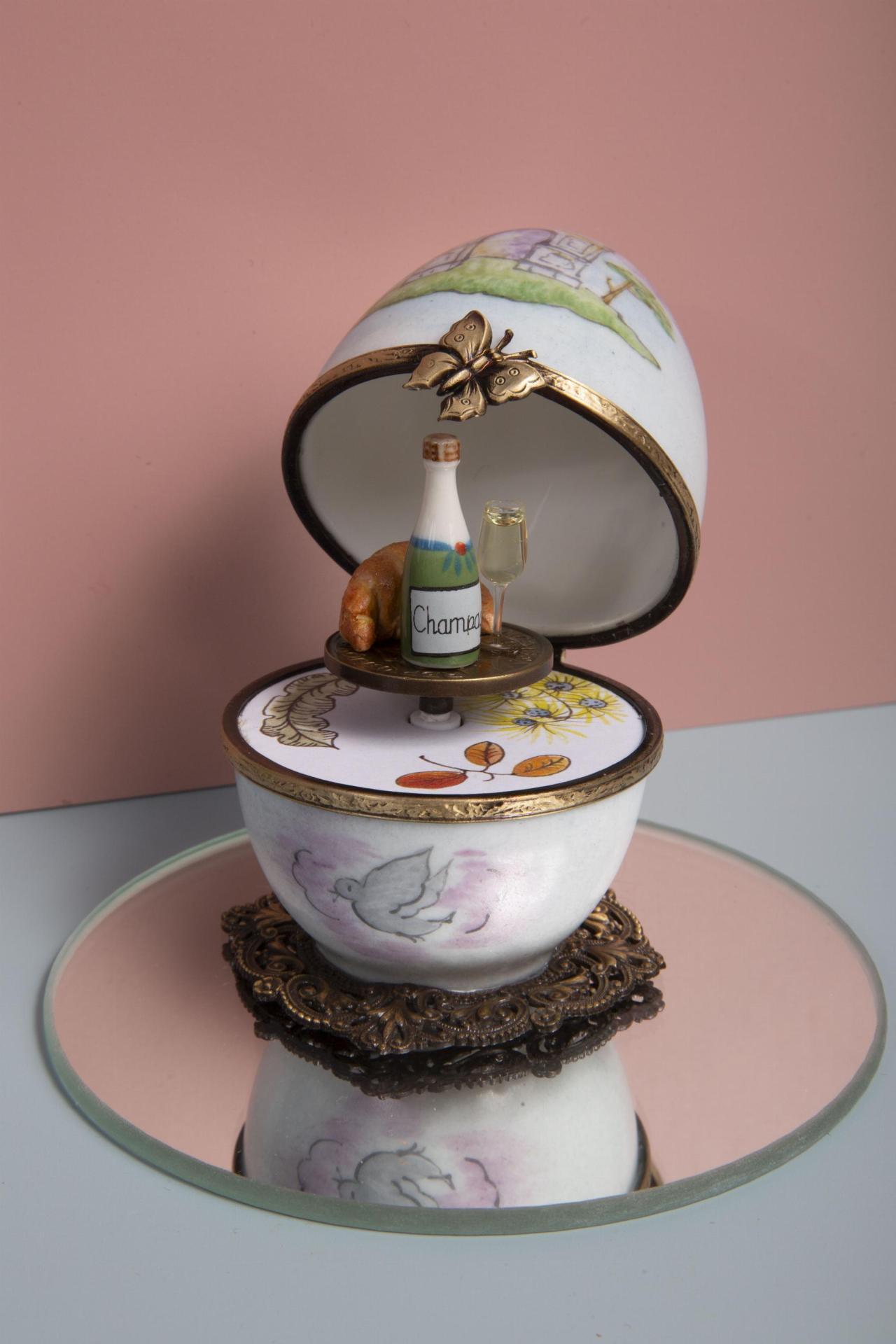 A luxurious hinged trinket box that opens to reveal a miniature champagne bottle, glass, and croissant, an ode to Parisian indulgence.