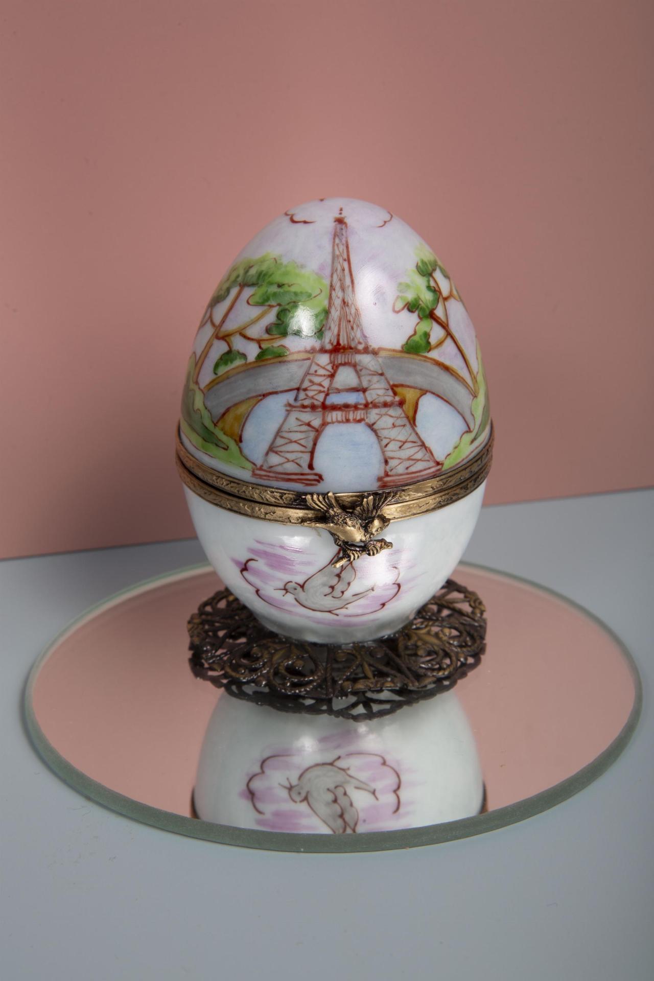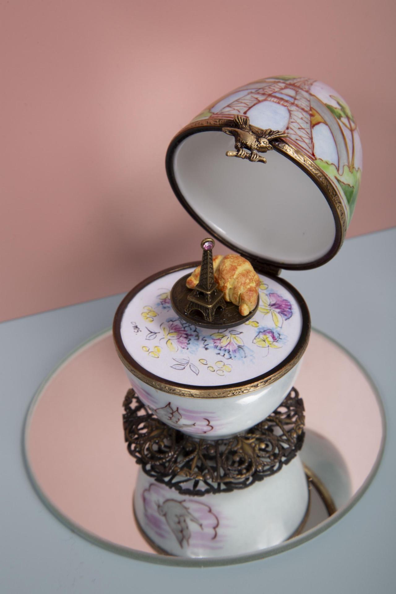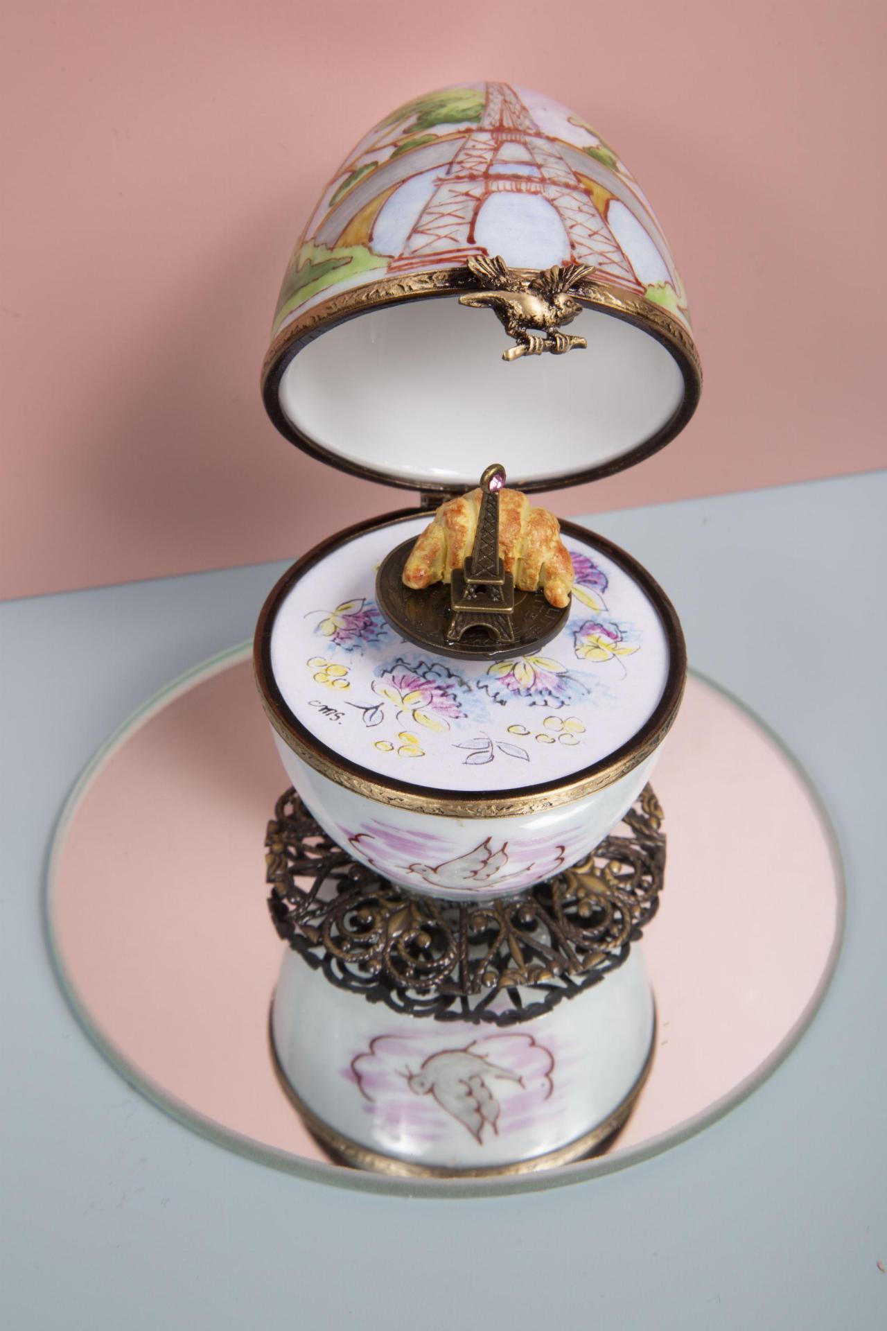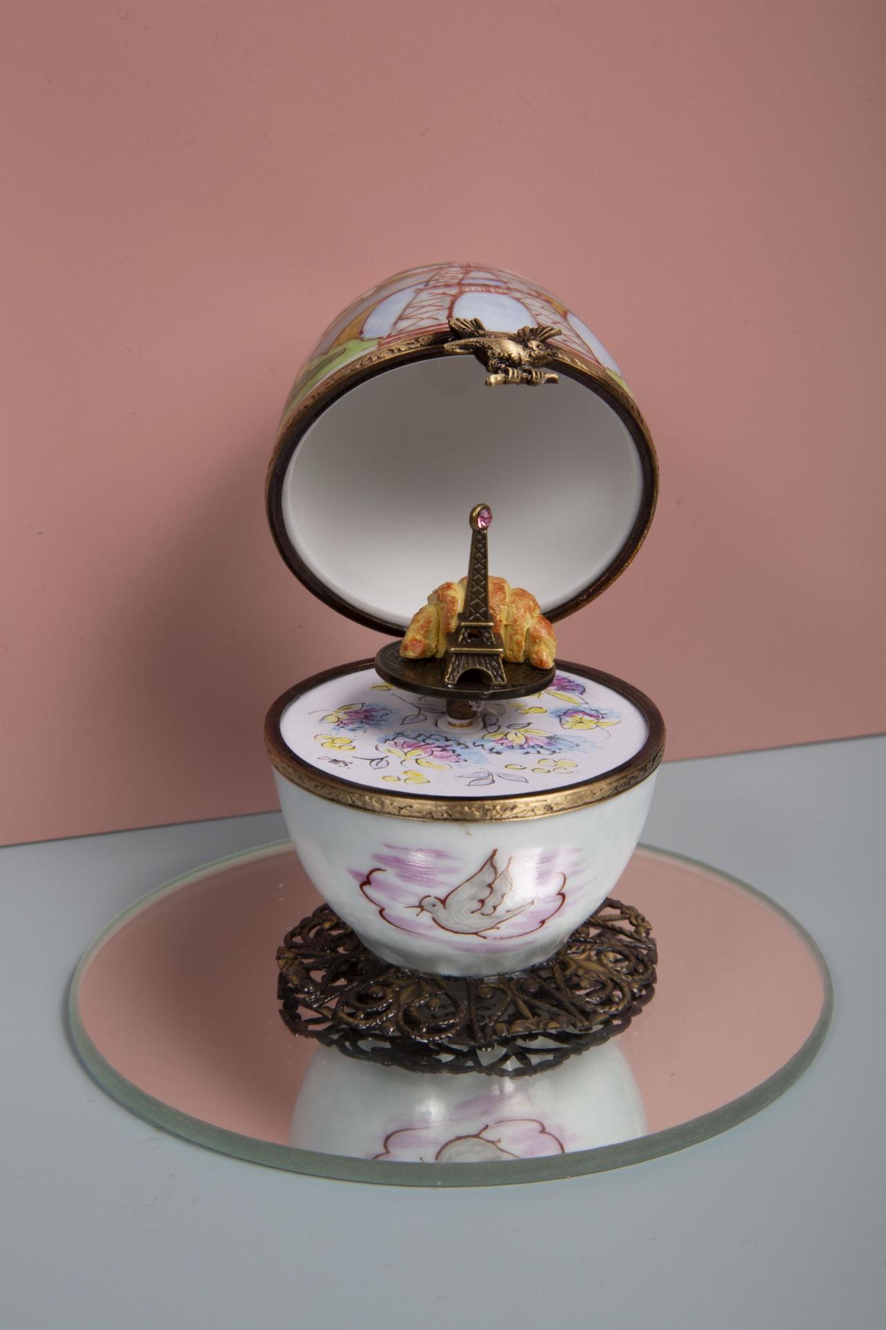 A delicate hinged trinket box featuring hand-painted Parisian motifs and a charming miniature Eiffel Tower with golden croissants inside.