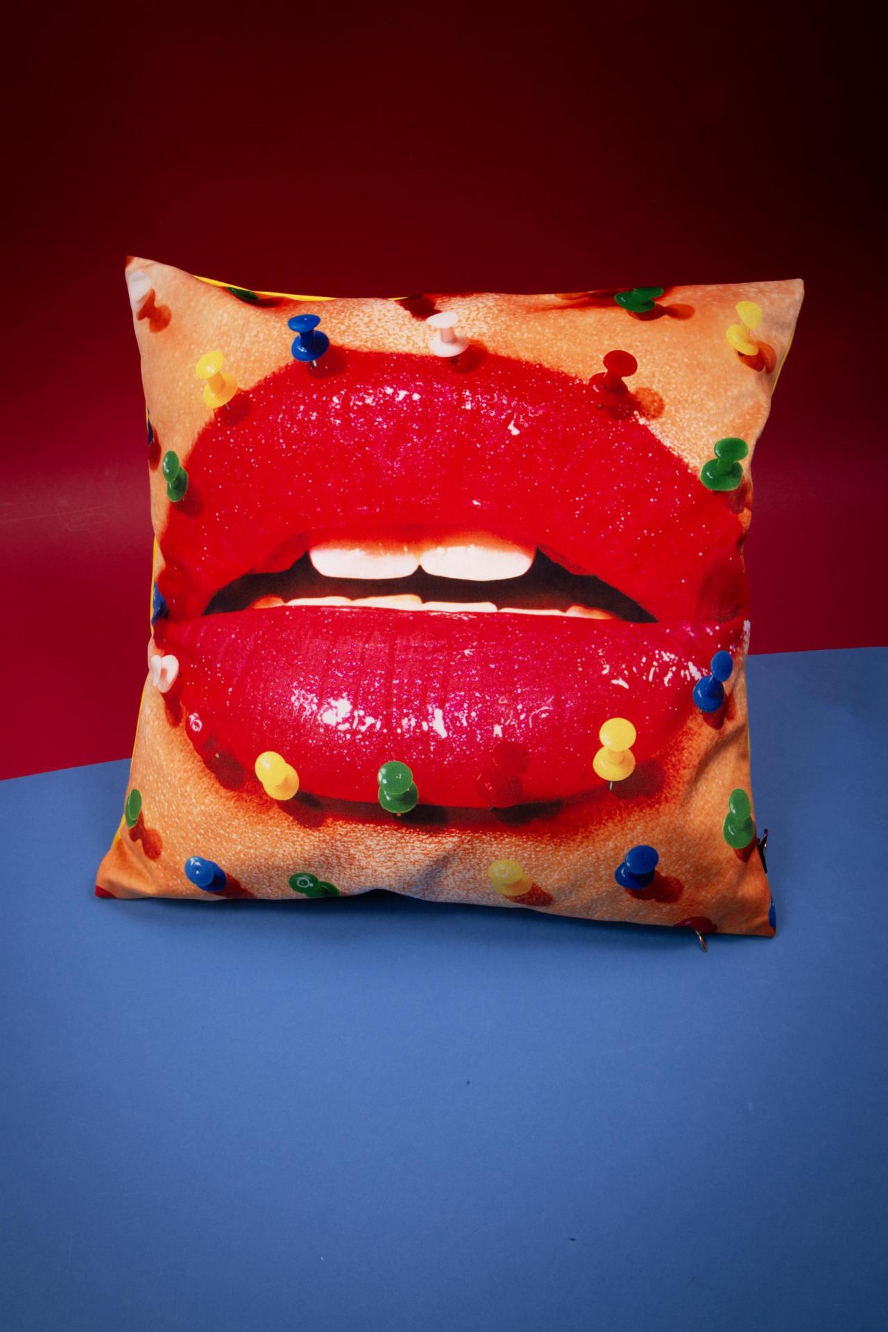 A bold pop art cushion featuring glossy red lips surrounded by colorful pins for a striking modern look.