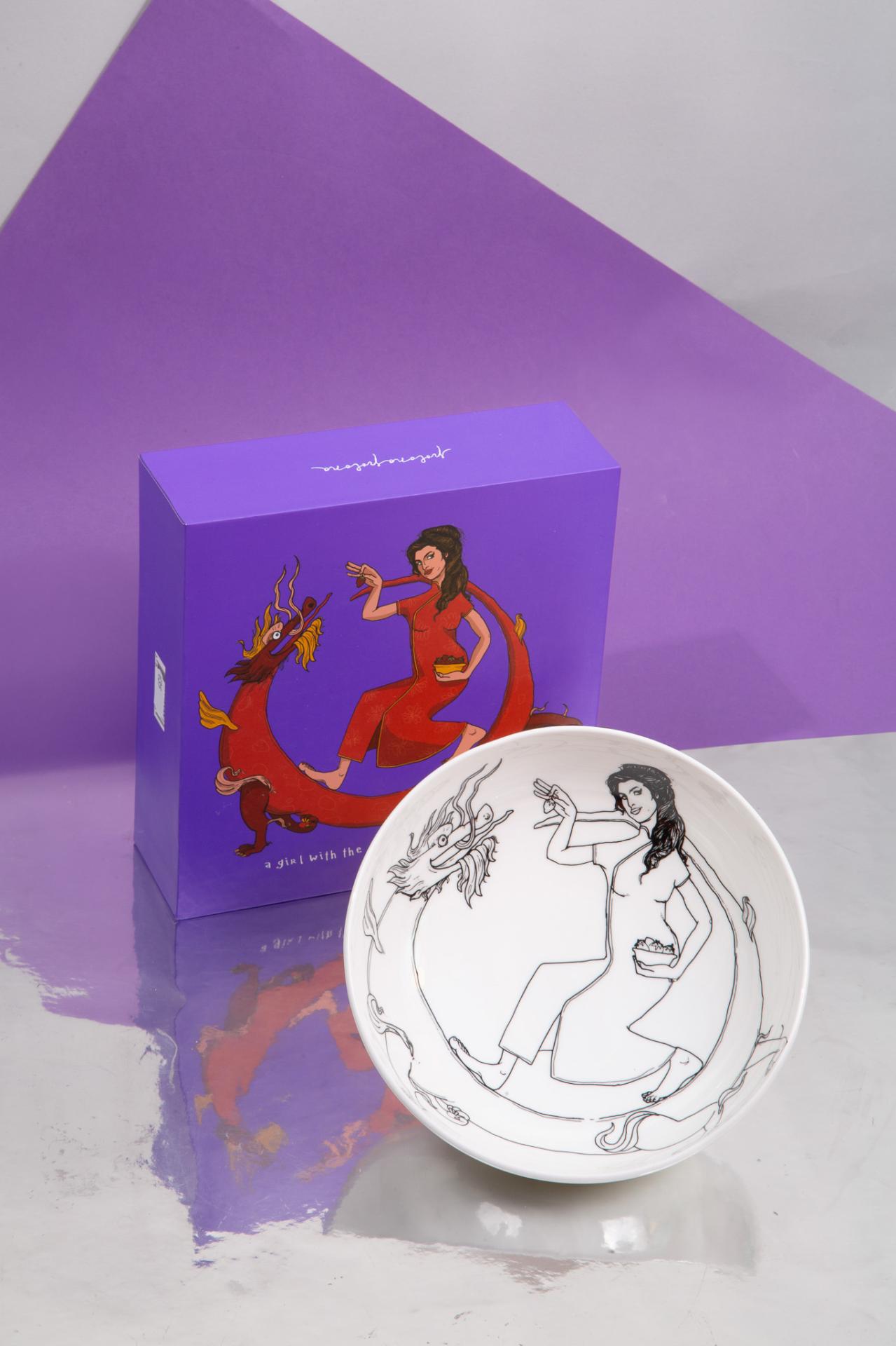 A beautifully illustrated ceramic bowl featuring a girl and a dragon in a flowing, artistic composition, perfect for adding imagination and elegance to any meal.