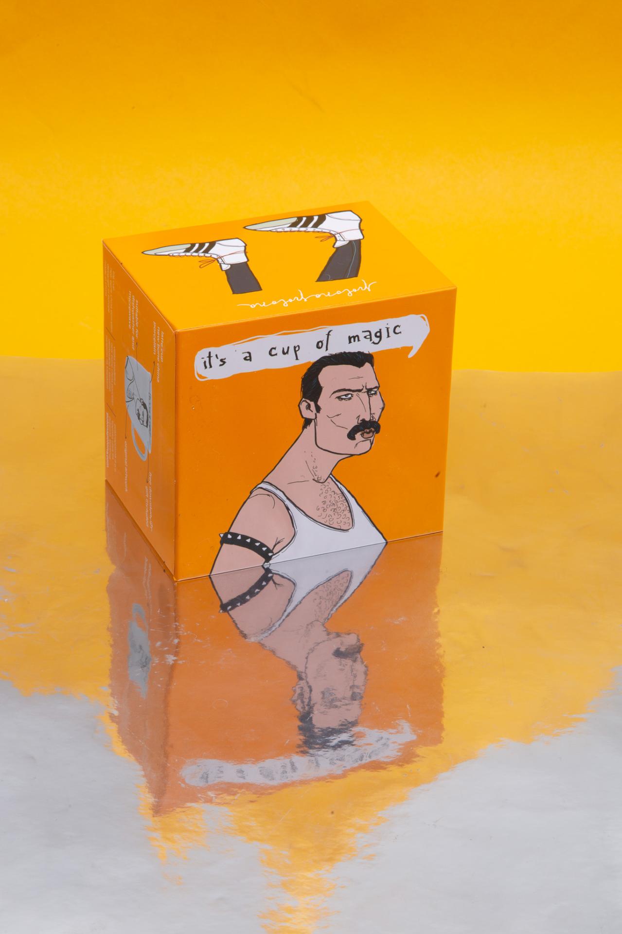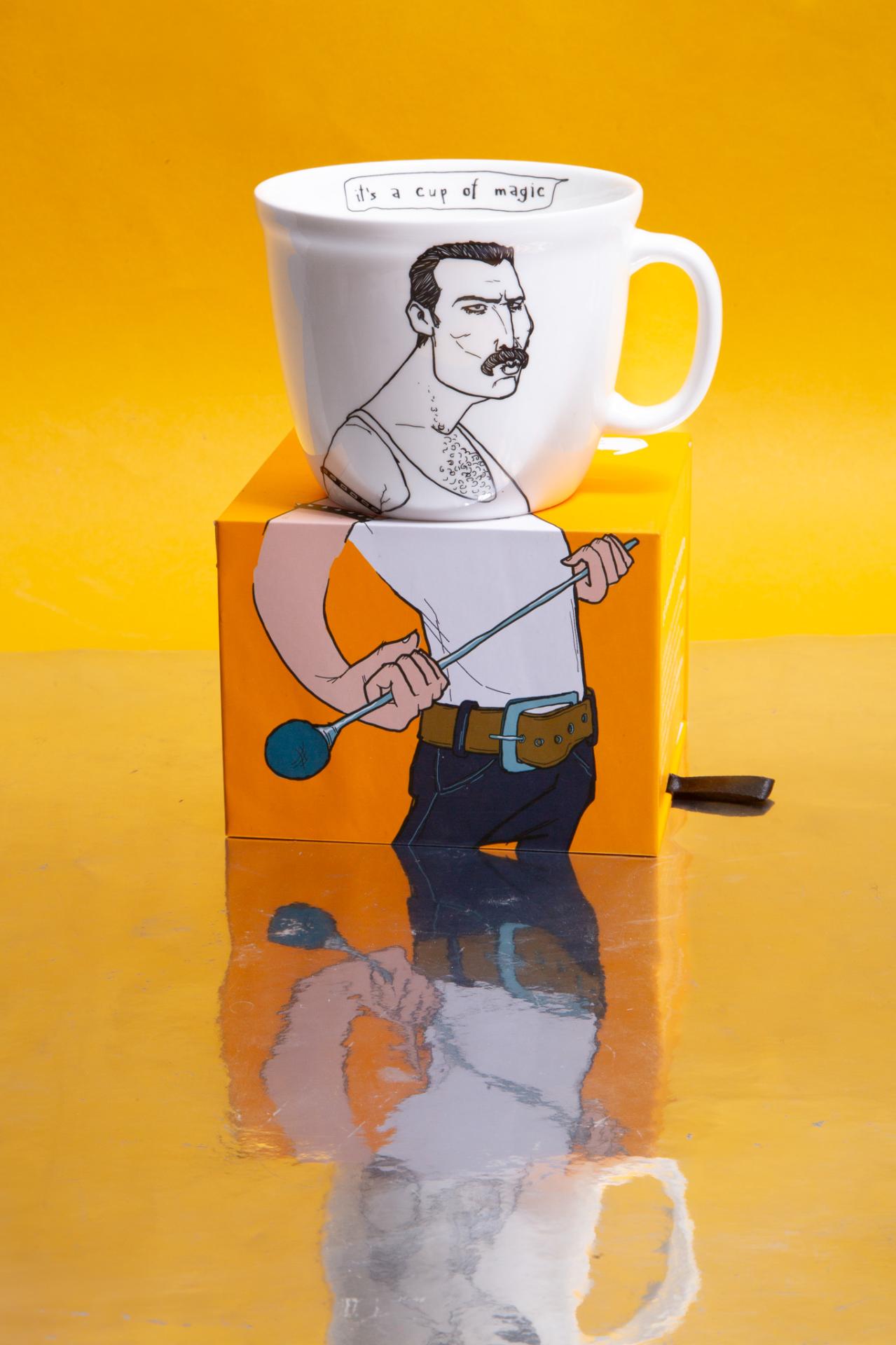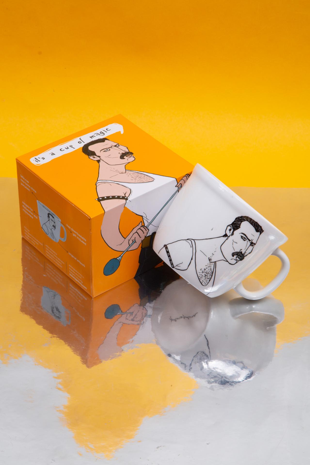 A fun and expressive illustrated mug inspired by an iconic rock legend, perfect for energizing your morning coffee.