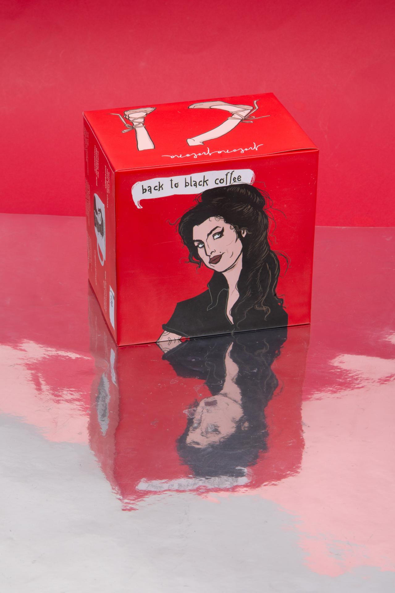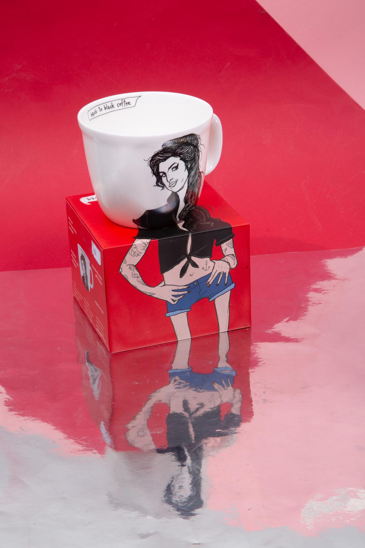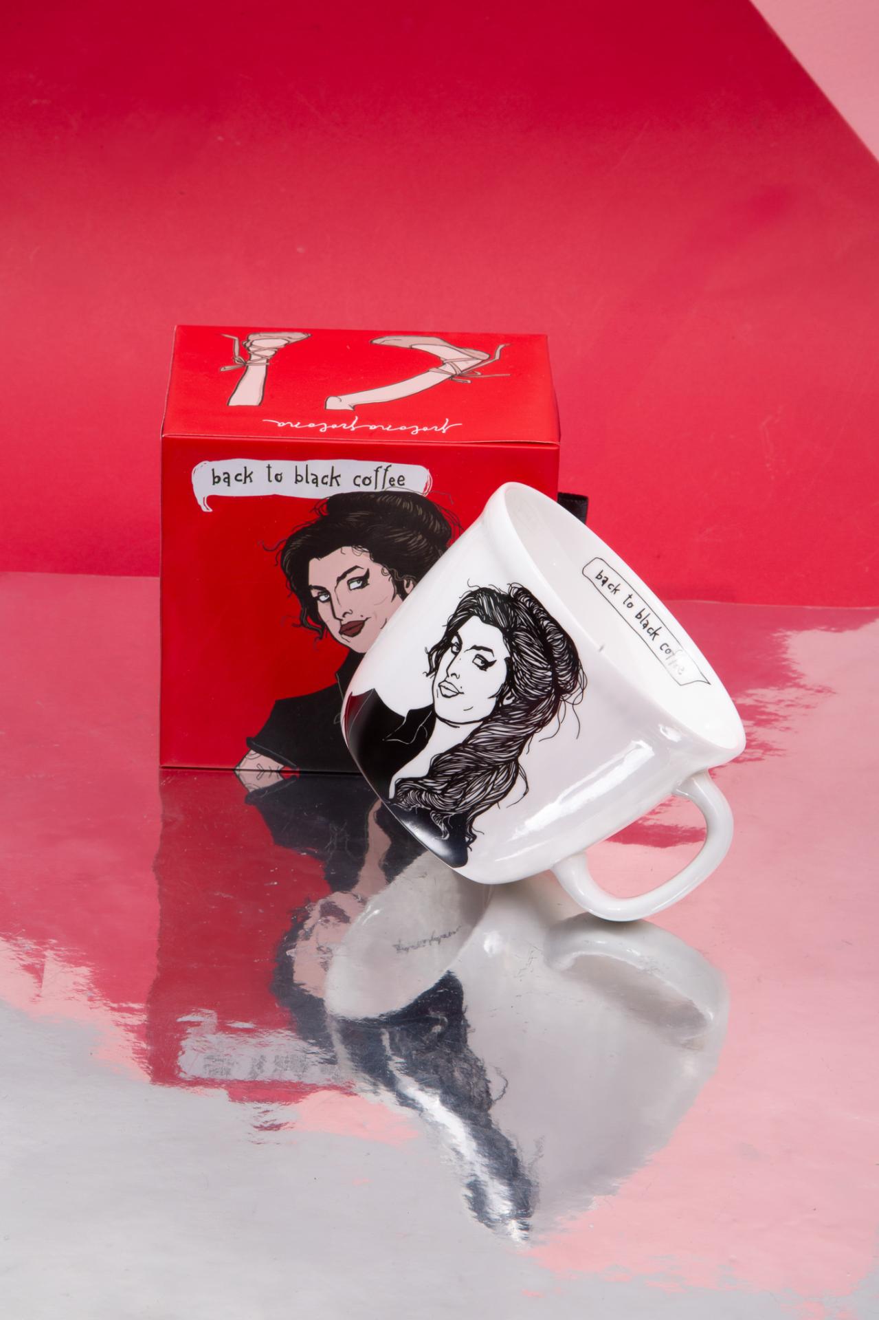 A bold, illustrated coffee mug featuring a striking Back-to-Black–inspired portrait, perfect for fans of music, art, and statement homeware.