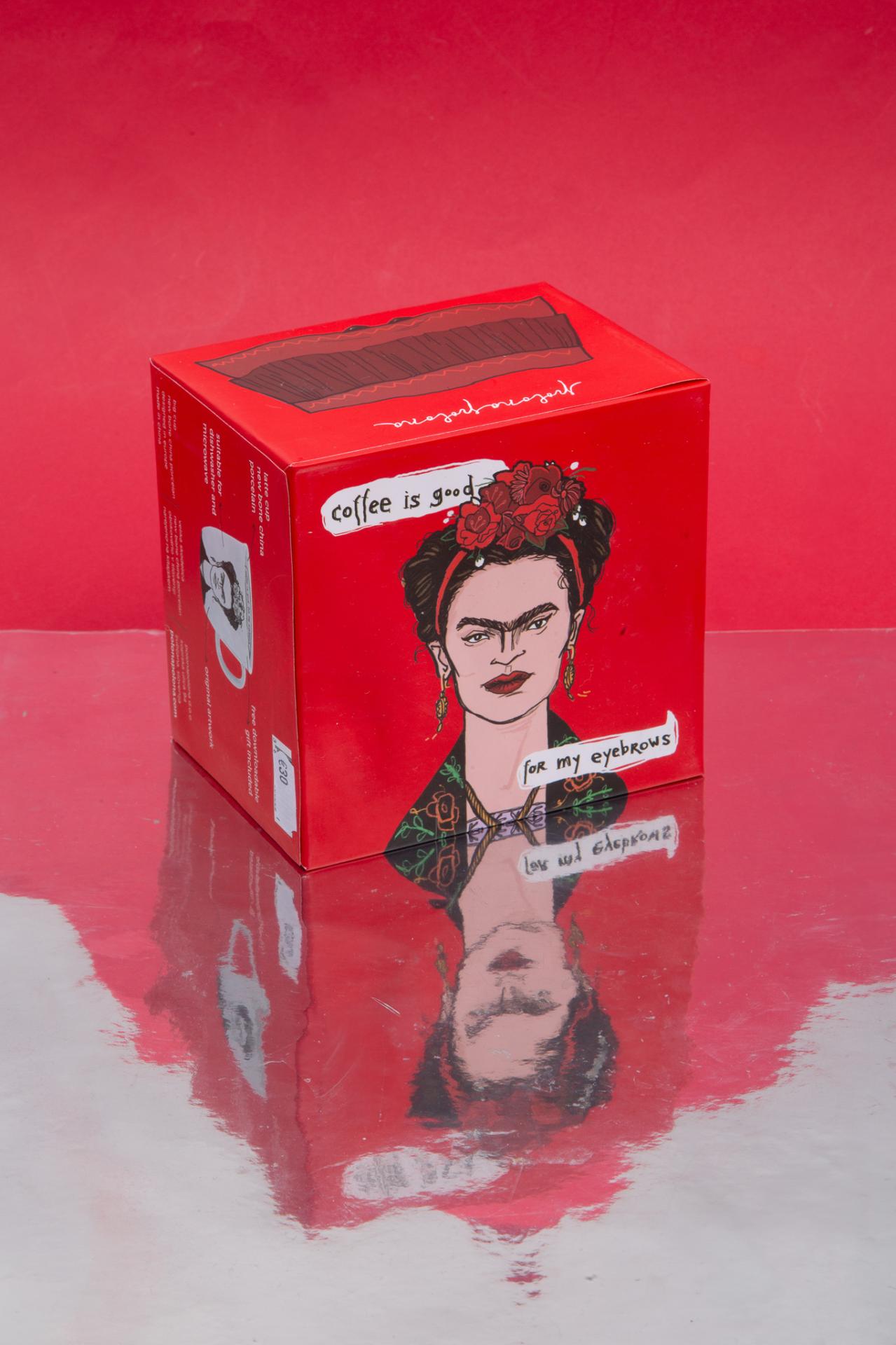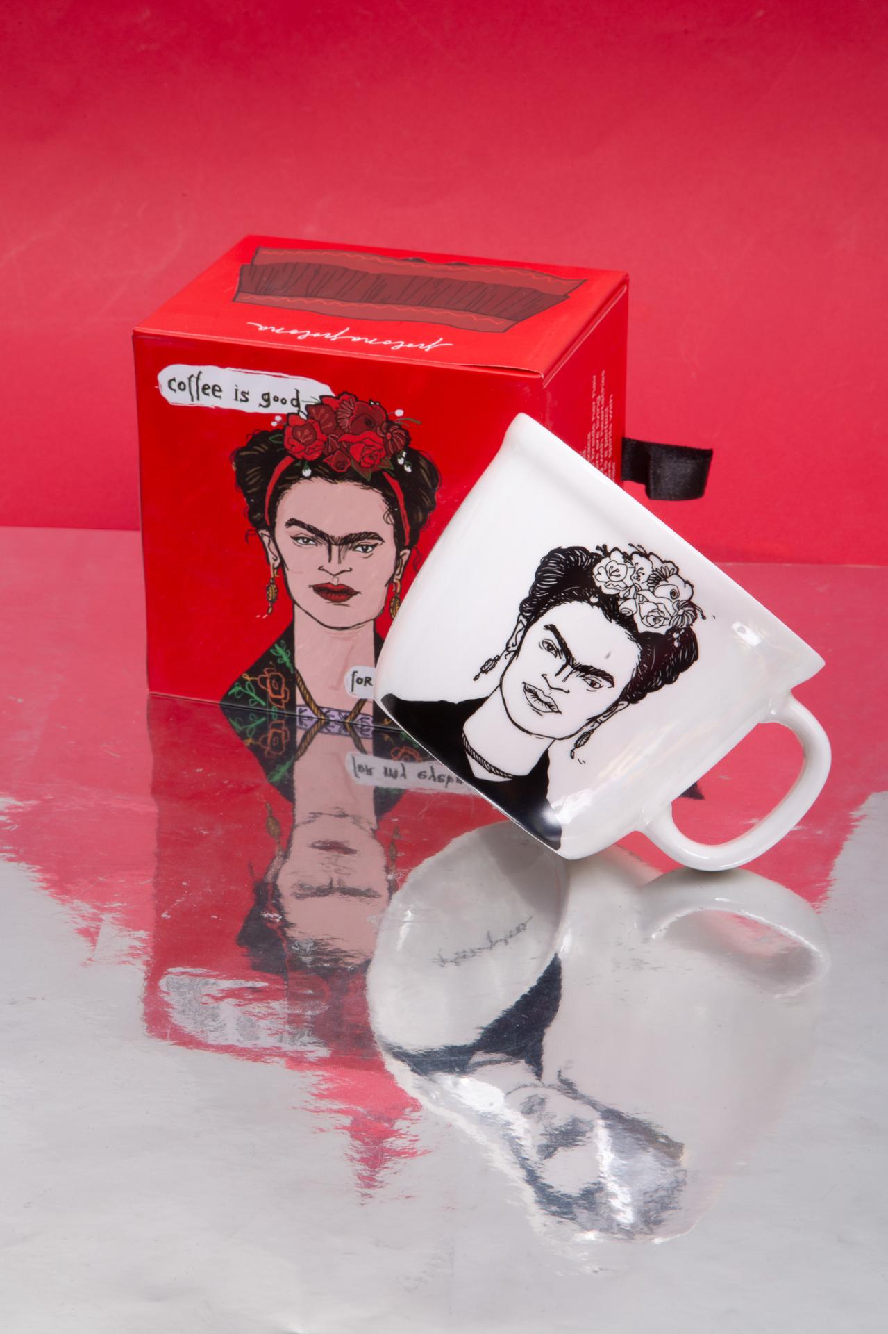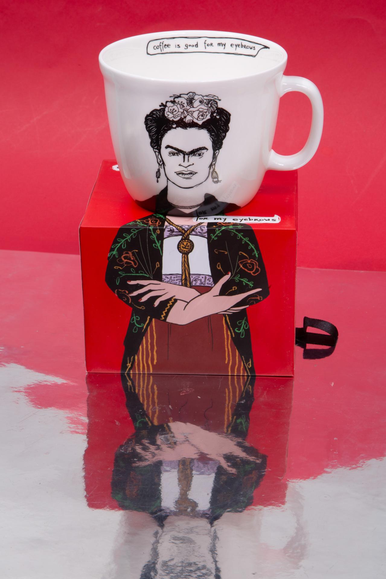 A ceramic mug featuring Frida Kahlo with the quote “coffee is good for my eyebrows” artful, iconic, and full of attitude.A powerful illustrated mug inspired by bold brows and artistic flair, perfect for coffee lovers who enjoy a strong dose of personality.