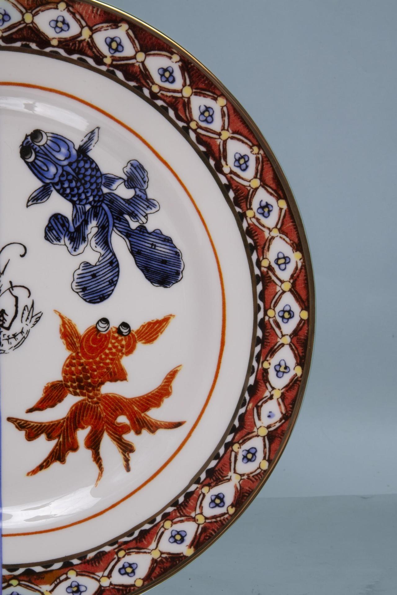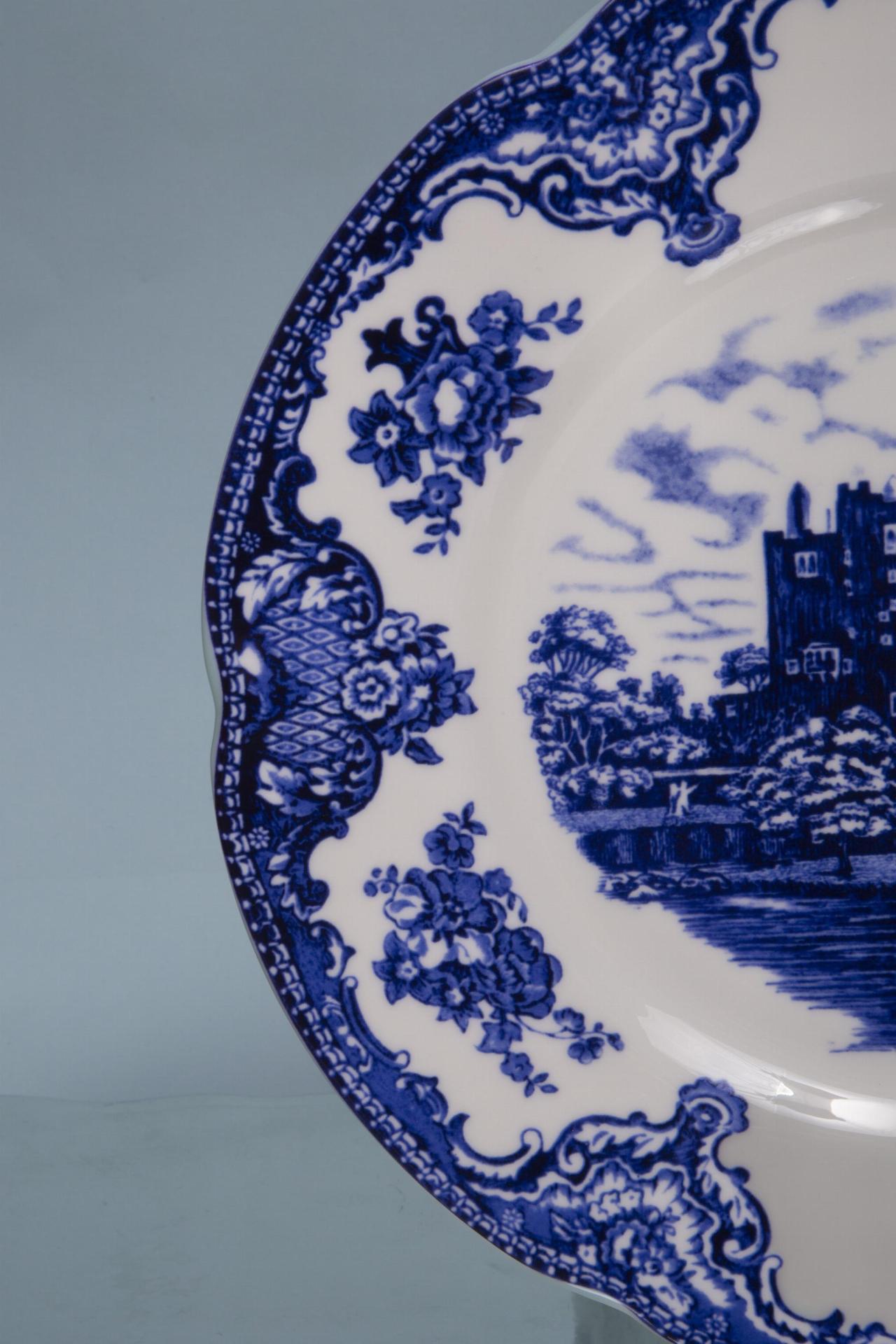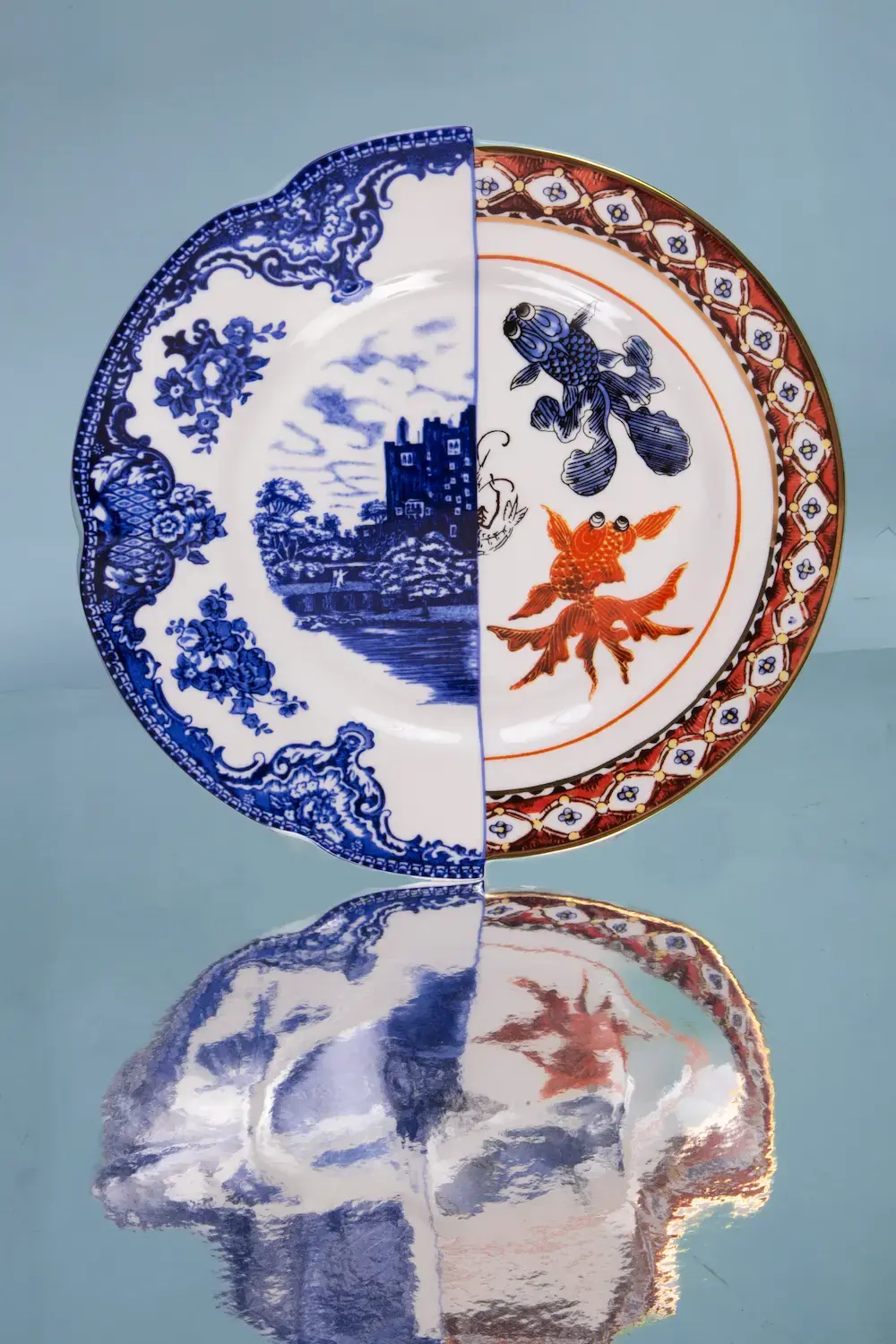 A beautifully contrasted hybrid ceramic dish combining classic blue scenery with vibrant Asian-inspired motifs, an artful statement for any table.