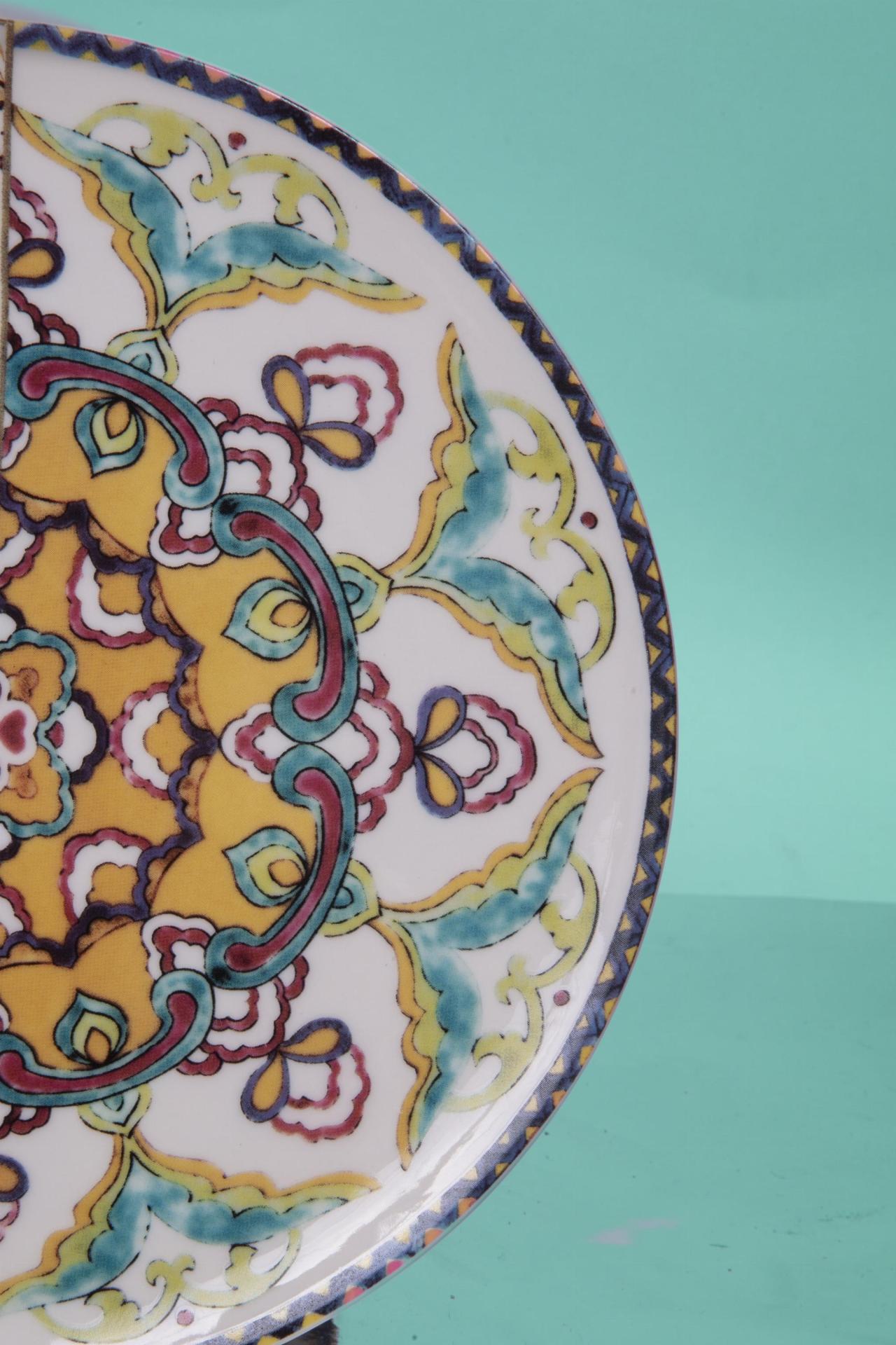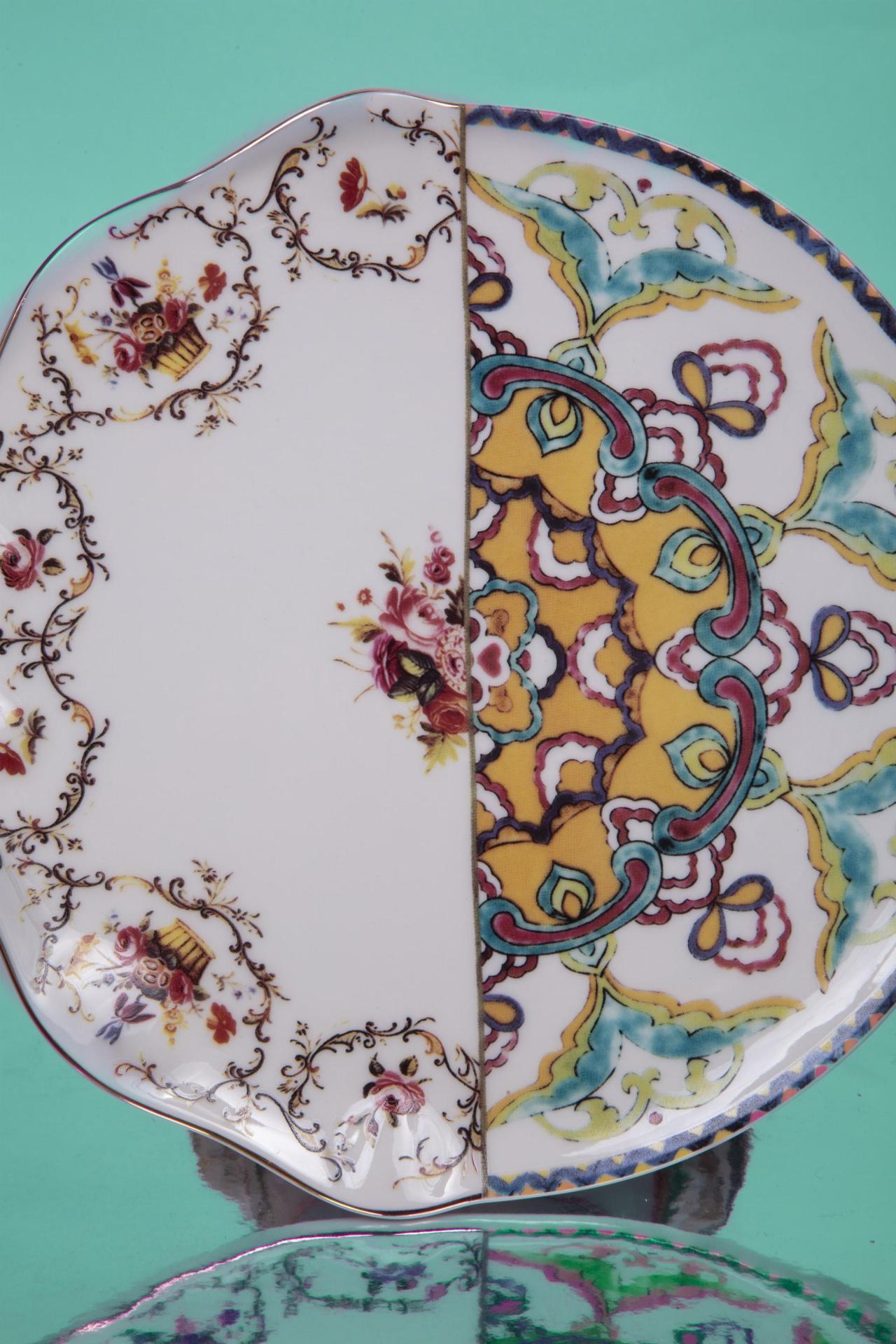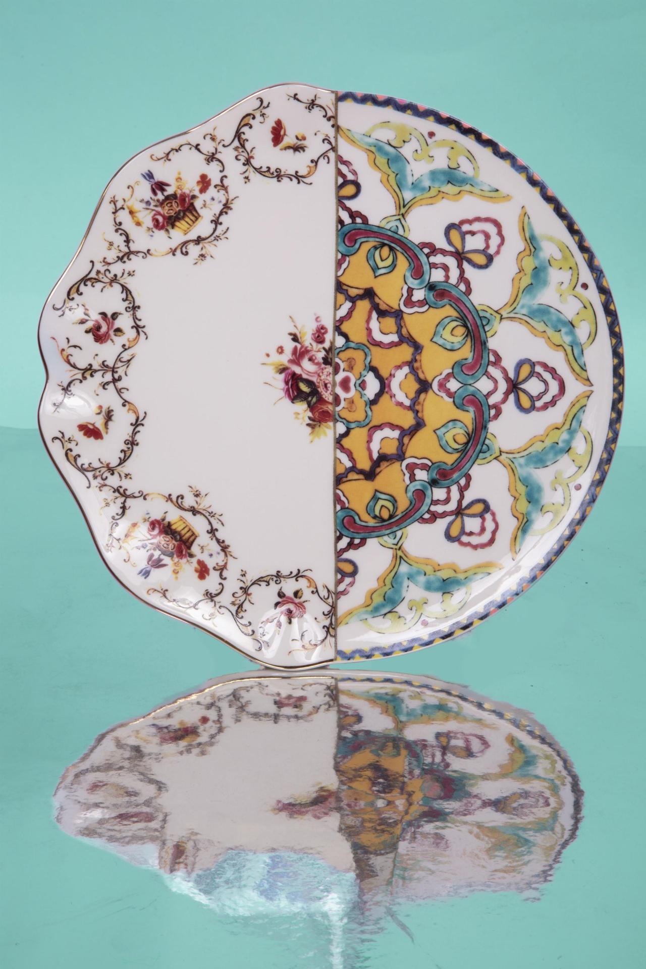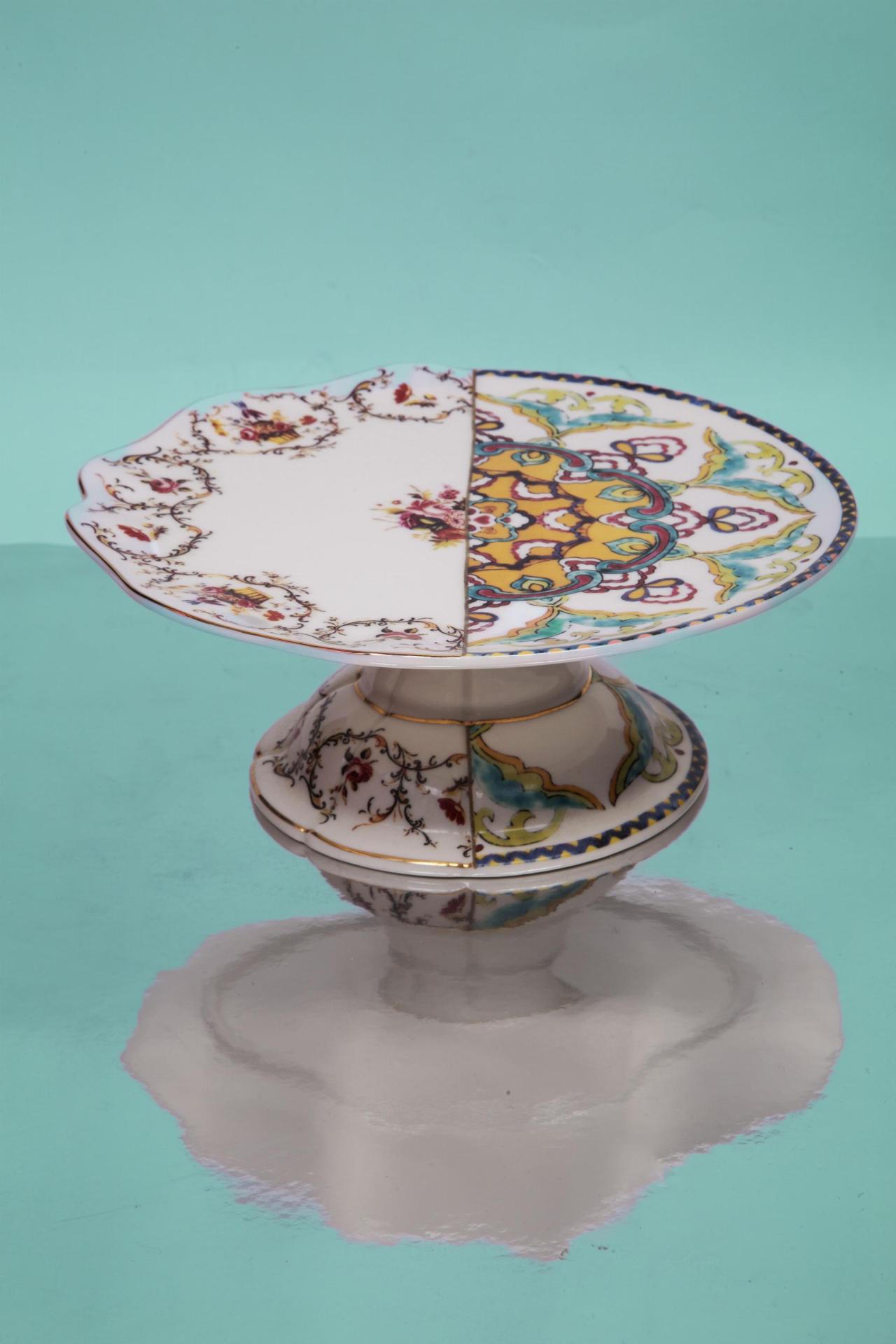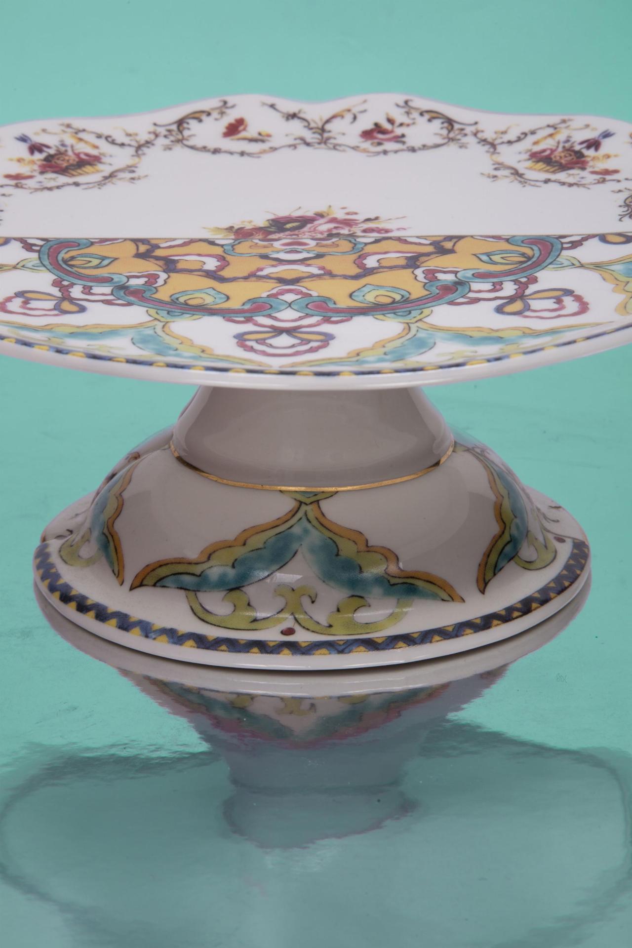 A stunning hybrid-style ceramic cake stand blending two artistic traditions into one eye-catching, decorative centerpiece.