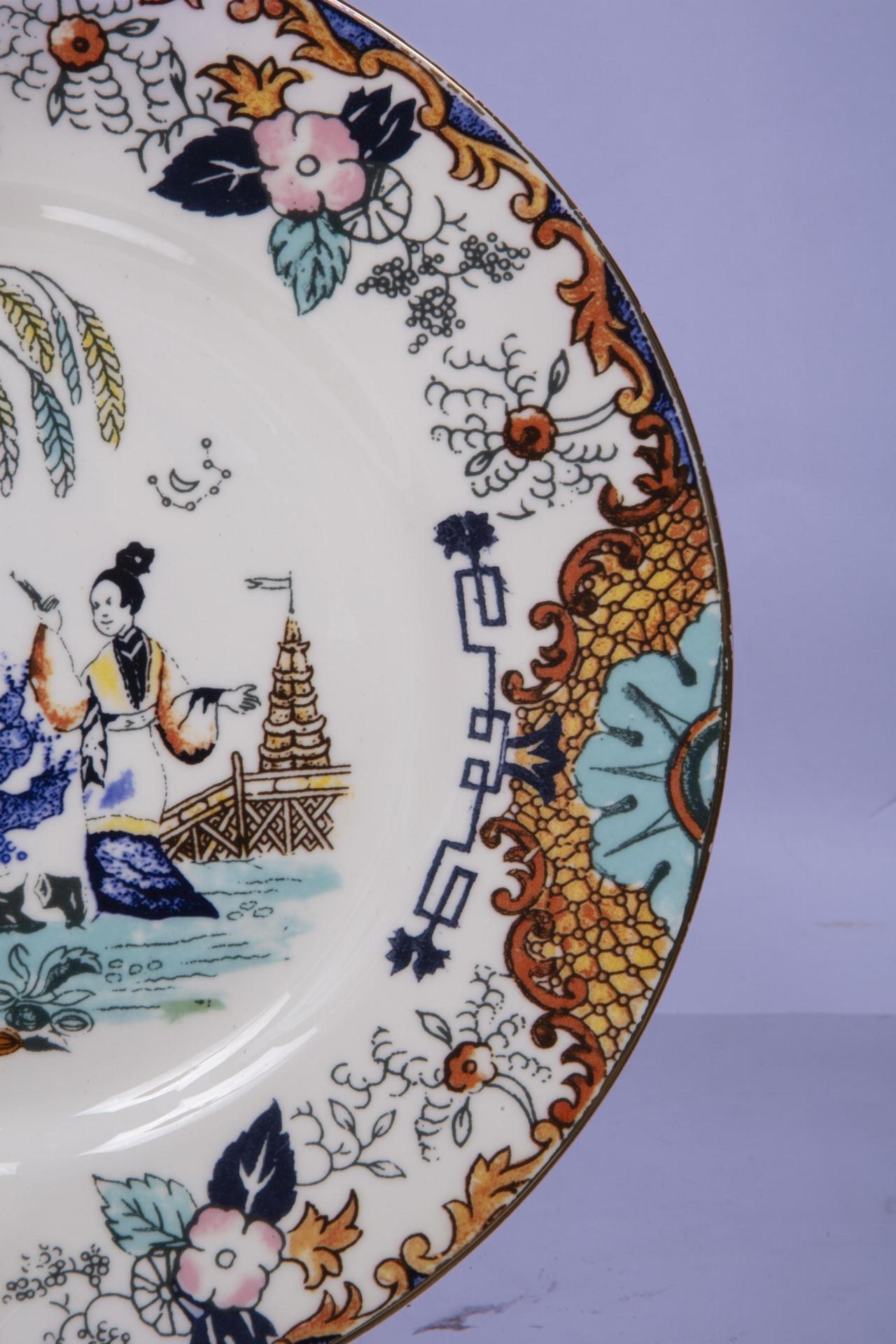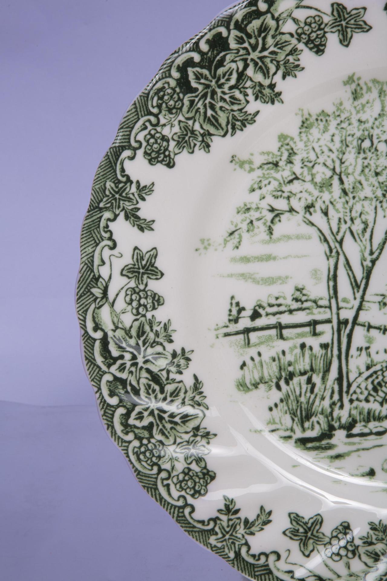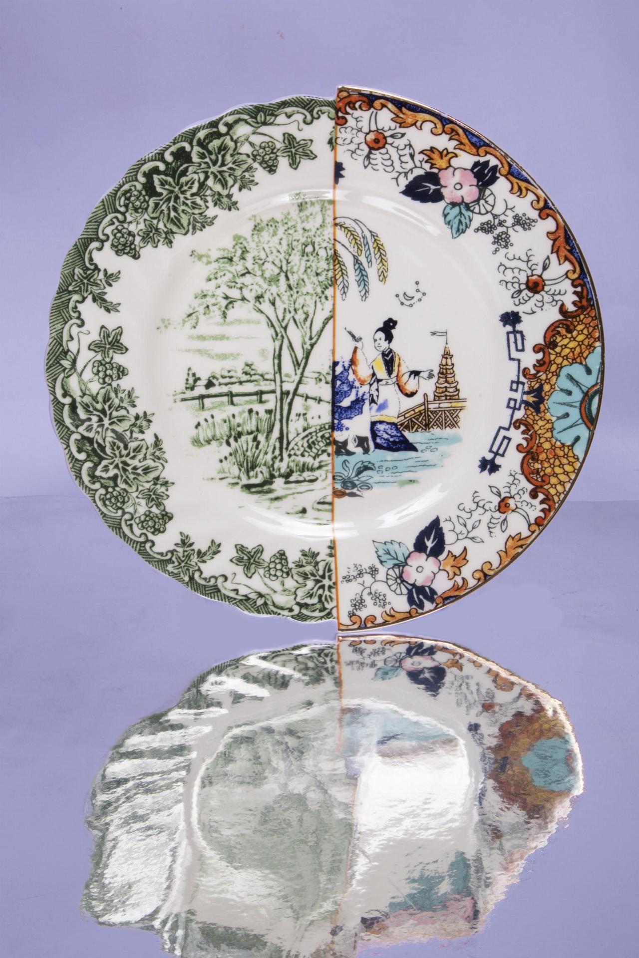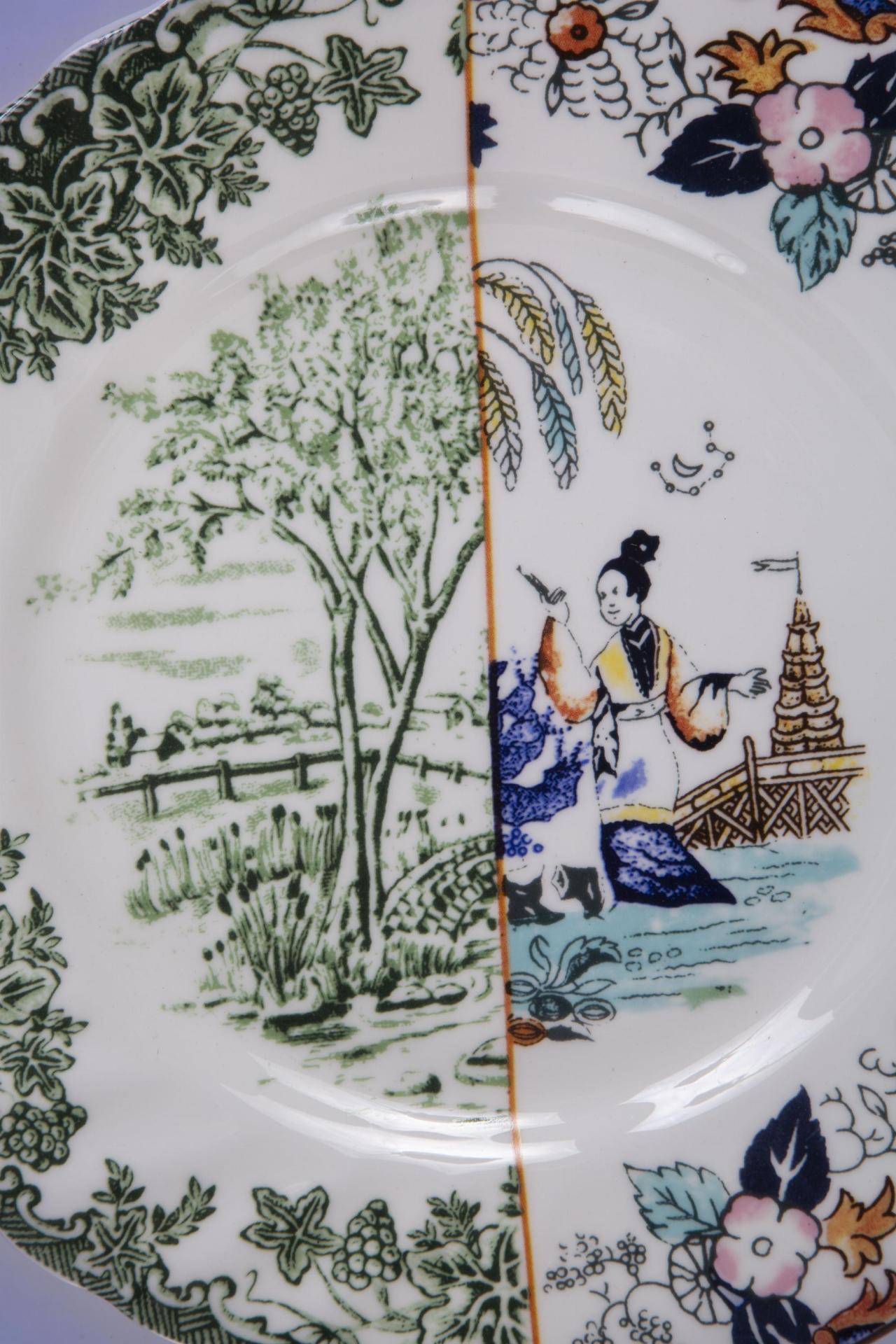 A captivating ceramic dish that merges a pastoral green illustration with ornate Eastern-inspired artwork, creating a striking hybrid design.