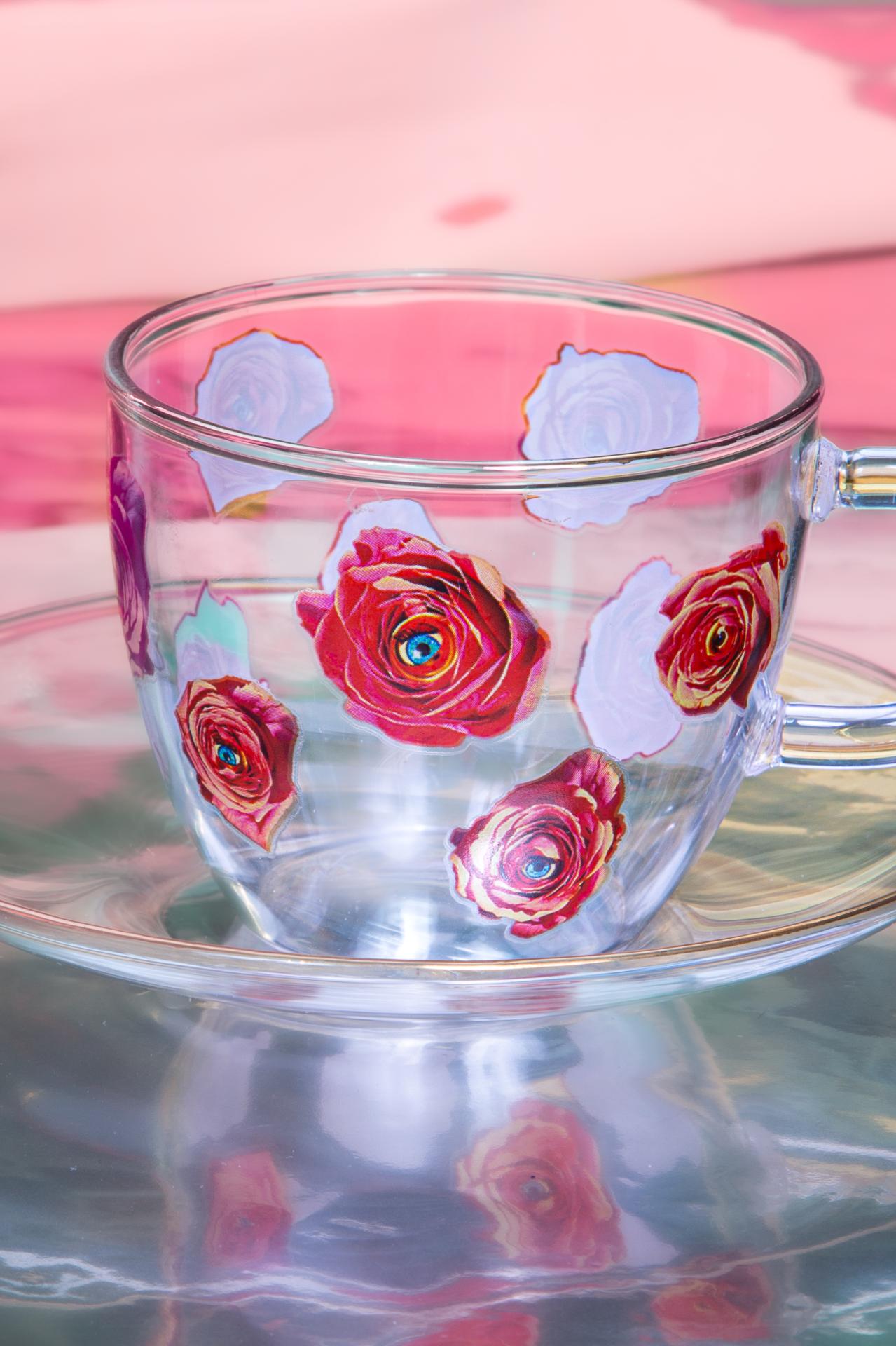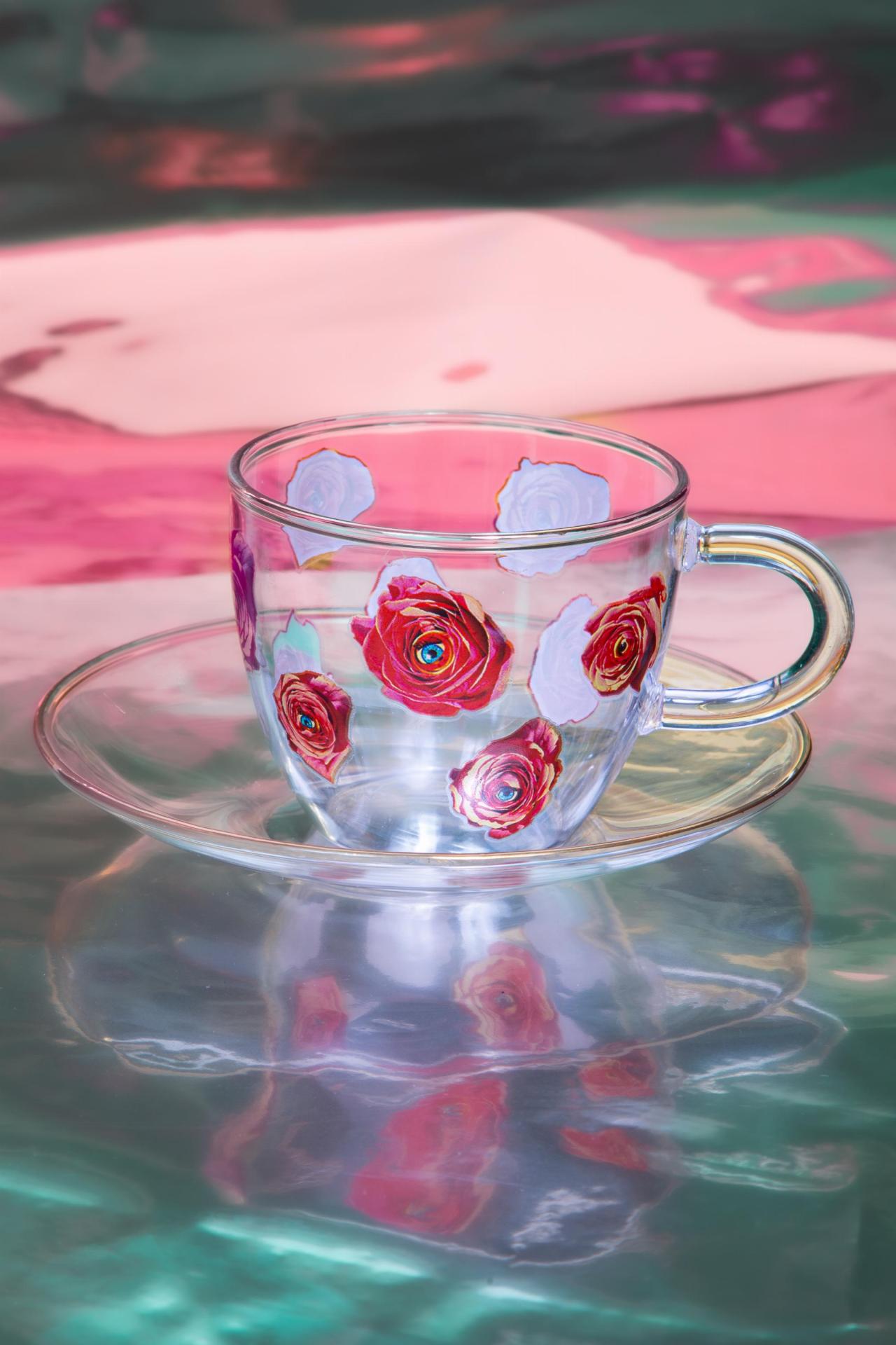 A delicate glass coffee cup and saucer adorned with hand-painted roses, adding a romantic and artistic touch to every sip.