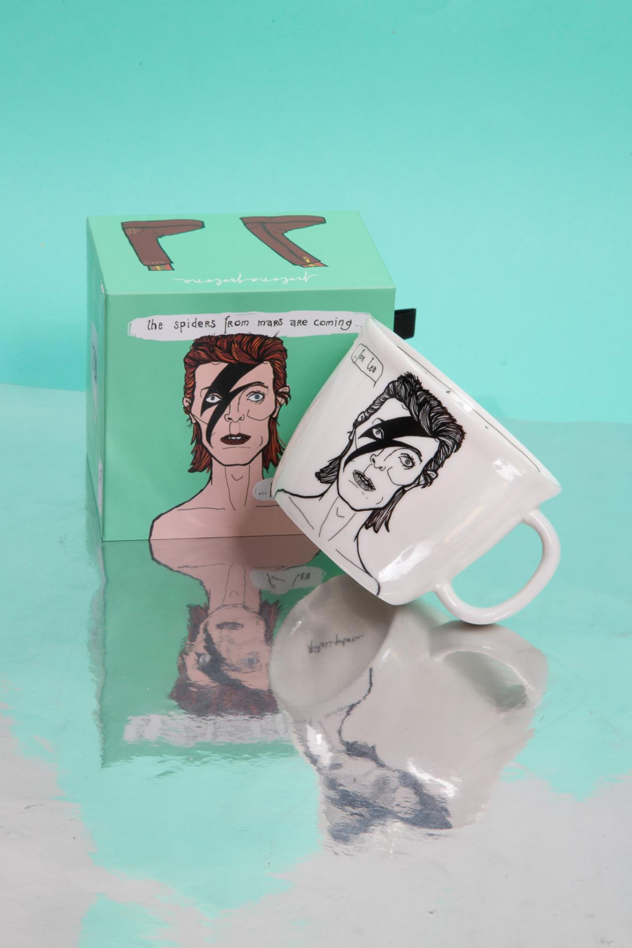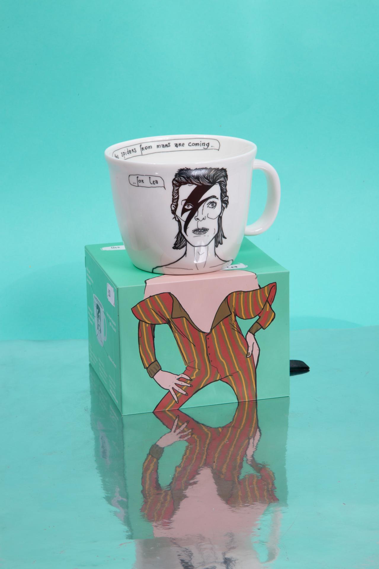 A bold, artistic mug featuring a hand-drawn Starman-inspired portrait, perfect for music lovers, collectors, and your daily tea ritual.