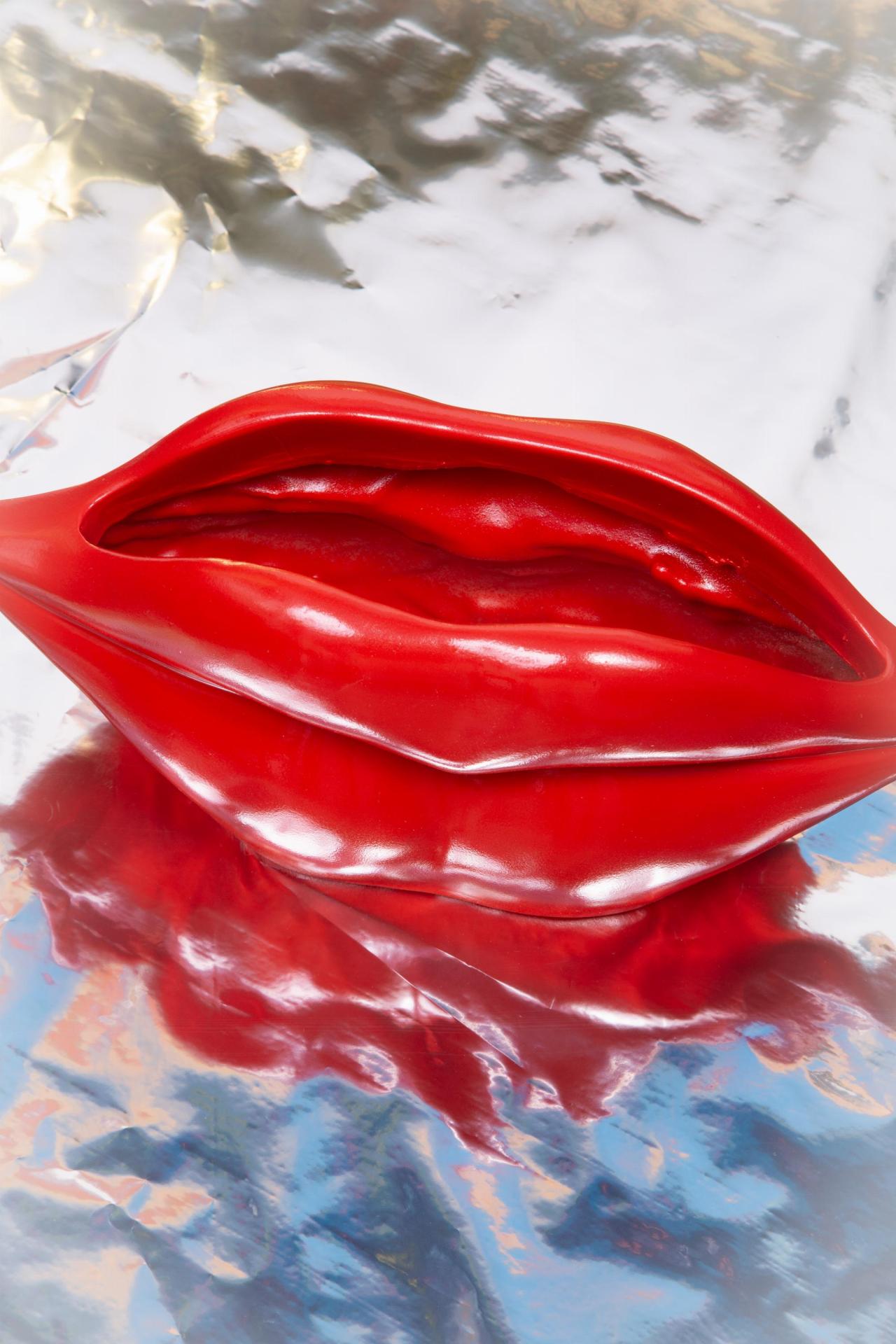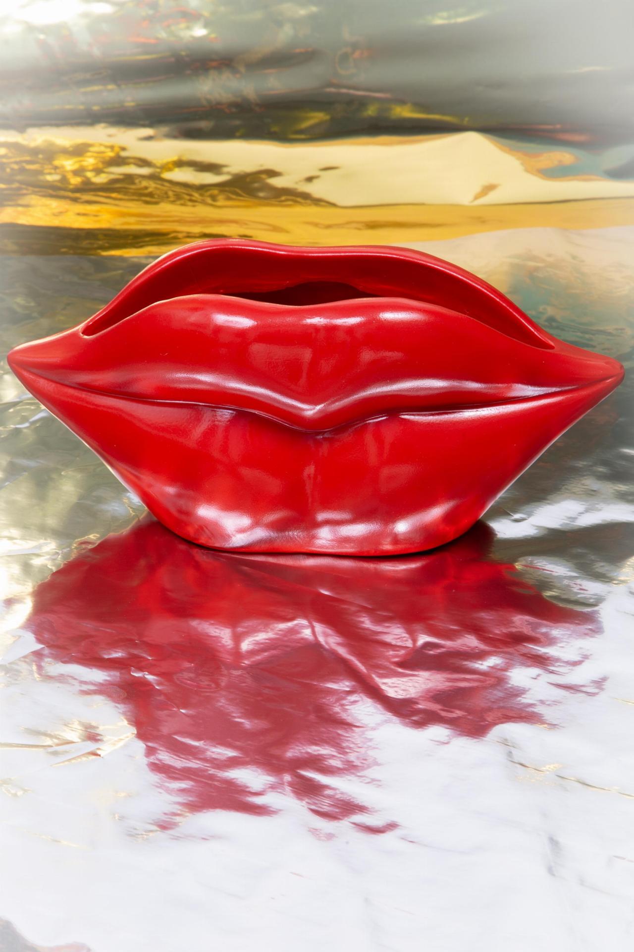 A bold red ceramic vase shaped like glossy lips that instantly makes a statement.