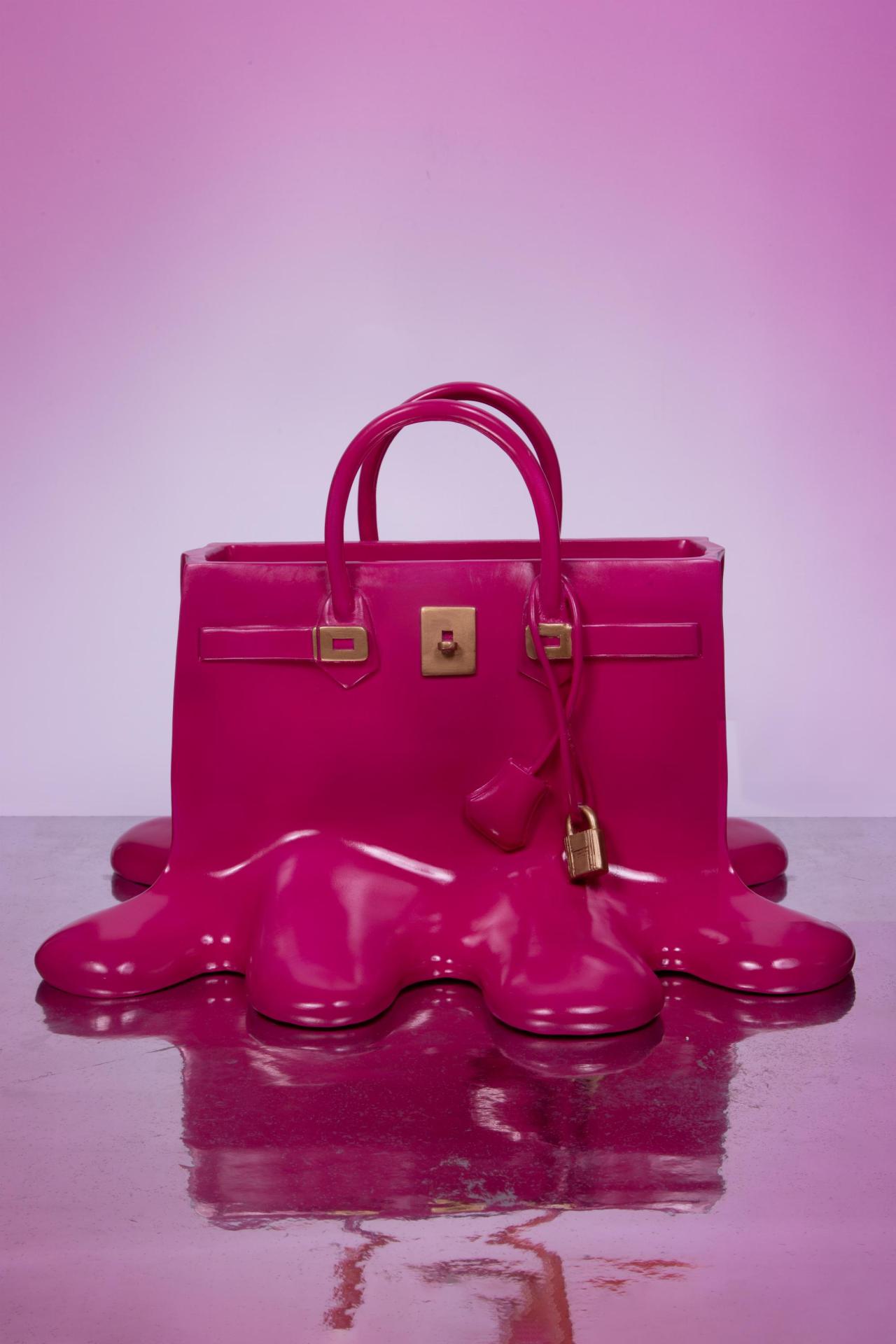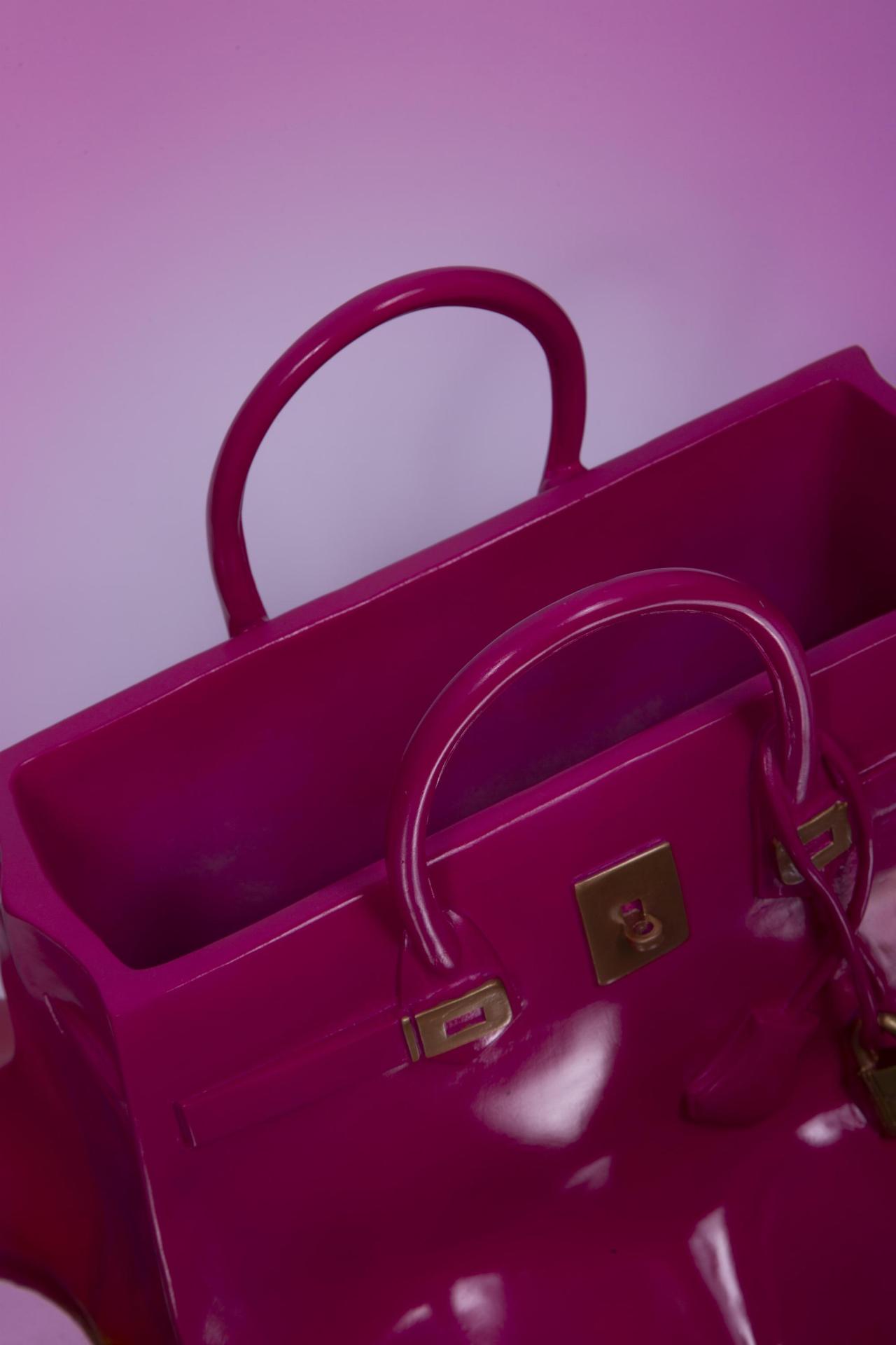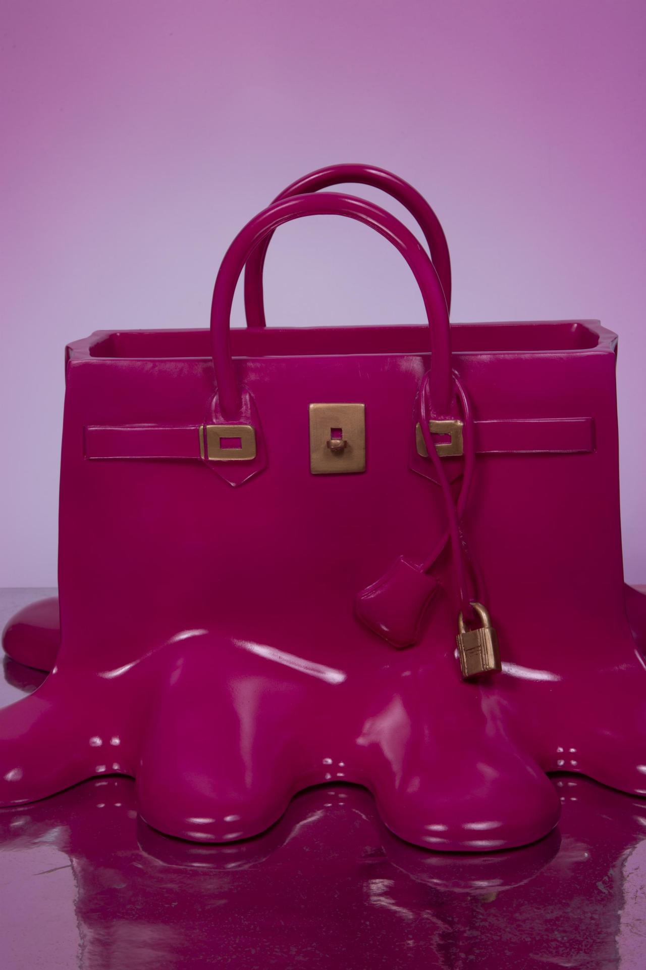 A bold pink ceramic vase shaped like a luxury handbag melting into a glossy puddle.