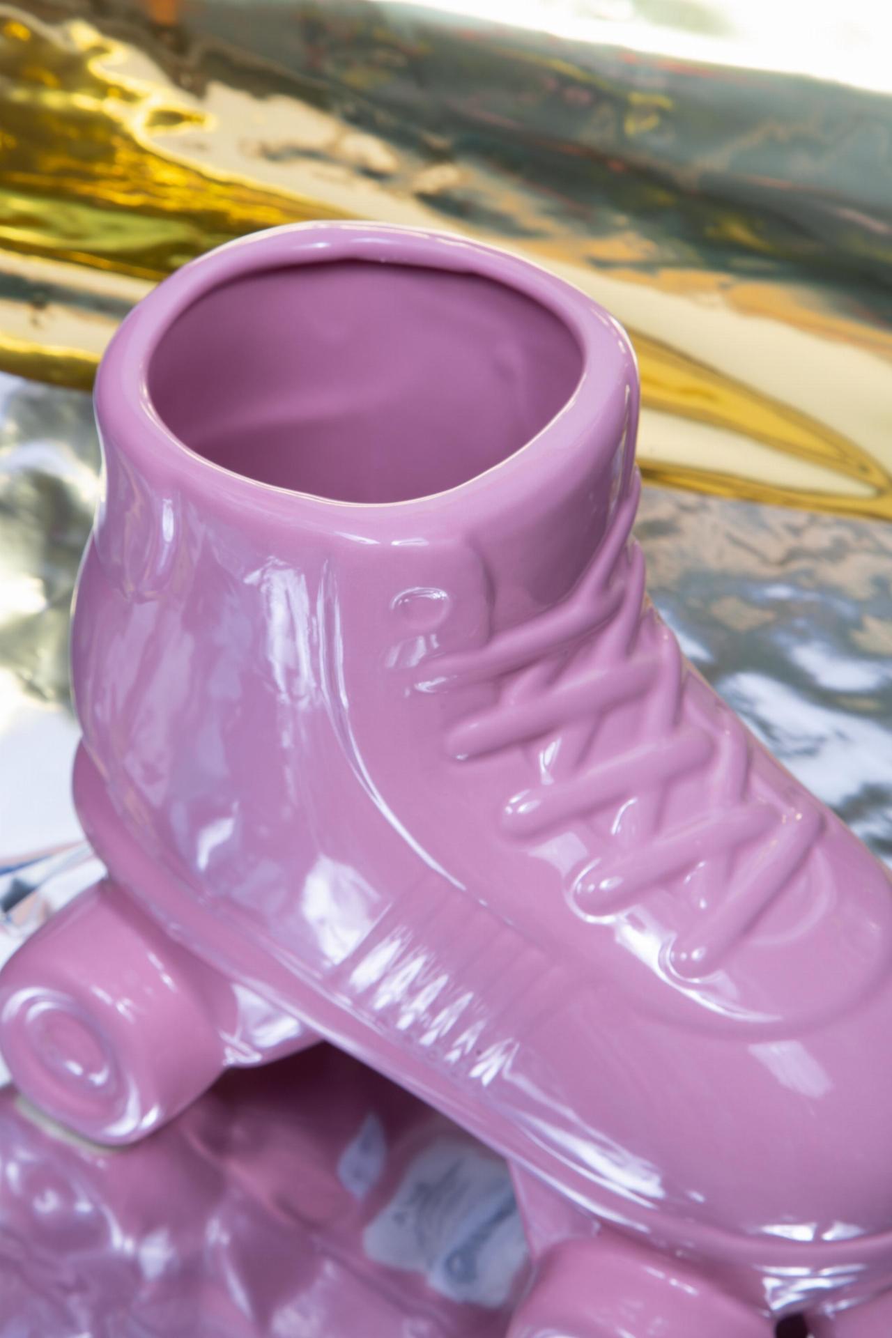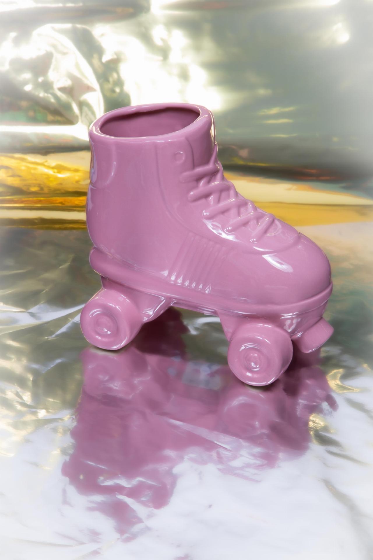 A glossy pink roller skate ceramic vase that brings retro charm and playful style to any room.