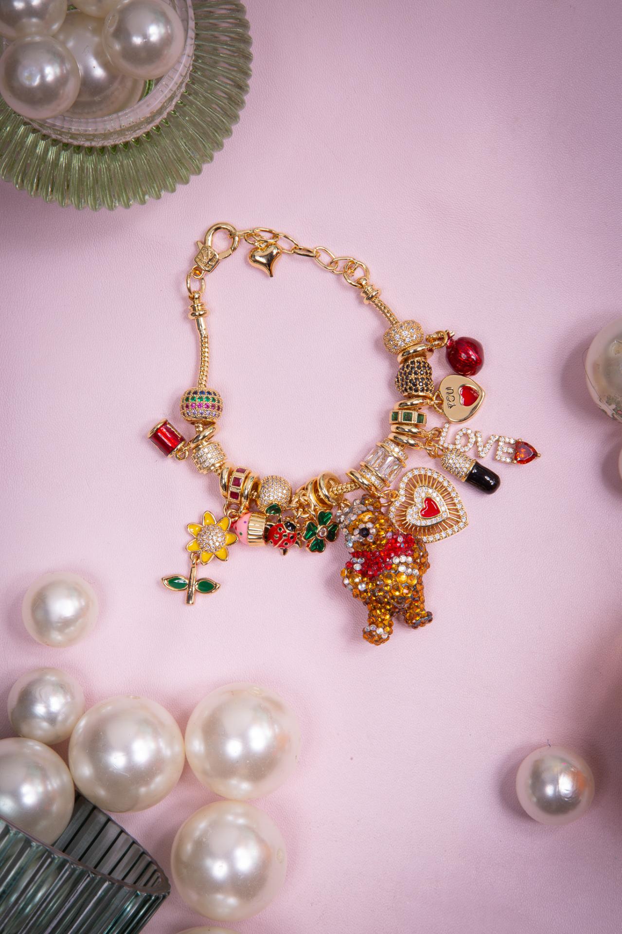 At its center shines a crystal-encrusted teddy bear charm in amber, ruby red, and white tones, surrounded by meaningful charms including pavé “LOVE,” enamel hearts, lipstick and perfume motifs, a sunflower, a ladybug, a clover, and shimmering red glass accents. Cut-crystal barrels and glossy beaded details add movement, shine, and texture.