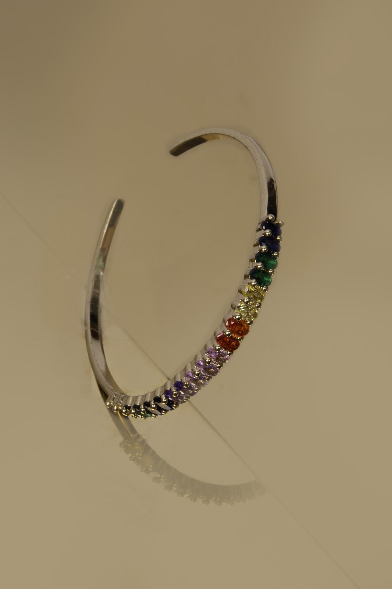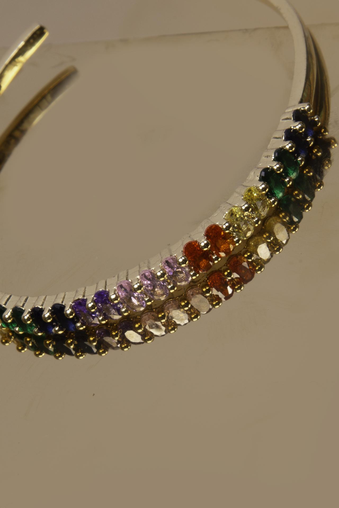 A dazzling, one-of-a-kind piece, this rainbow bangle is pure luxury and color in motion. Set on a polished gold-tone metal base, it features a vivid gradient of square-cut multicolored stones emerald, sapphire, ruby, amethyst, citrine framed by two rows of micro clear crystals for maximum brilliance from every angle.