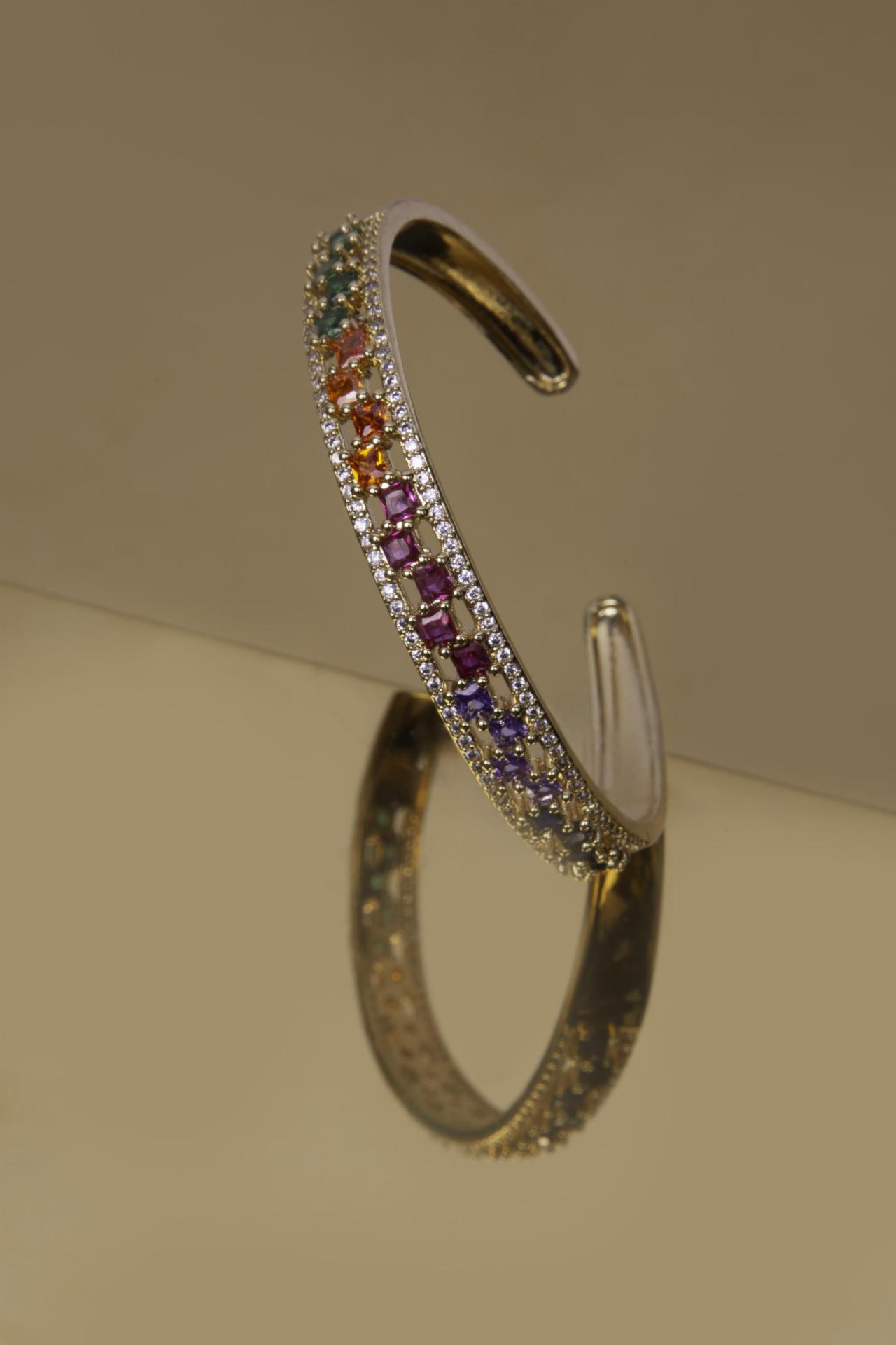Materials: Polished gold-tone metal, multicolored square-cut cubic zirconia gemstones, micro pave clear rhinestones, hinged cuff or open adjustable bangle