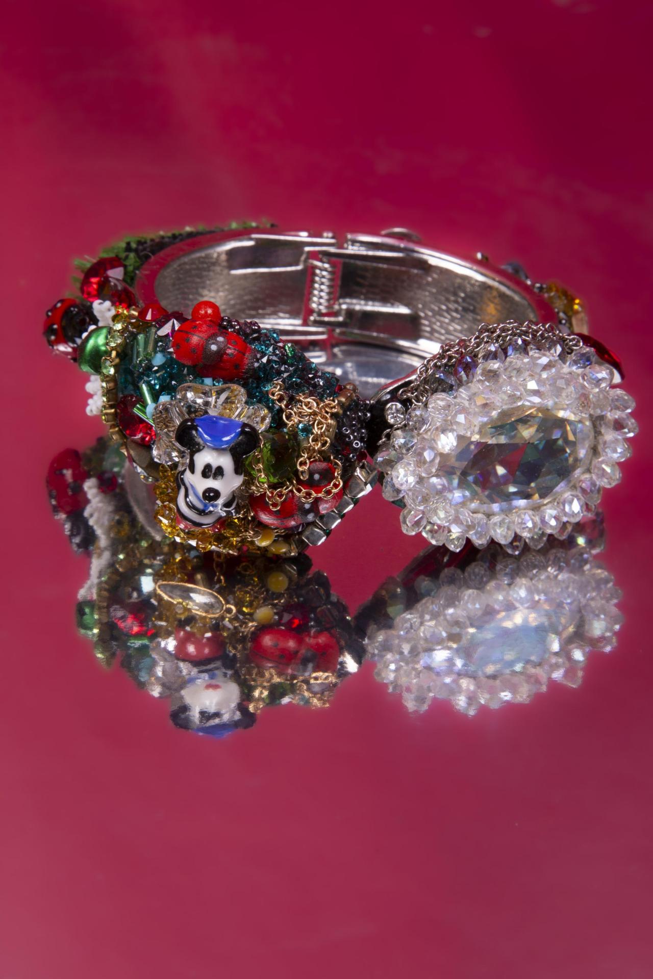 Materials: Authentic upcycled Mickey Mouse charm, 18K gold-plated stainless steel cuff, crystals, glass beads, enamel charms, rhinestones, chain accents