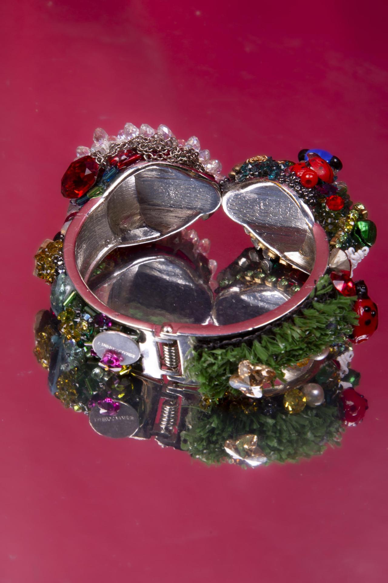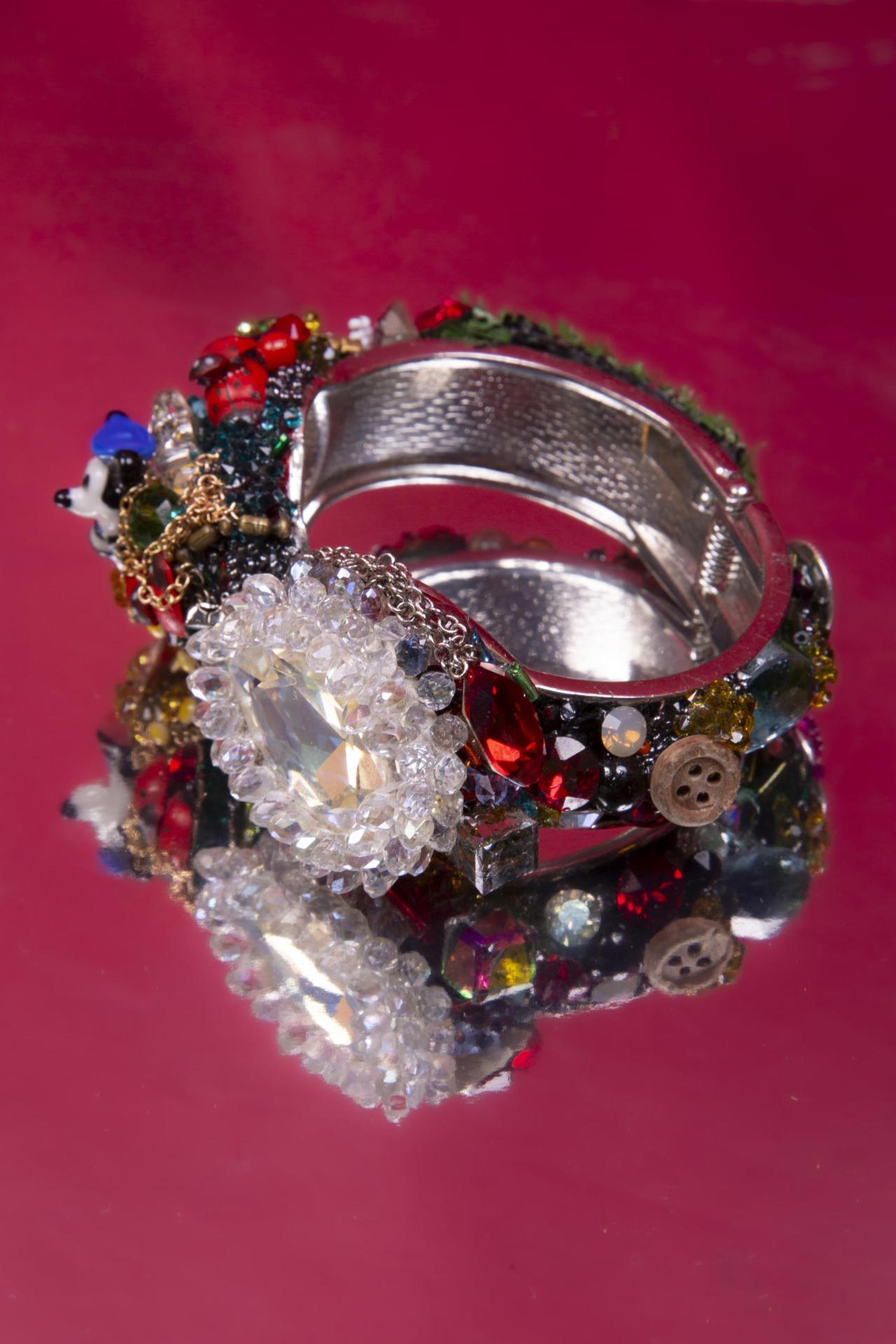 A one-of-a-kind couture piece, this statement bracelet features an authentic upcycled Mickey Mouse charm surrounded by a vivid mix of ruby crystals, emerald beads, miniature ladybugs, enamel accents, and gold detailing. Every element is placed by hand to create a rich, sculptural, and highly textured design.