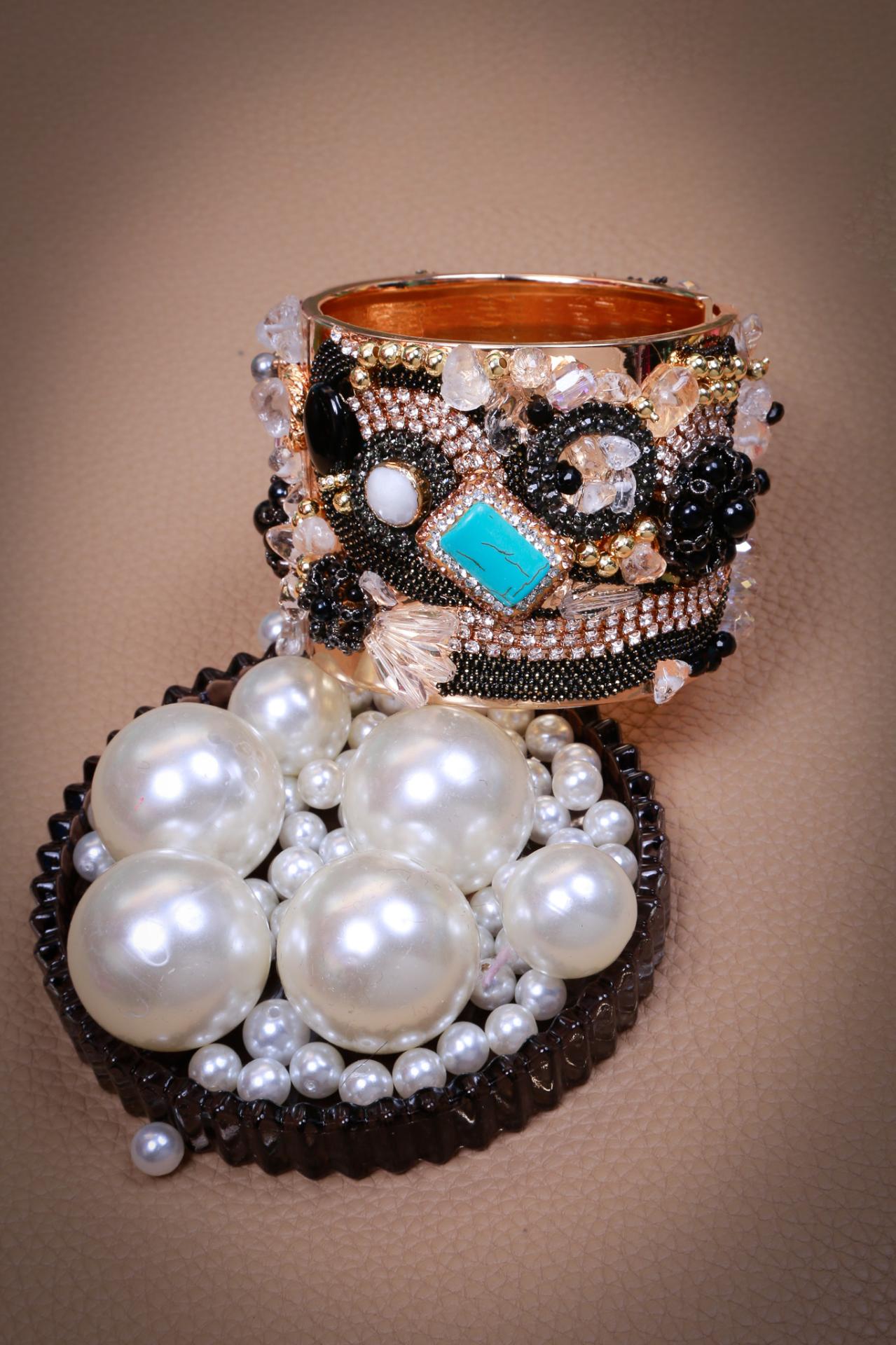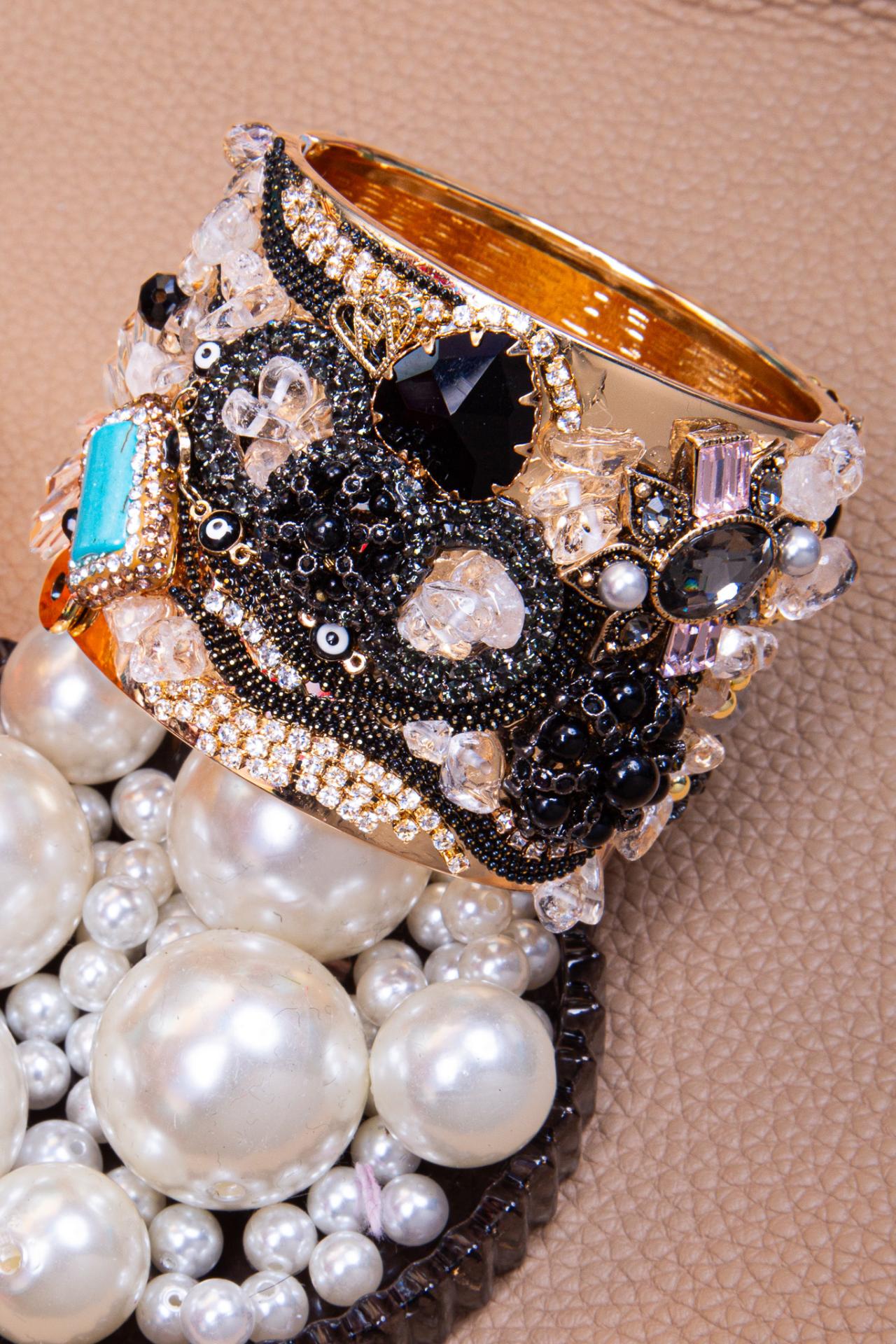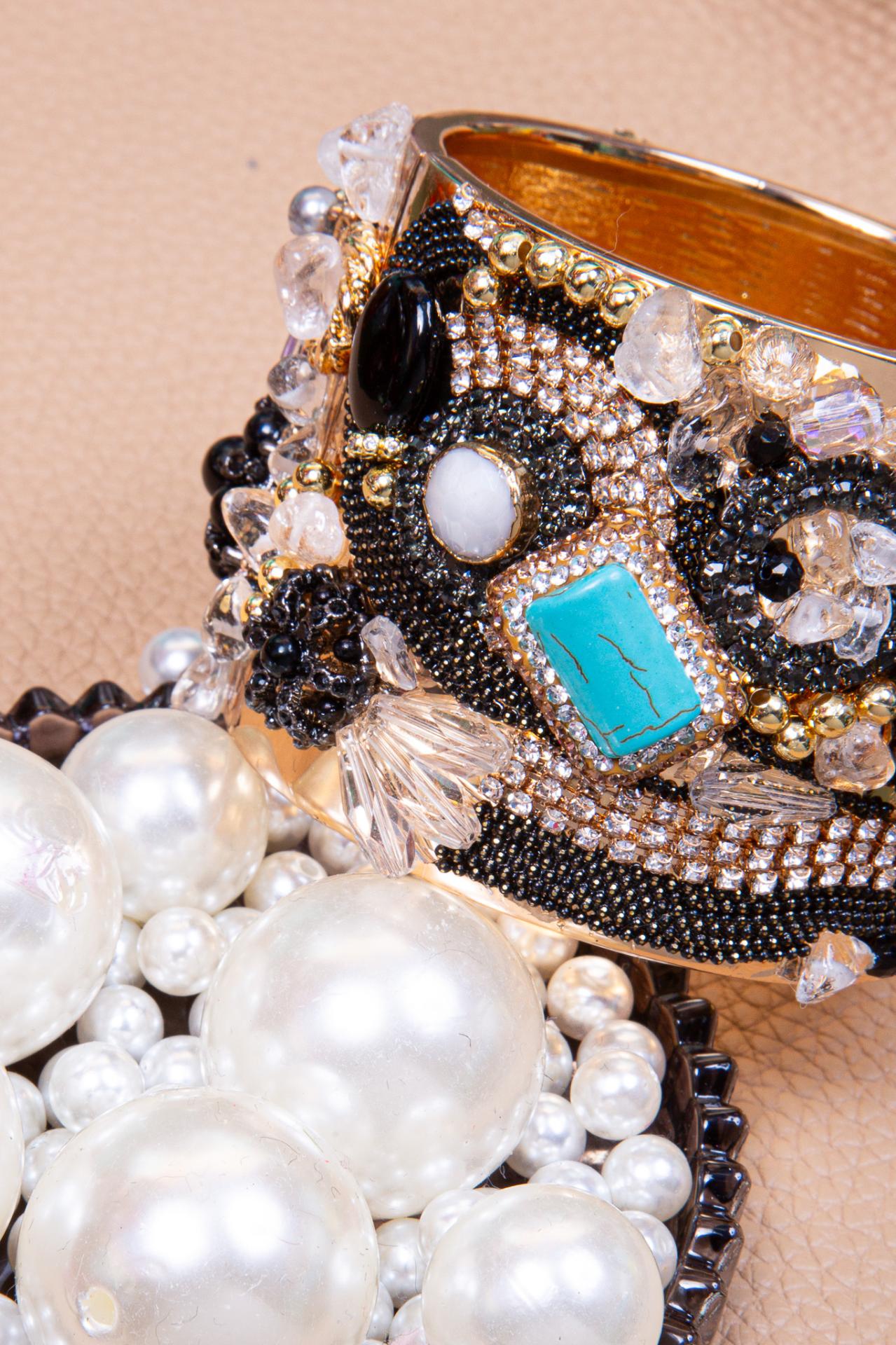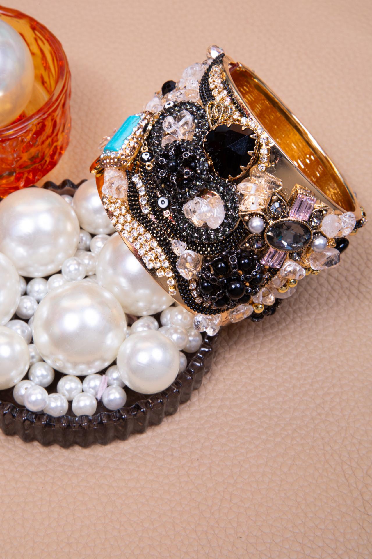 A striking arrangement of oversized black gems, textured crystal clusters, pearlescent accents, and gold metallic motifs creates a powerful, jewel-box effect. Every detail is hand-placed, giving the cuff a dimensional, couture quality that catches the light from every angle.