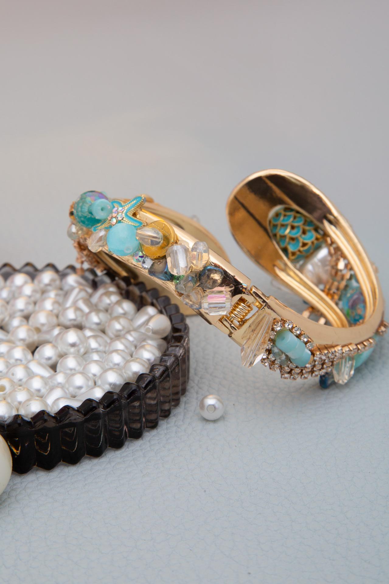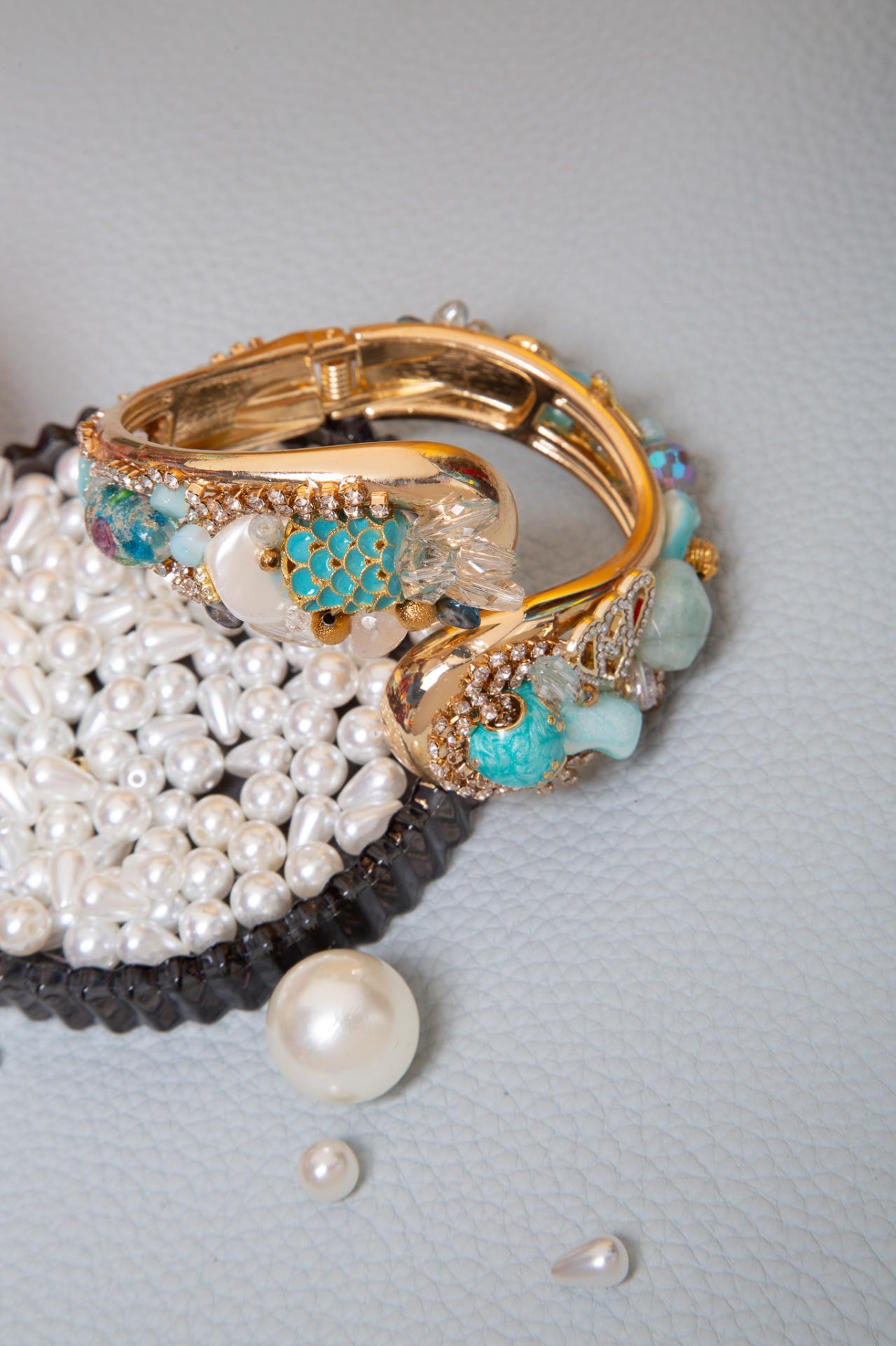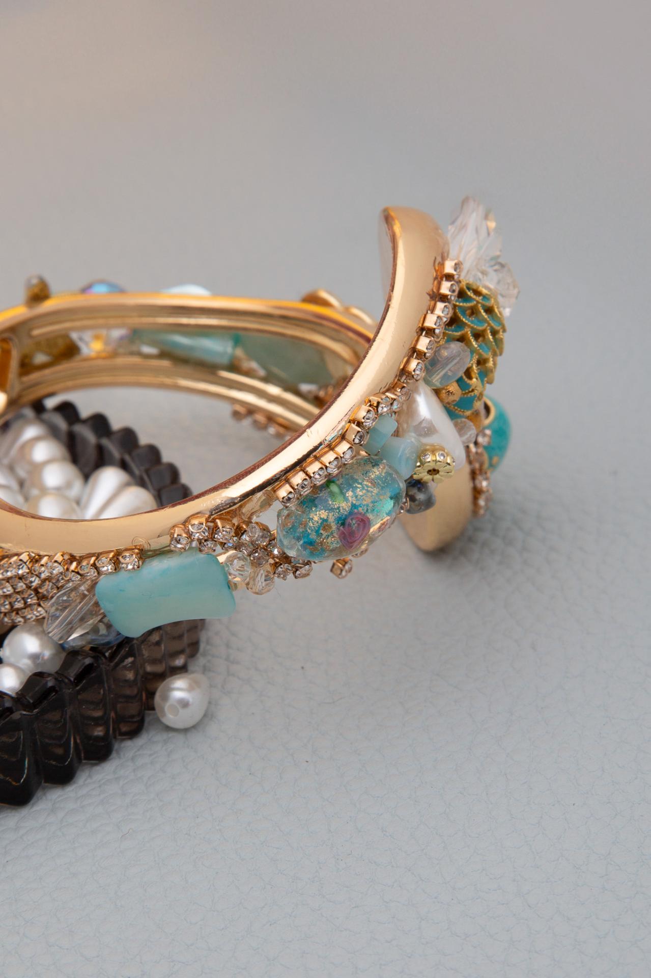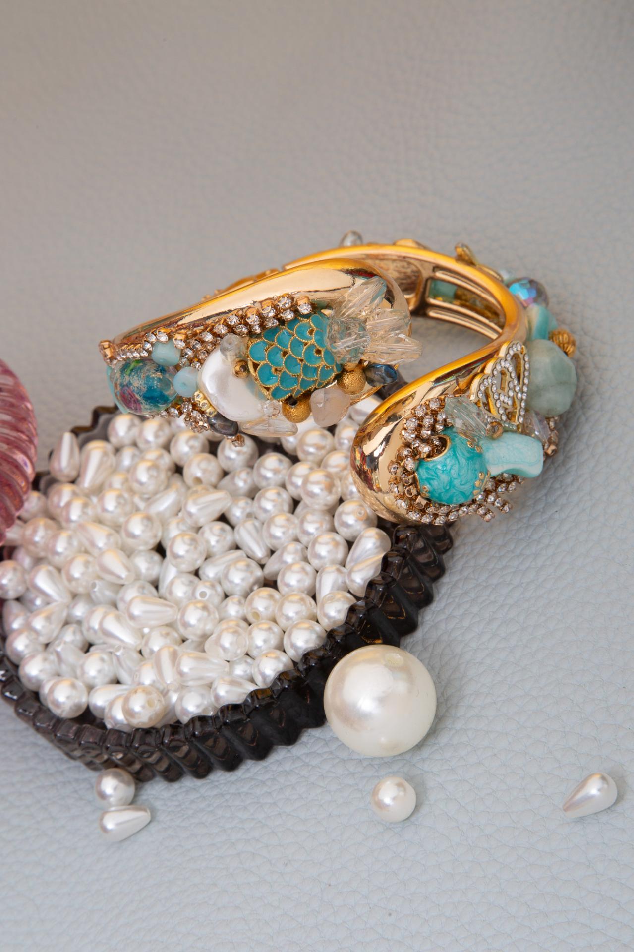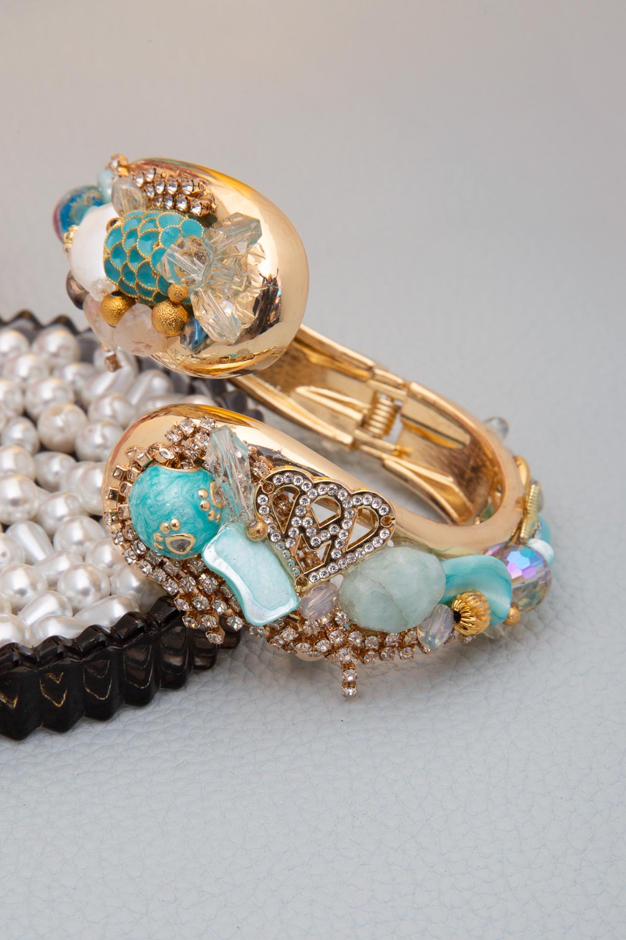 One side features a turquoise mermaid-scale bead paired with clear crystal petals that evoke sea-foam shimmer, while the opposite side showcases a vintage-style ceramic baby bootie, pale aqua gemstones, and iridescent glass accents arranged in an asymmetrical, artistic layout. Each cuff is handcrafted, making every piece one-of-a-kind.