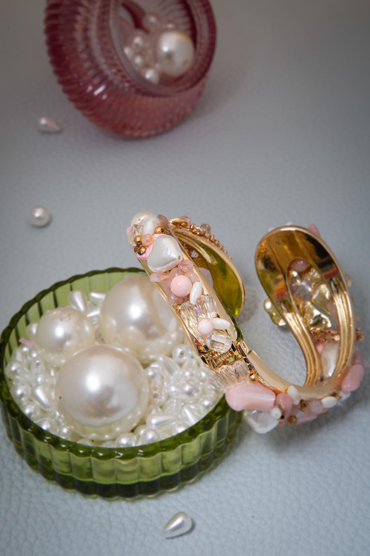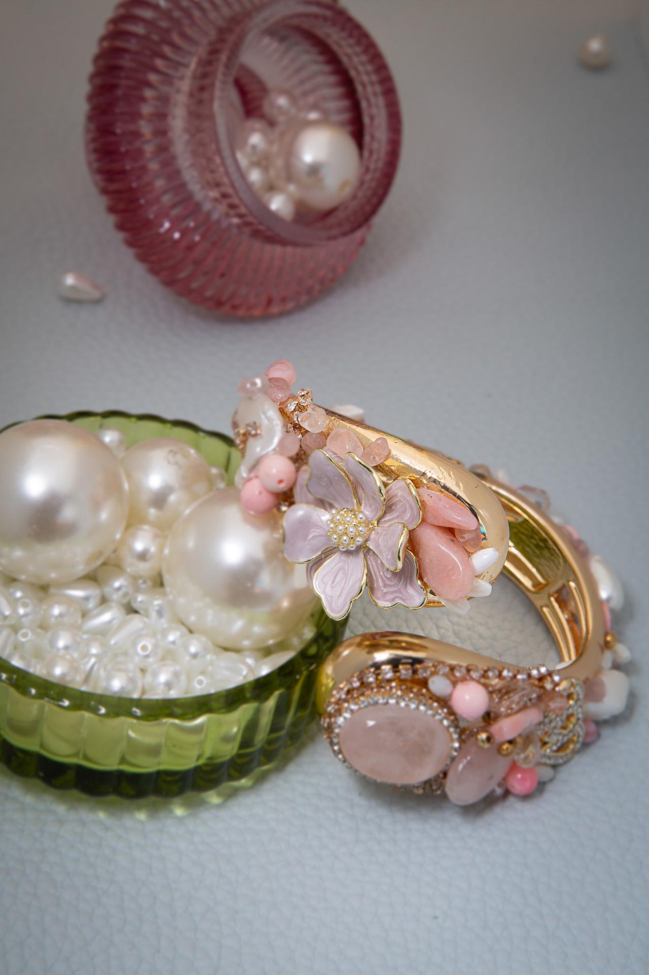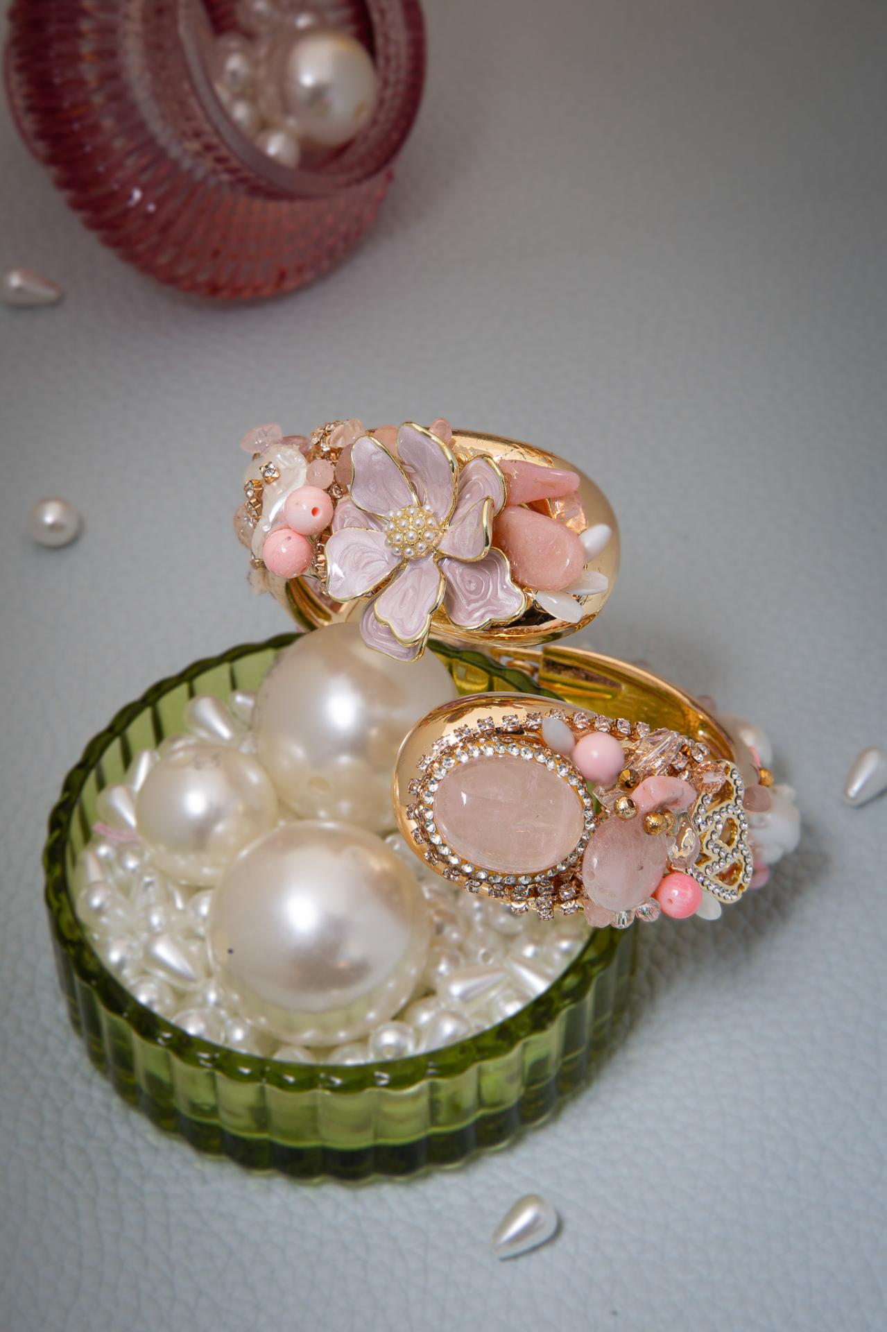 A romantic, garden-inspired cuff crafted in 18K gold-plated stainless steel, featuring rose quartz, pale coral, and a hand-enameled flower. This chunky hinged bracelet blends soft blush tones with sculptural gold for a feminine yet bold statement.