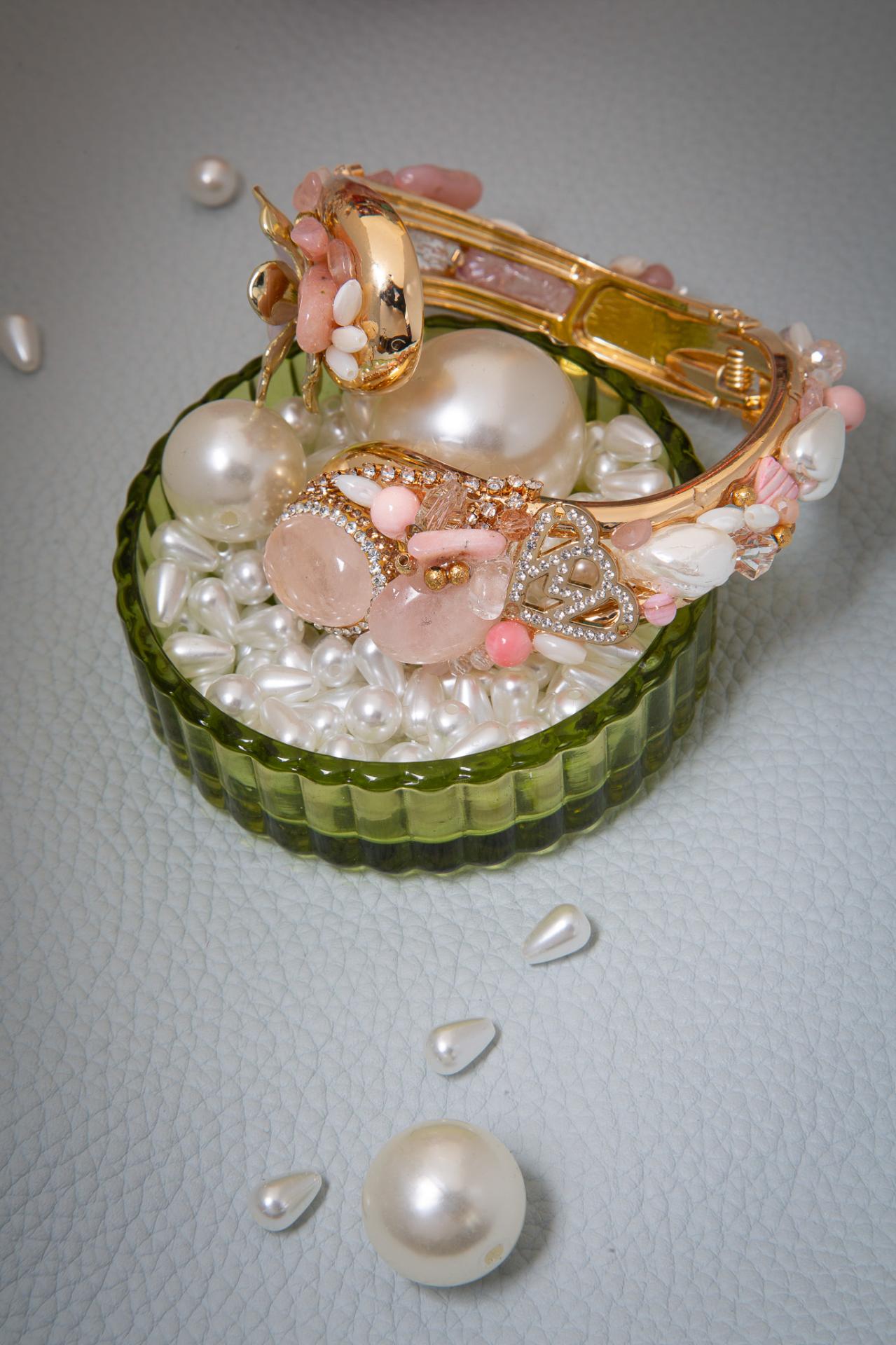 18K gold-plated stainless steel, resin, enamel, rose quartz, crystal, faux pearl