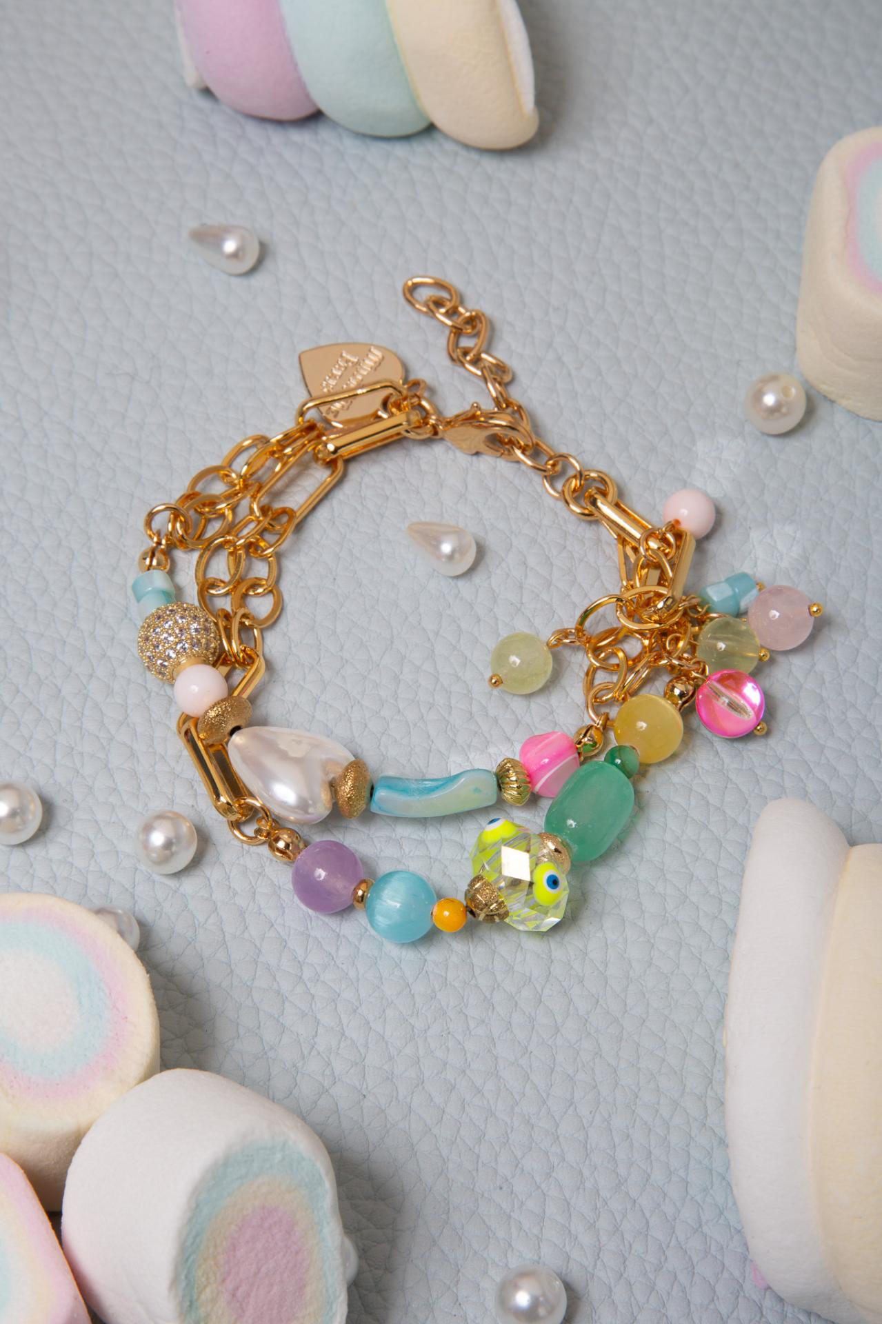 Bright, playful, and full of summer energy, the Pastel Pop Bracelet is crafted in 18K gold-plated stainless steel and assembled with real beads in soft sorbet hues. Its chunky yet elegant chain carries a mix of glass, resin, and gemstone beads in lavender, mint, bubblegum pink, citrus yellow, and sky blue, creating a joyful pastel flow.